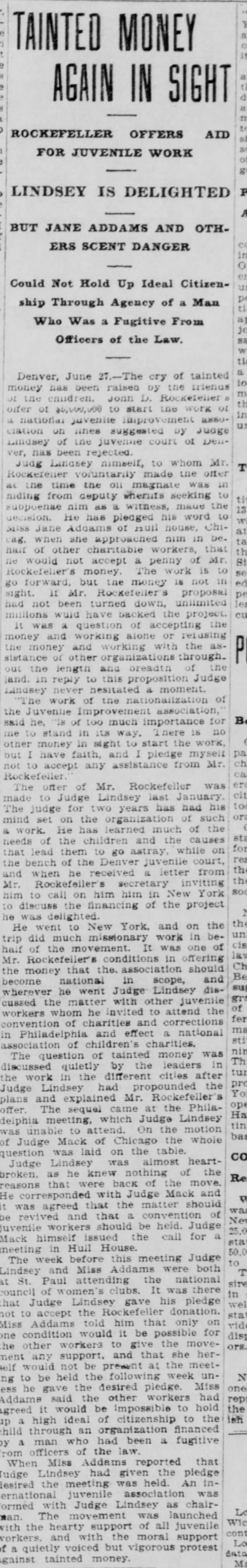 Judge Lindsey himself, to whom Mr. Rockefeller voluntarily made the offer at the time the oil magnate was in hiding from deputy sheriffs seeking to subpoena him as a witness, made the decision. He has pledged his word to Miss Jane Addams of the Hull House, Chicago, when she approached him in behalf of other charitable workers, that he would not accept a penny of Mr. Rockefeller's money. The work is to go forward, but the money is not in sight. If Mr. Rockefeller's proposal had not been turned down, unlimited millions would have backed the project.