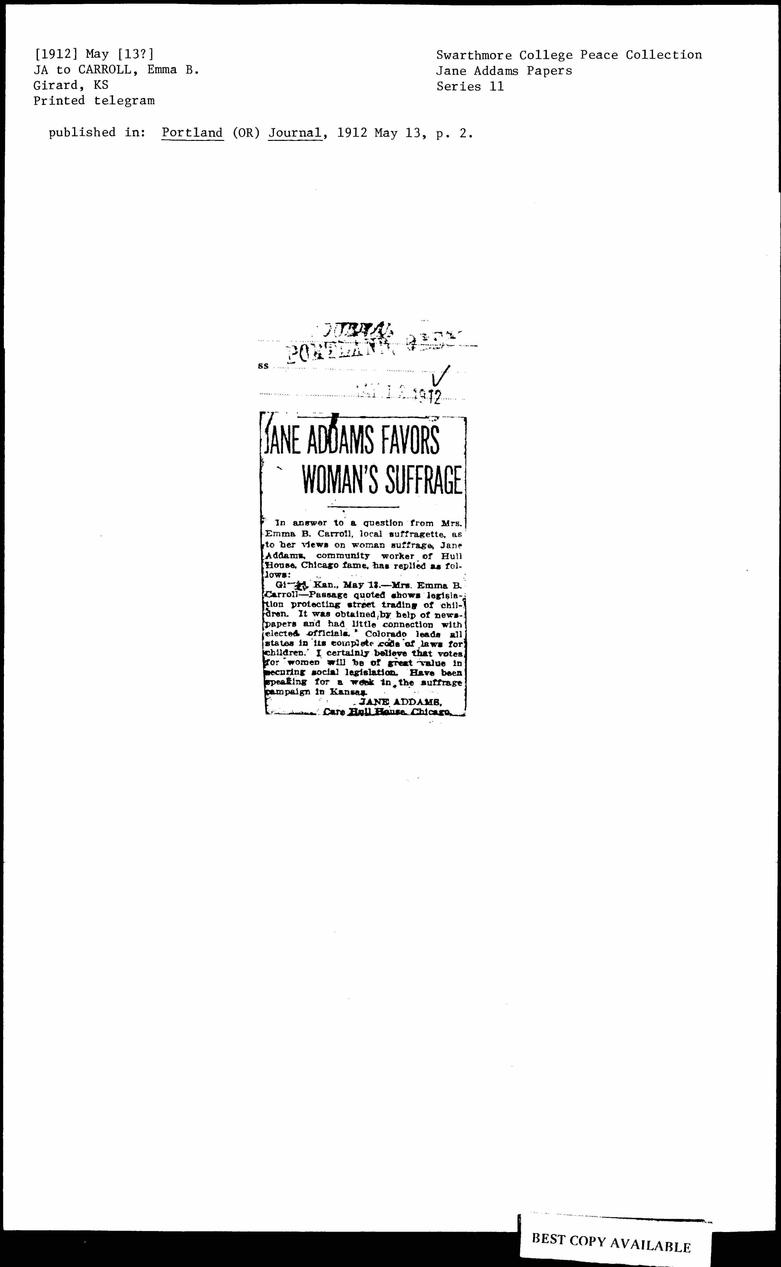 [Girard,] Kan., May 13 -- Mrs. Emma B. Carroll -- Passage quoted shows legislation protecting street trading of children. It was obtained by help of newspapers and had little connection with elected officials. Colorado leads all states in its complete code of laws for children. I certainly believe that votes for women will be of great value in securing social legislation. Have been speaking for a week in the suffrage campaign in Kansas.