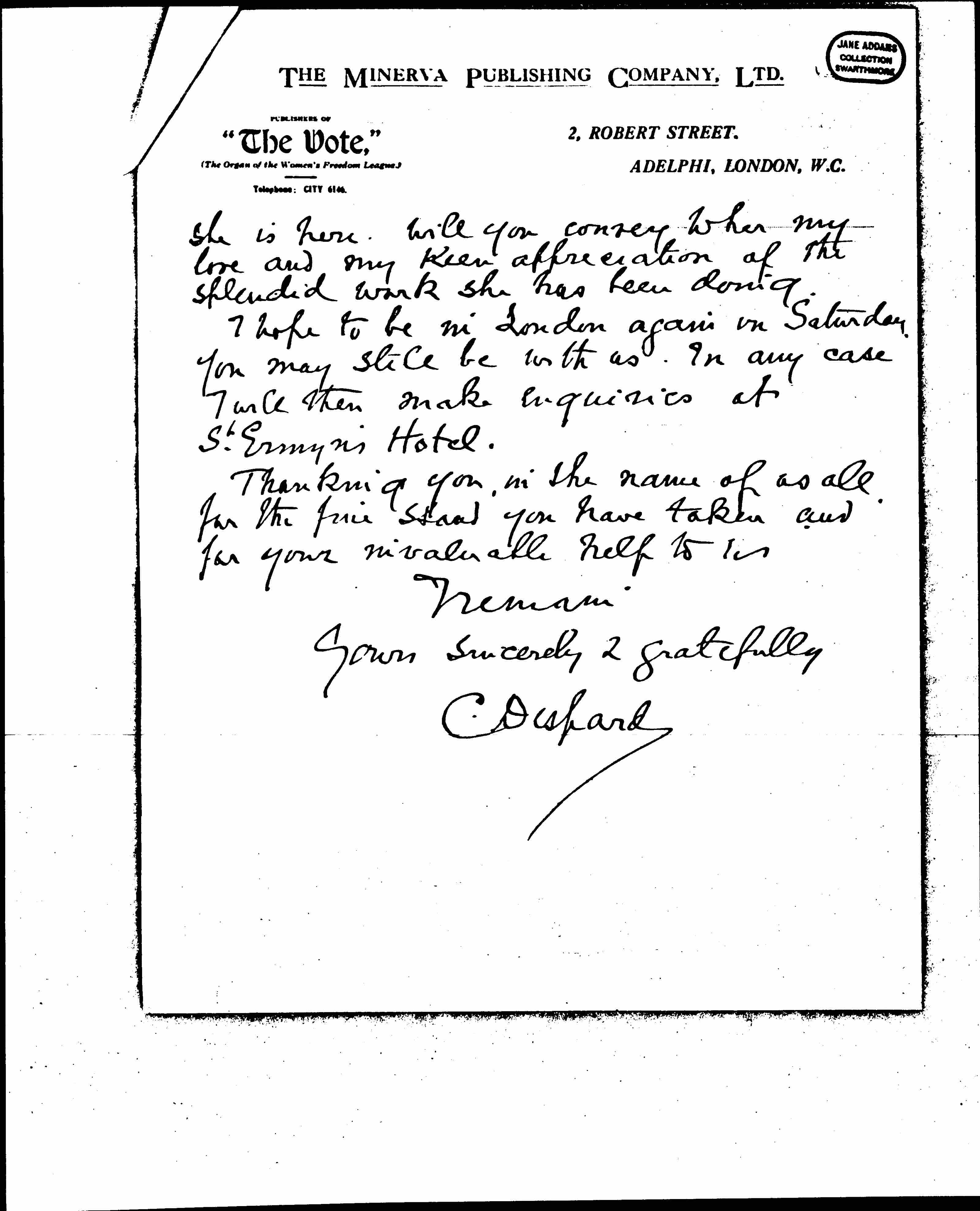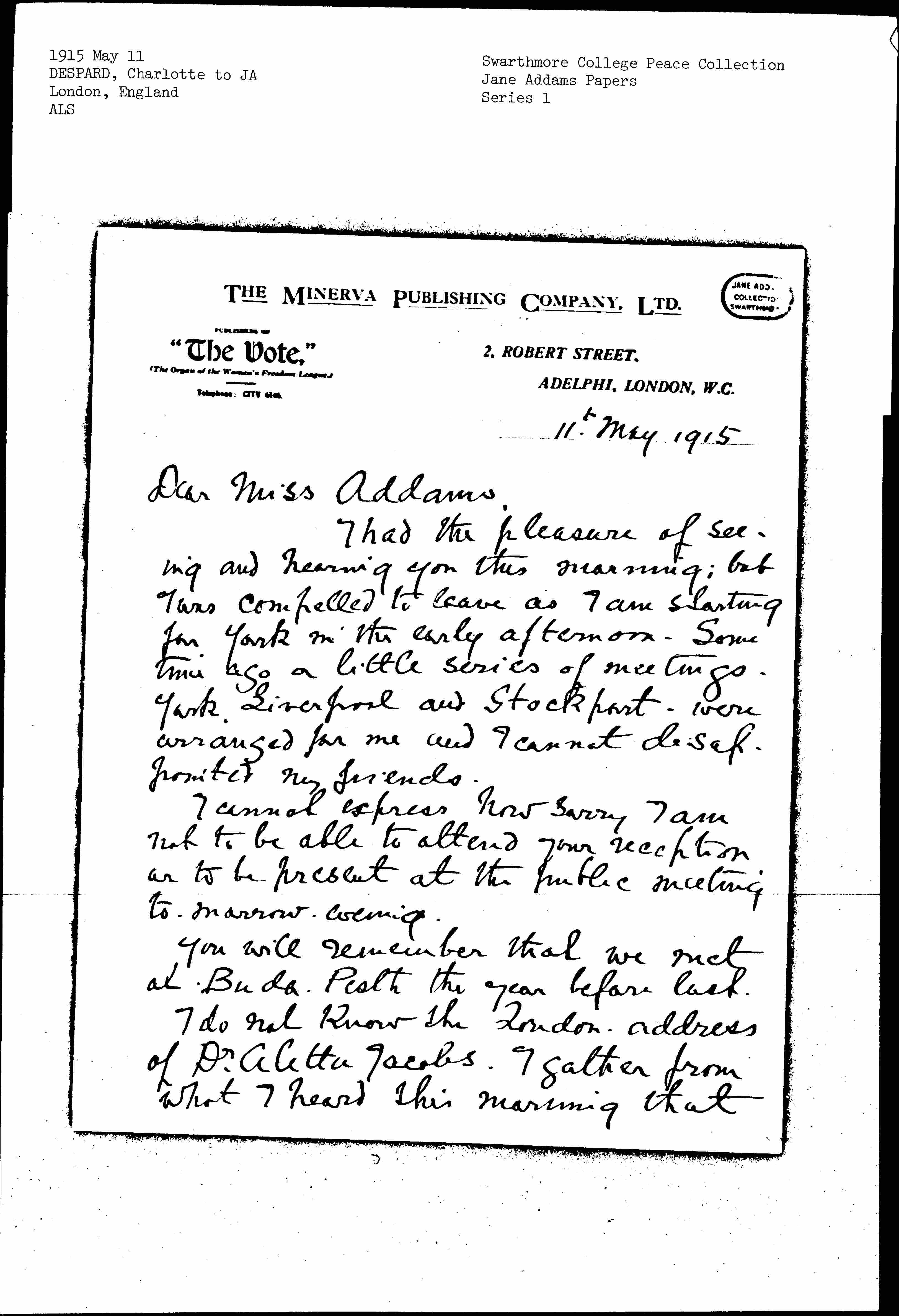 I do not know the London address of Dr Aletta Jacobs. I gather from what I heard this morning that [page 2] she is here. Will you convey to her my love and my keen appreciation of the splendid work she has been doing.