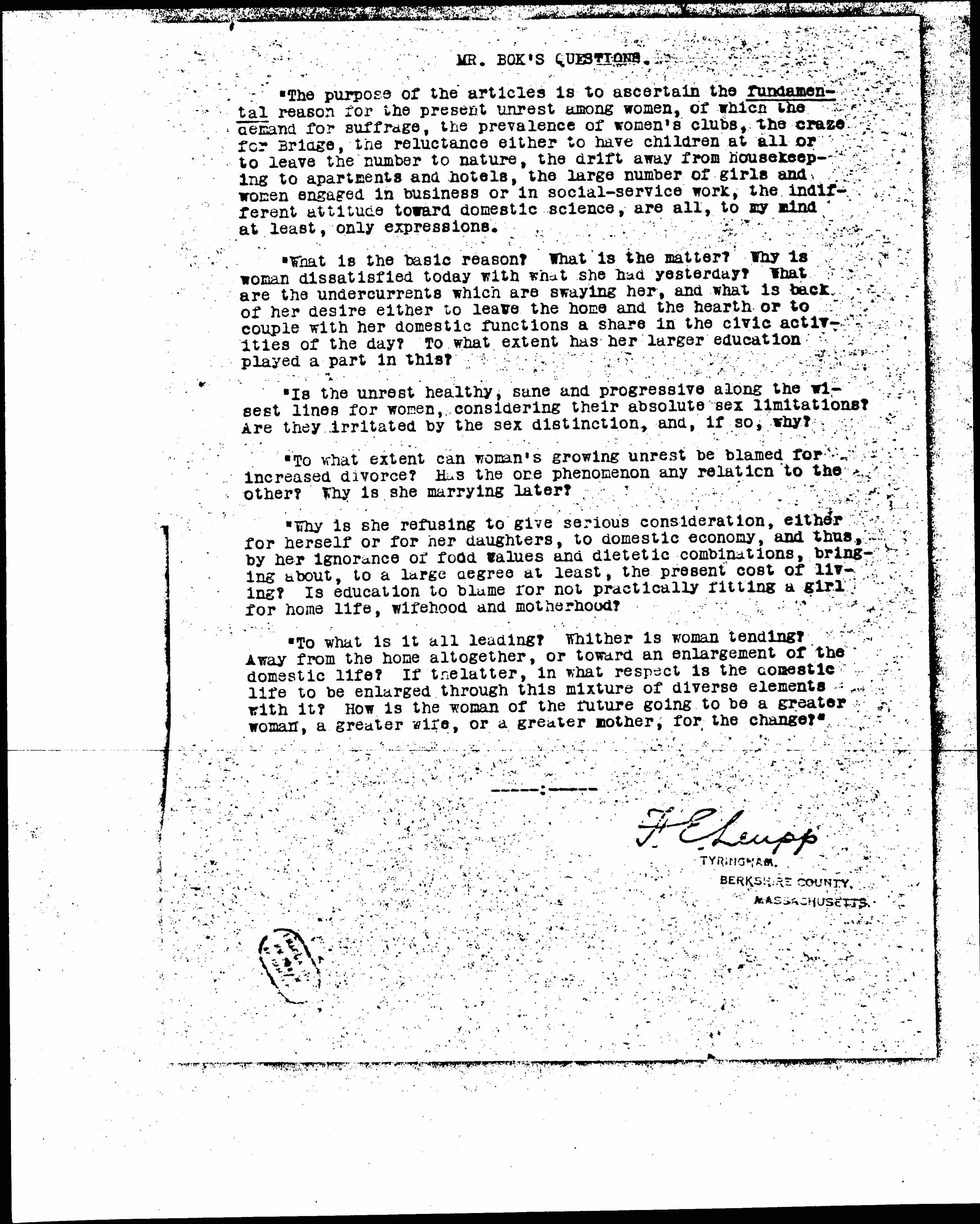 MR. BOK'S QUESTIONS.