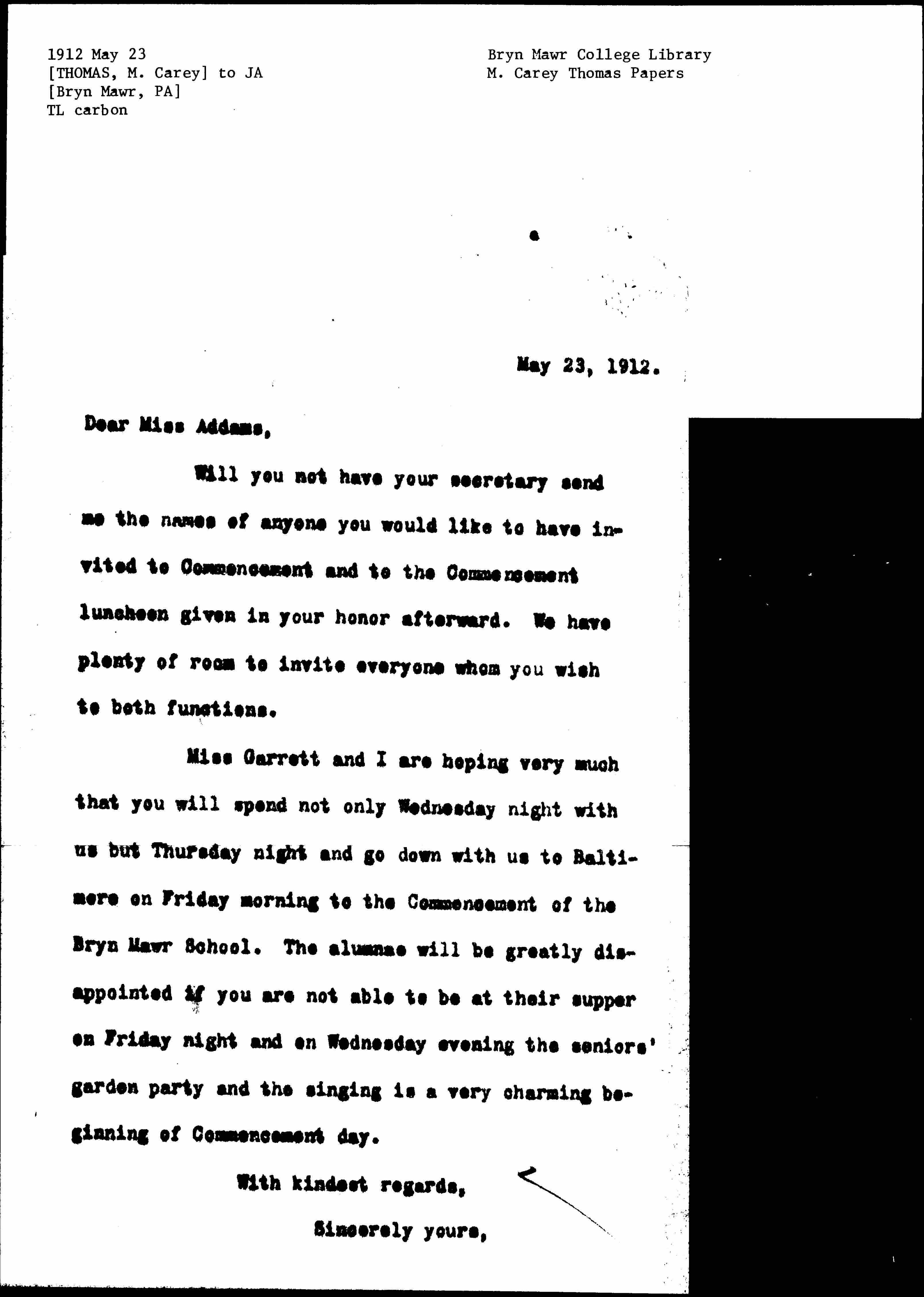 Miss Garrett and I are hoping very much that you will spend not only Wednesday night with us but Thursday night and go down with us to Baltimore on Friday morning to the Commencement of the Bryn Mawr School. The alumnae will be greatly disappointed if you are not able to be at their supper on Friday night and on Wednesday evening the seniors' garden party and the singing is a very charming beginning of Commencement day.