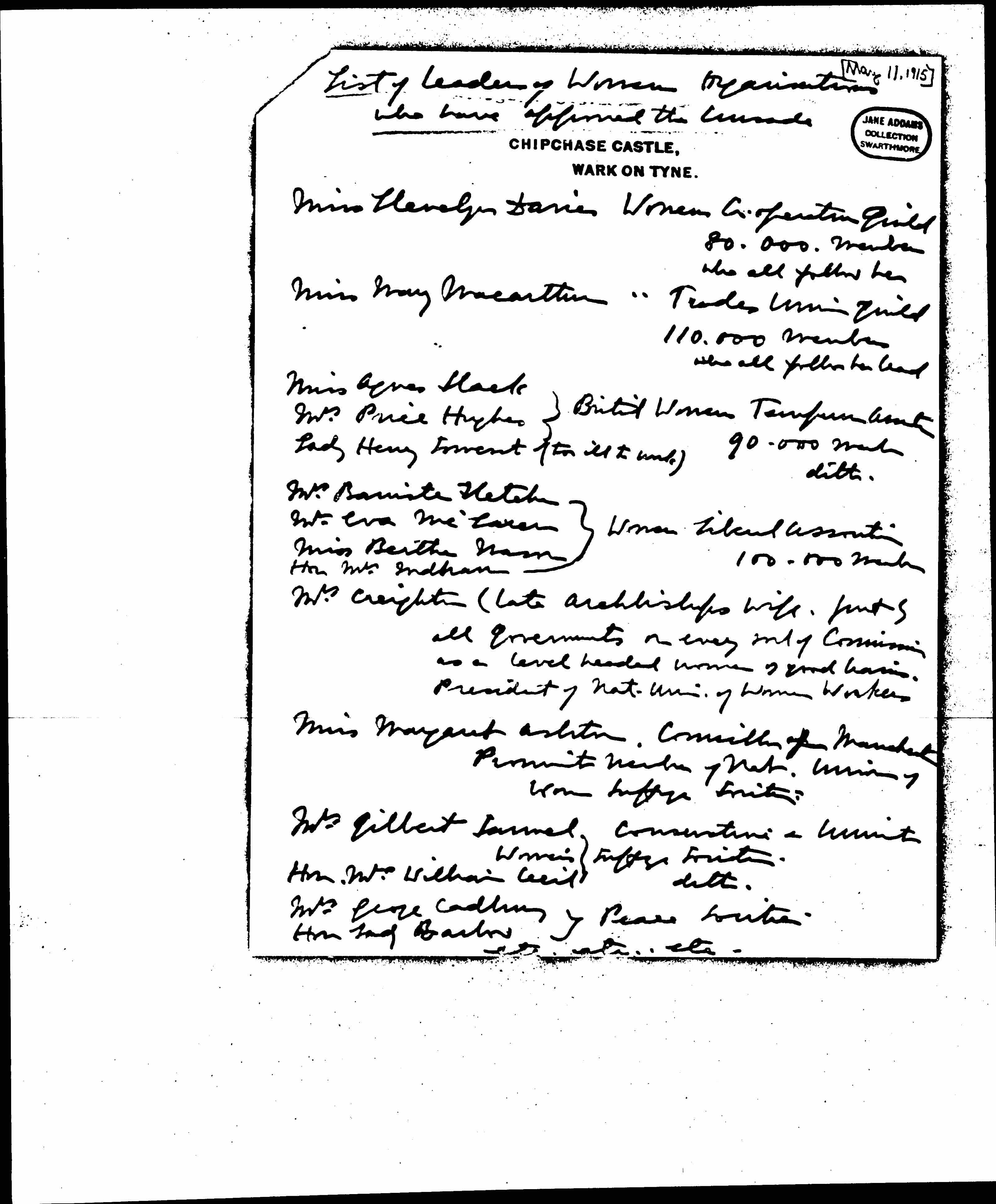| Miss Mary Macarthur | [Women] Trades Union Guild 110,000 members who all follow her lead |