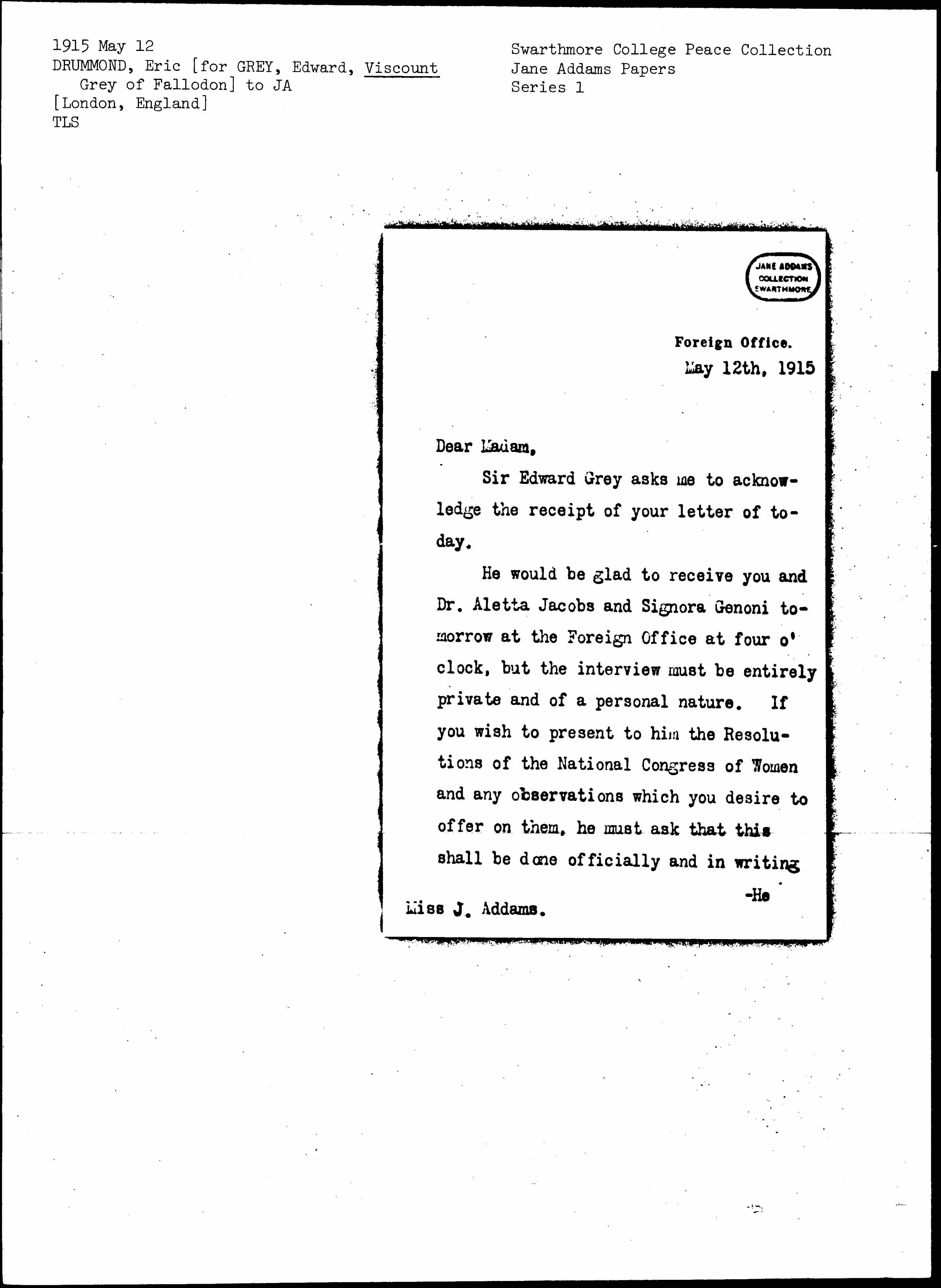 He would be glad to receive you and Dr. Aletta Jacobs and Signora Genoni tomorrow at the Foreign Office at four o'clock, but the interview must be entirely private and of a personal nature. If you wish to present to him the Resolutions of the National Congress of Women and any observations which you desire to offer on them, he must ask that this shall be done officially and in writing [page 2]