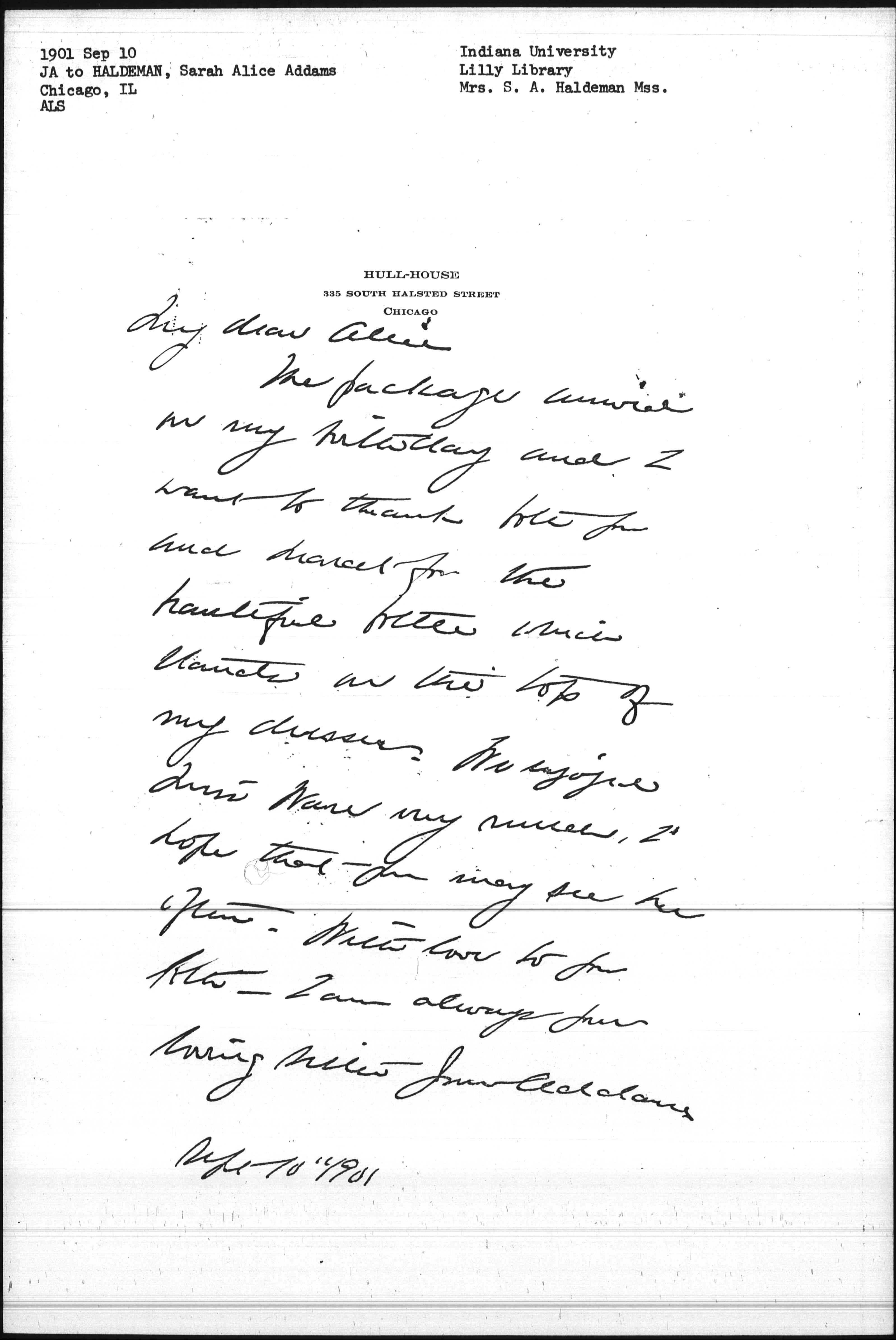 The package arrived on my birthday and I want to thank both you and Marcet for the beautiful bottle which stands on the top of my dresser. We enjoyed Miss Ware very much, I hope that you may see her often. With love to you both -- I am always your loving sister Jane Addams