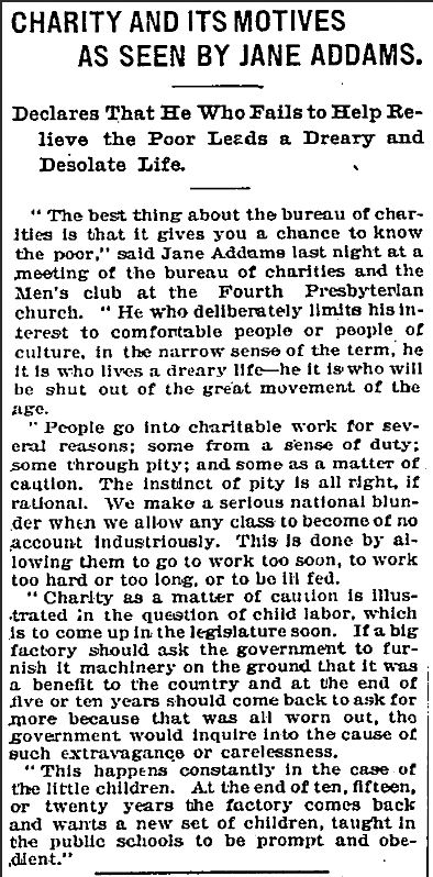 "The best thing about the bureau of charities is that it gives you a chance to know the poor," said Jane Addams last night at a meeting of the bureau of charities and the Men's club at the Fourth Presbyterian church. "He who deliberately limits his interest to comfortable people or people of culture, in the narrow sense of the term, he it is who lives a dreary life -- he it is who will be shut out of the great movement of the age.