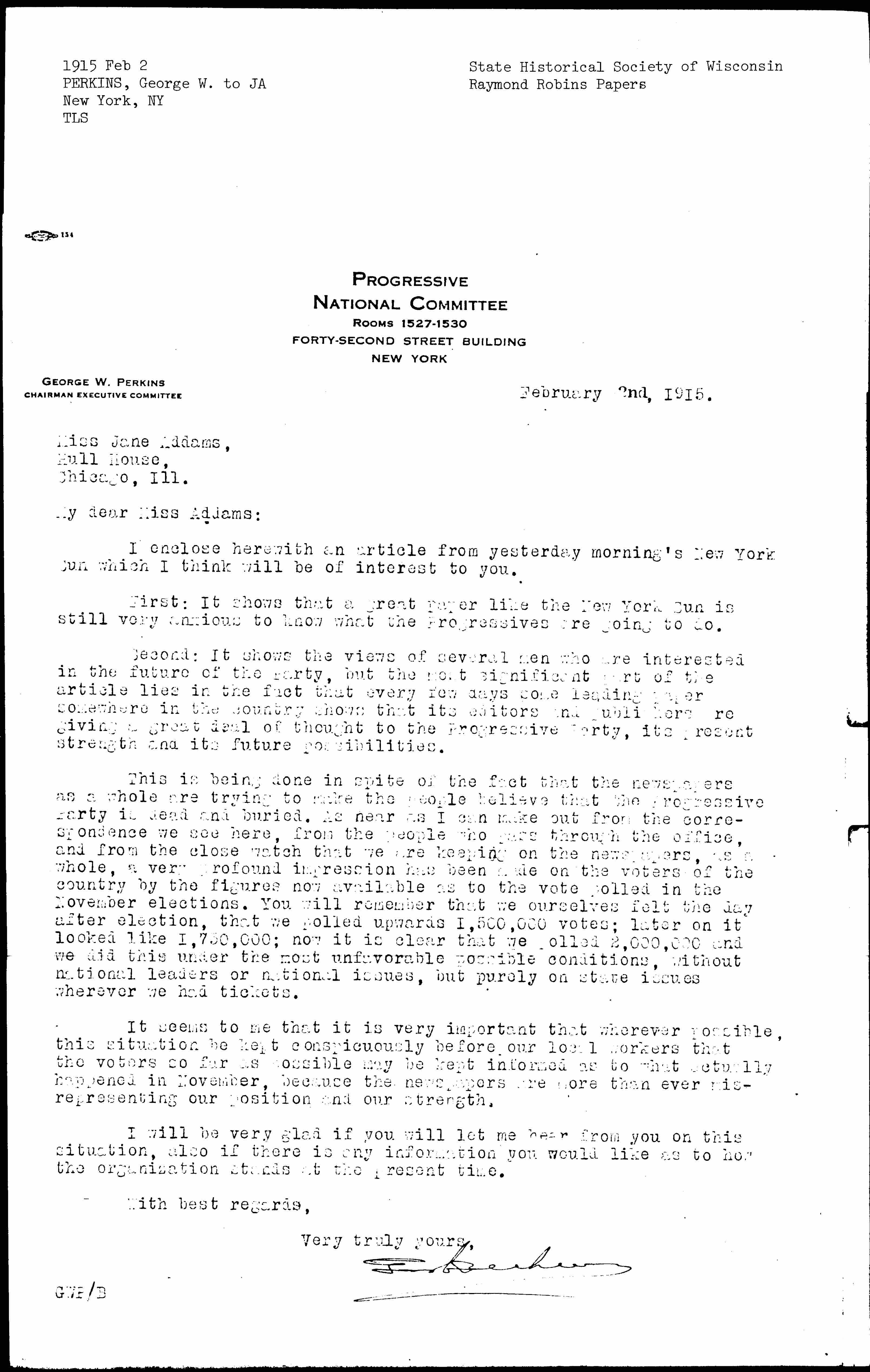 This is being done in spite of the fact that the newspapers as a whole are trying to make the people believe that the Progressive Party is dead and buried. As near as I can make out from the correspondence we see here, from the people who pass through the office, and from the close watch that we are keeping on the newspapers, as a whole, a very profound impression has been made on voters of the country by the figures now available as to the vote polled in the November elections. You will remember that we ourselves felt the day after election, that we polled upwards 1,500,000 votes; later on it looked like 1,730,000; now it is clear that we polled 2,000,000 and we did this under the most unfavorable possible conditions, without national leaders or national issues, but purely on state issues wherever we had tickets.