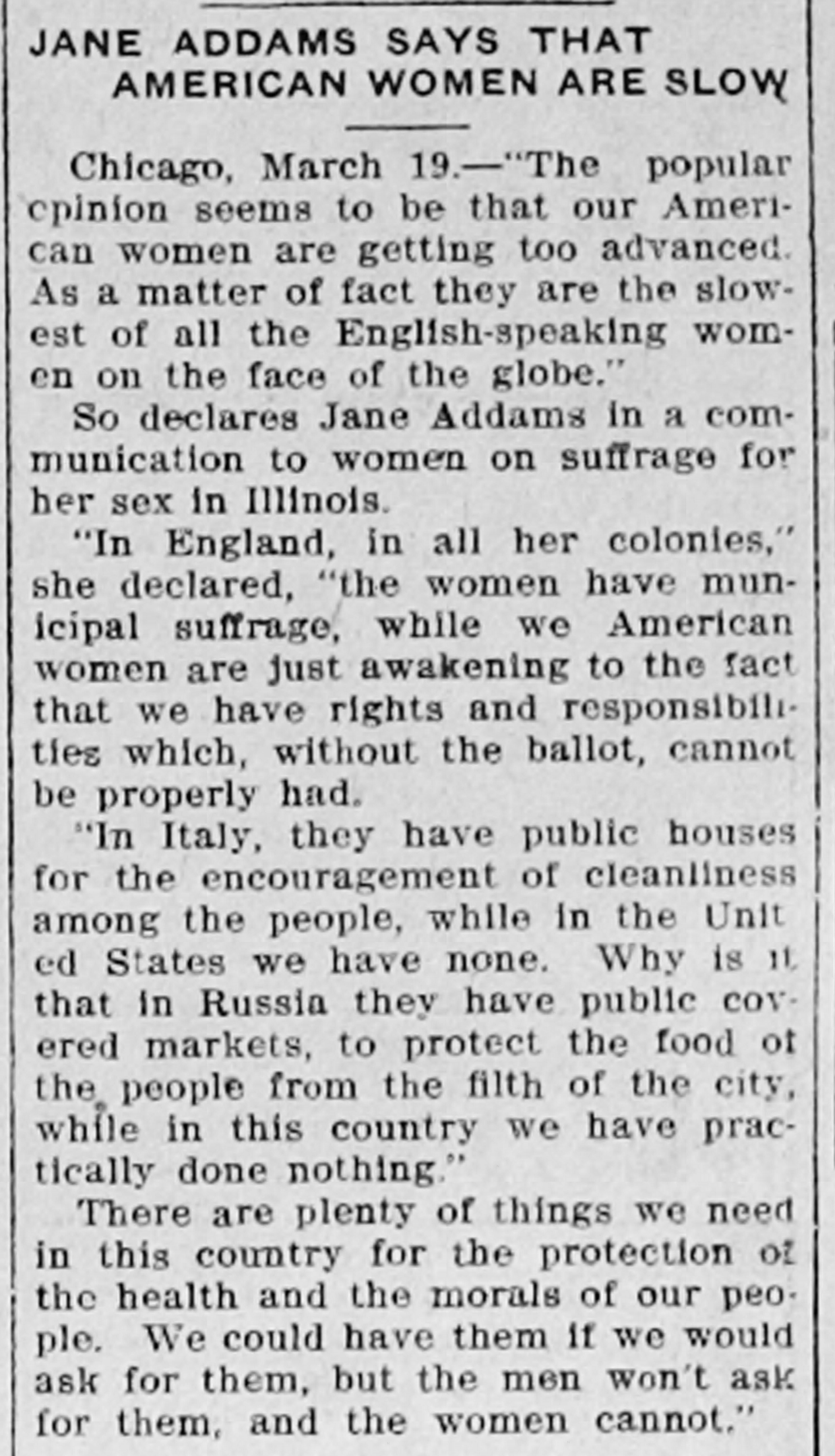 JANE ADDAMS SAYS THAT AMERICAN WOMEN ARE SLOW