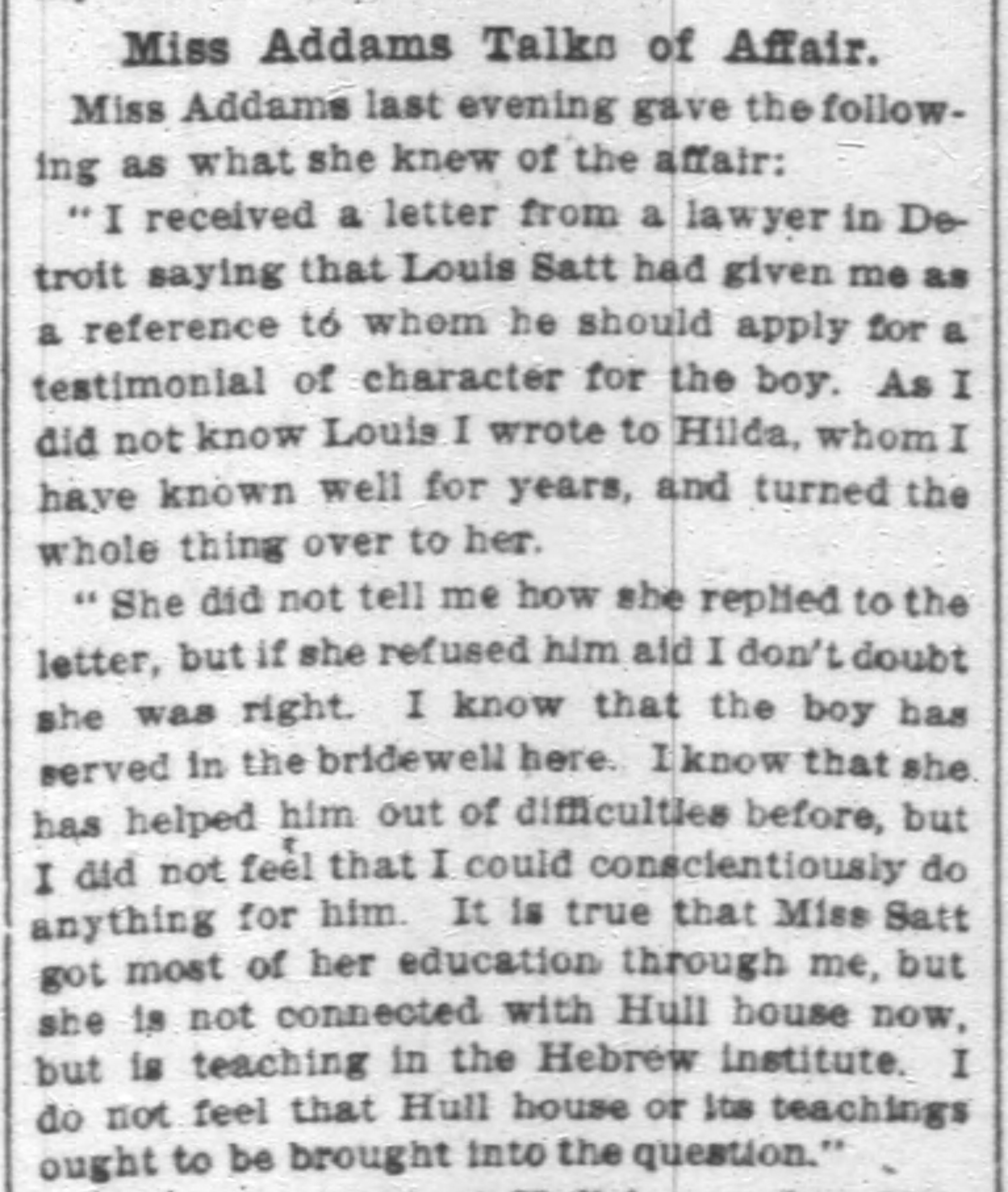 "She did not tell me how she replied to the letter, but if she refused him aid I don't doubt she was right. I know that the boy has served in the bridewell here. I know that she has helped him out of difficulties before, but I did not feel that I could conscientiously do anything for him. It is true that Miss Satt got most of her education through me, but she is not connected with Hull house now, but is teaching in the Hebrew institute. I do not feel that Hull house or its teachings out to be brought into the question."