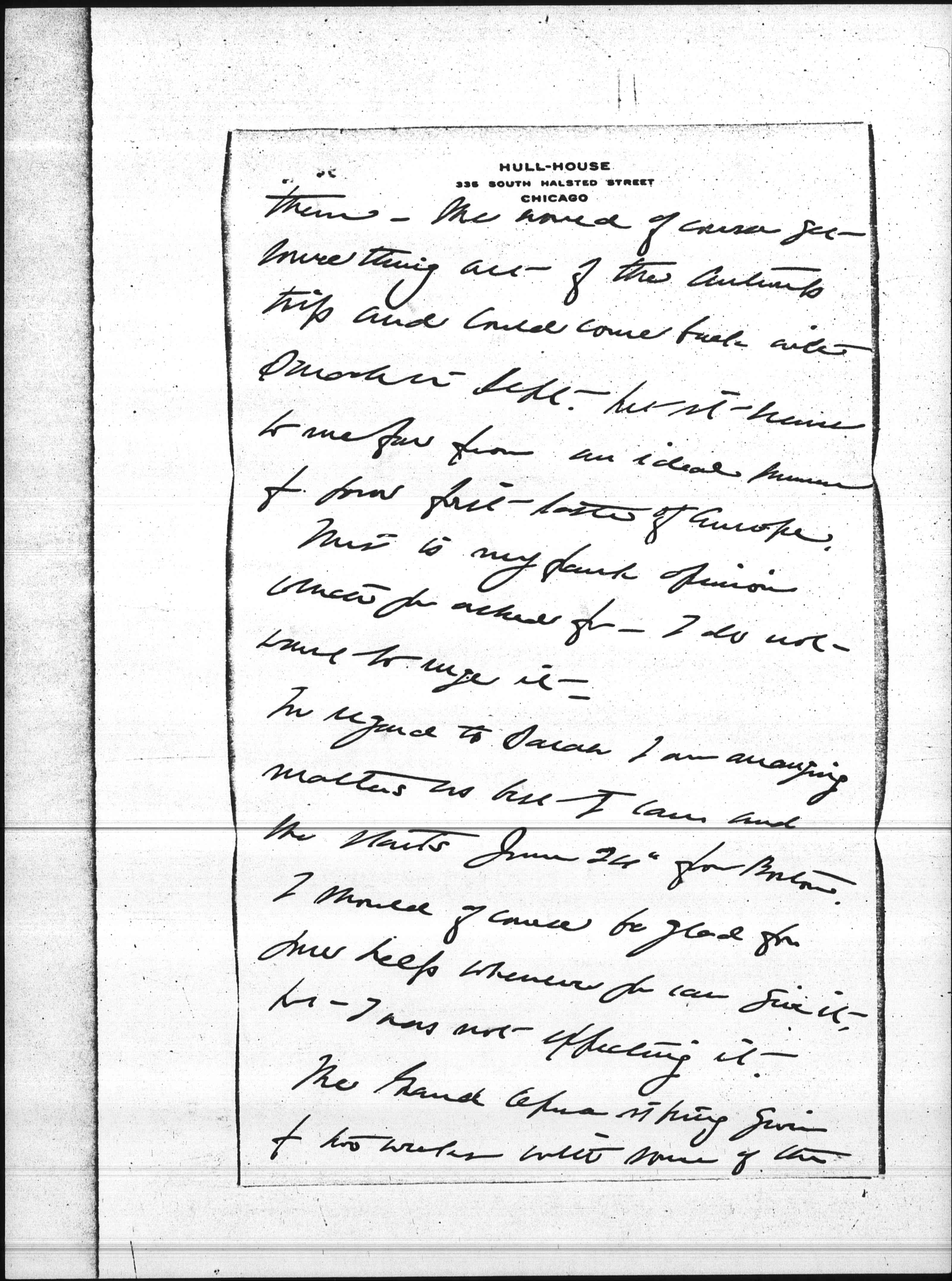 In regard to Sarah I am arranging matters as best I can and she starts June 24″ for Boston. I should of course be glad for your help whenever you can give it, but I was not expecting it.