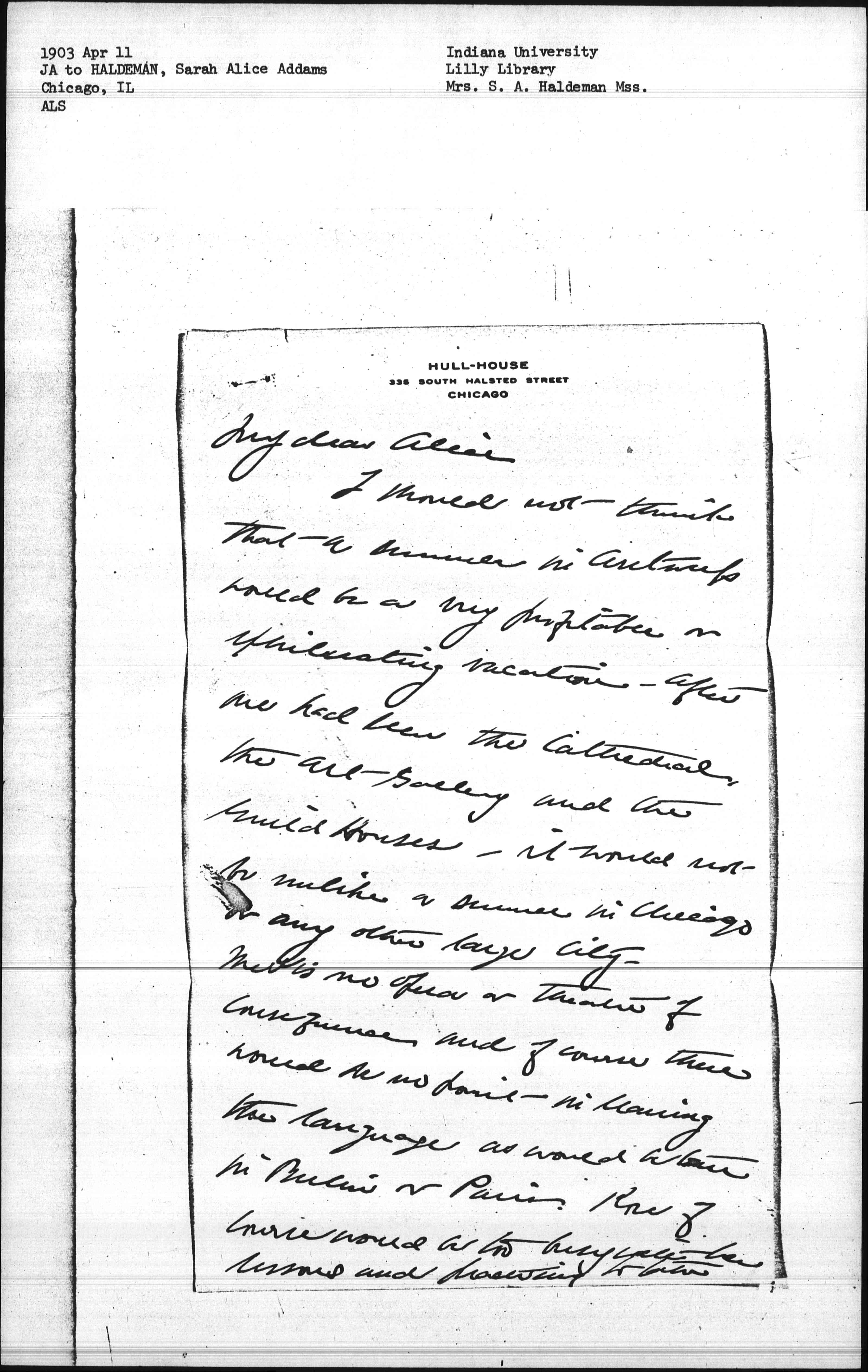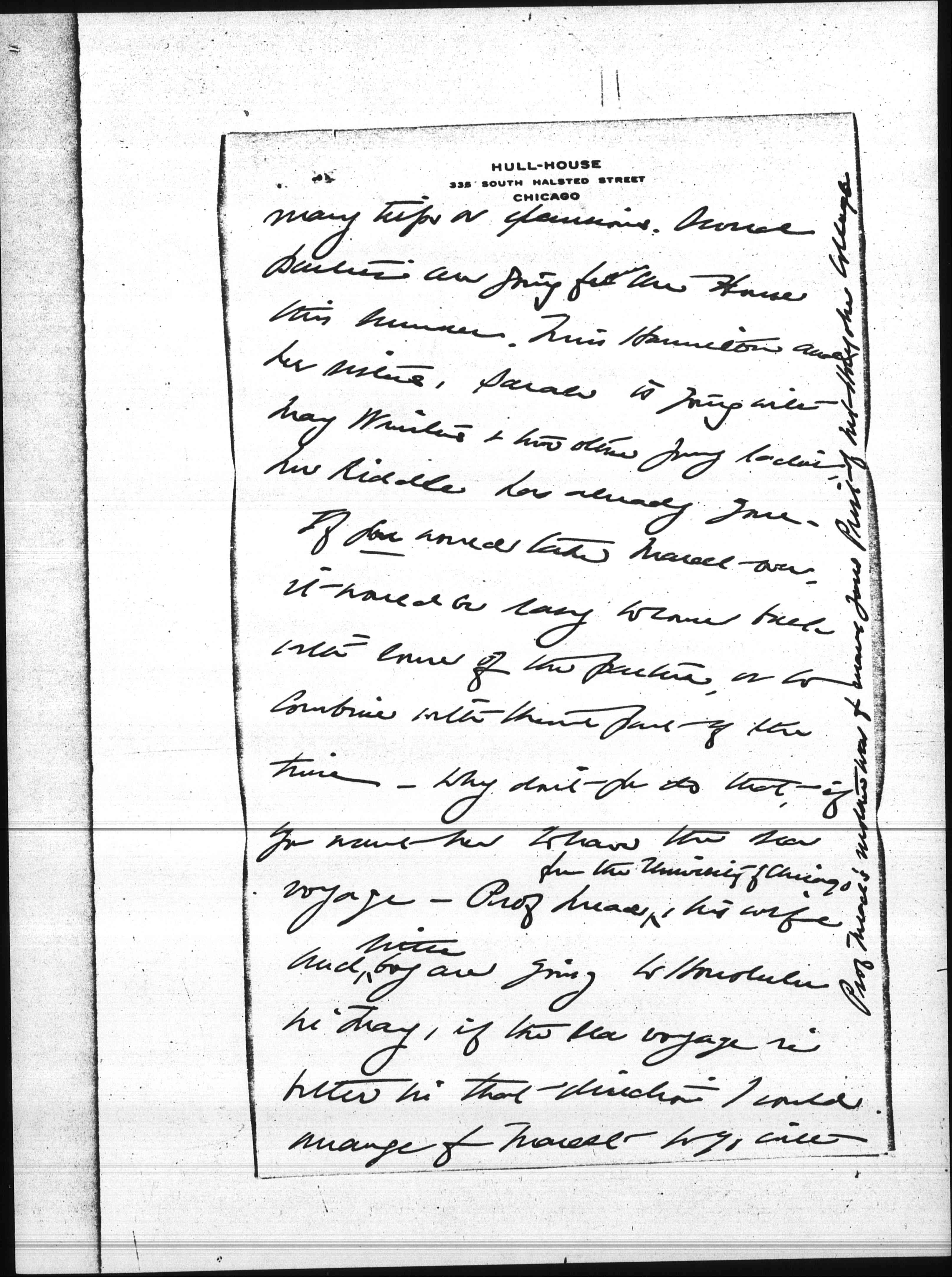 If you would take Marcet over, it would be easy to come back with some of the parties, or to combine with them part of the time -- why don't you do that, if you want her to have the sea voyage -- Prof Mead ↑from the University of Chicago↓, his wife and ↑little↓ boy are going to Honolulu in May, ↑Prof Mead's mother was for many years Pres't of Mt Holyoke College.↓ if the sea voyage is better in that direction I could arrange for Marcet to go with [page 3] them-- She would of course get some thing out of the Antwerp trip and could come back with Sarah in Sept. but it seems to me far from an ideal summer for your first taste of Europe.