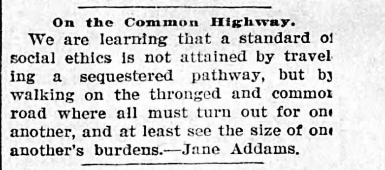 We are learning that a standard of social ethics is not attained by traveling a sequestered pathway, but by walking on the thronged and common road where all must turn out for one another, and at least see the size of one another's burdens. -- Jane Addams.