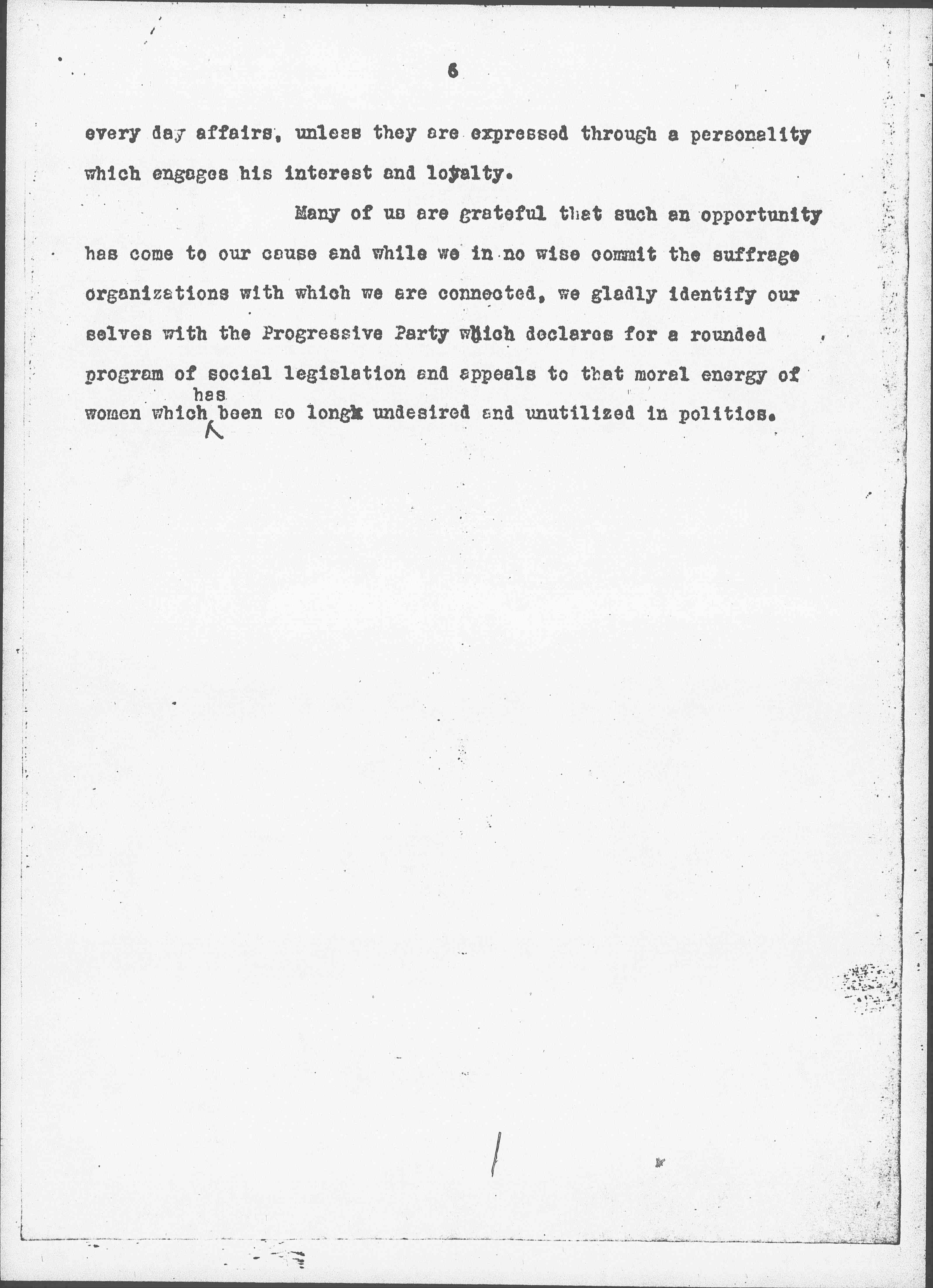 Many of us are grateful that such an opportunity has come to our cause and while we in no wise commit the suffrage organizations with which we are connected, we gladly identify ourselves with the Progressive Party which declares for a rounded program of social legislation and appeals to that moral energy of women which ↑has↓ been so long undesired and unutilized in politics.