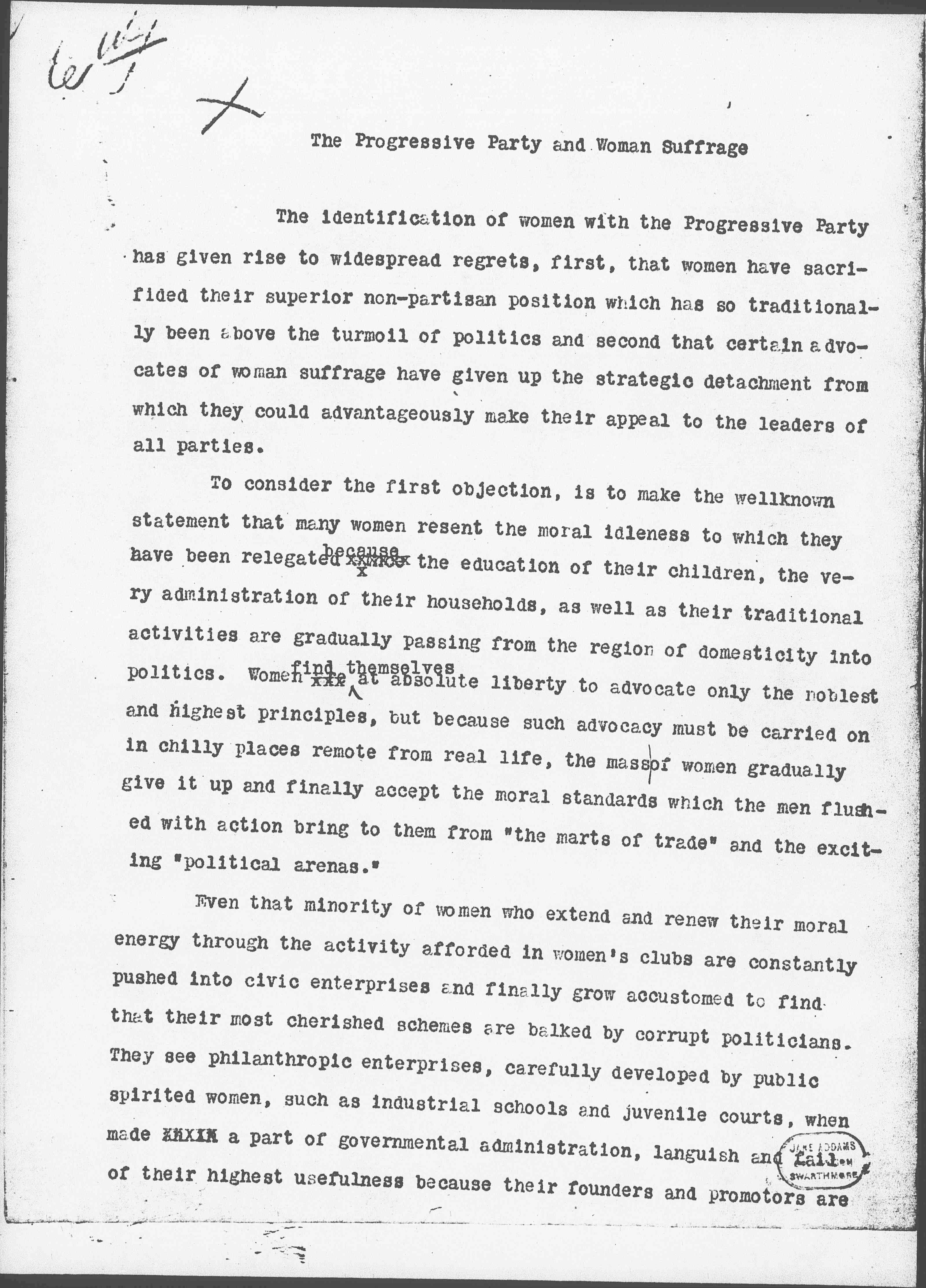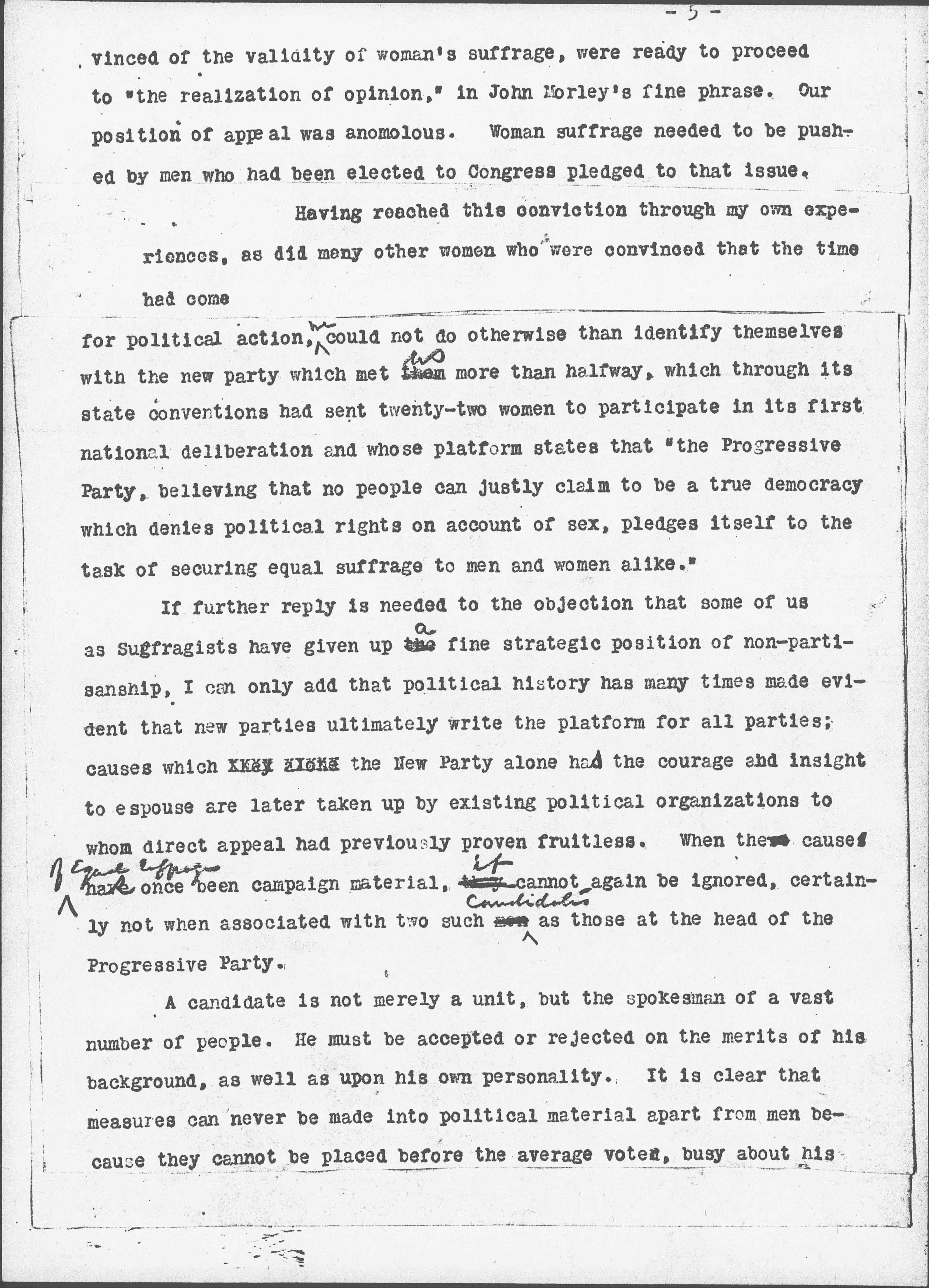 If further reply is needed to the objection that some of us as Suffragists have given up the ↑a↓ fine strategic position of non-partisanship, I can only add that political history has many times made evident that new parties ultimately write the platform for all parties; causes which they alone the New Party alone had the courage and insight to espouse are later taken up by existing political organizations to whom direct appeal had previosuly proven fruitless. When the cause ↑of Equal Suffrage↓ has once been campaign material, they ↑it↓ cannot again be ignored, certainly not when associated with two such men ↑candidates↓ as those at the head of the Progressive Party.