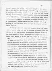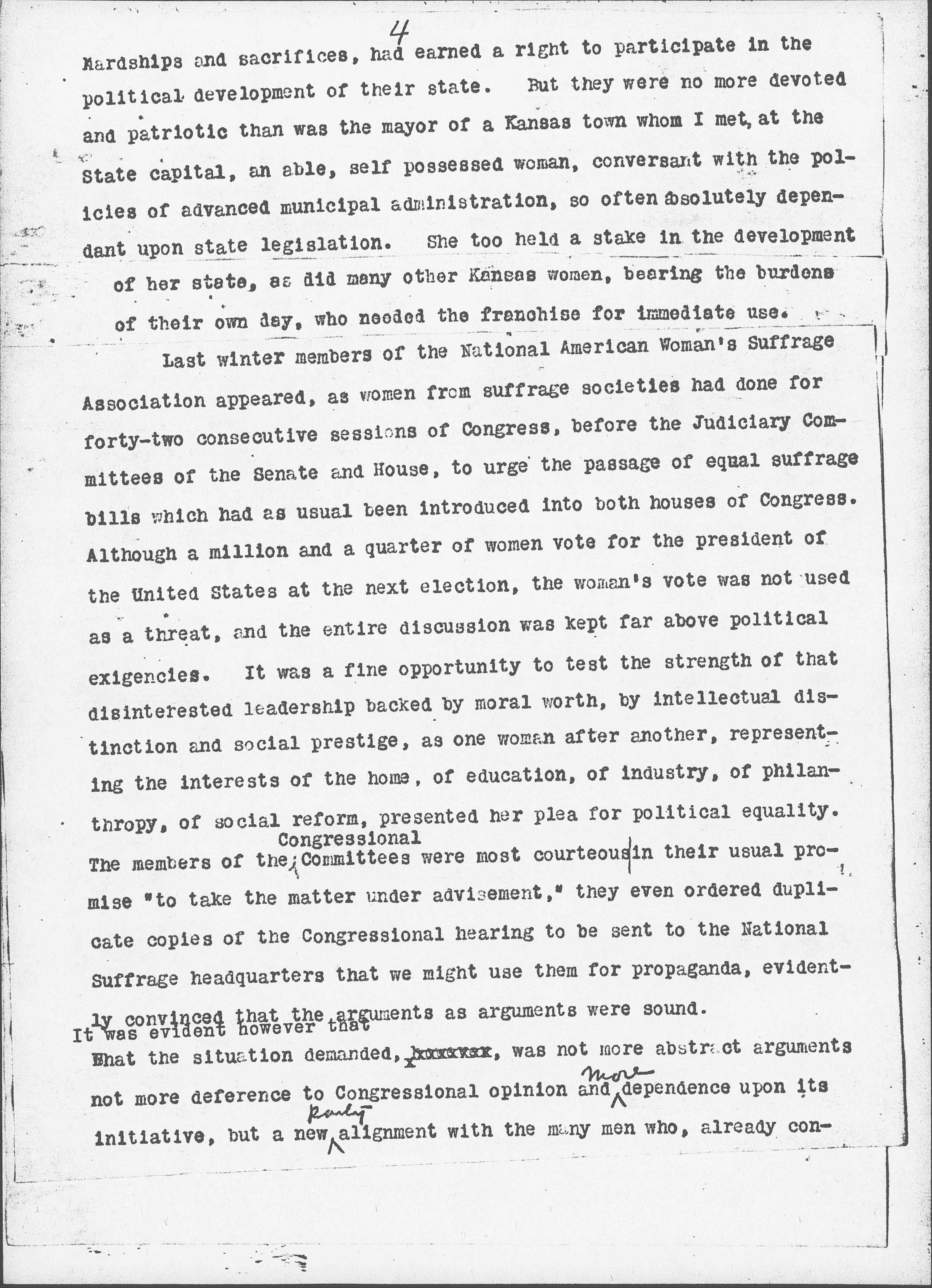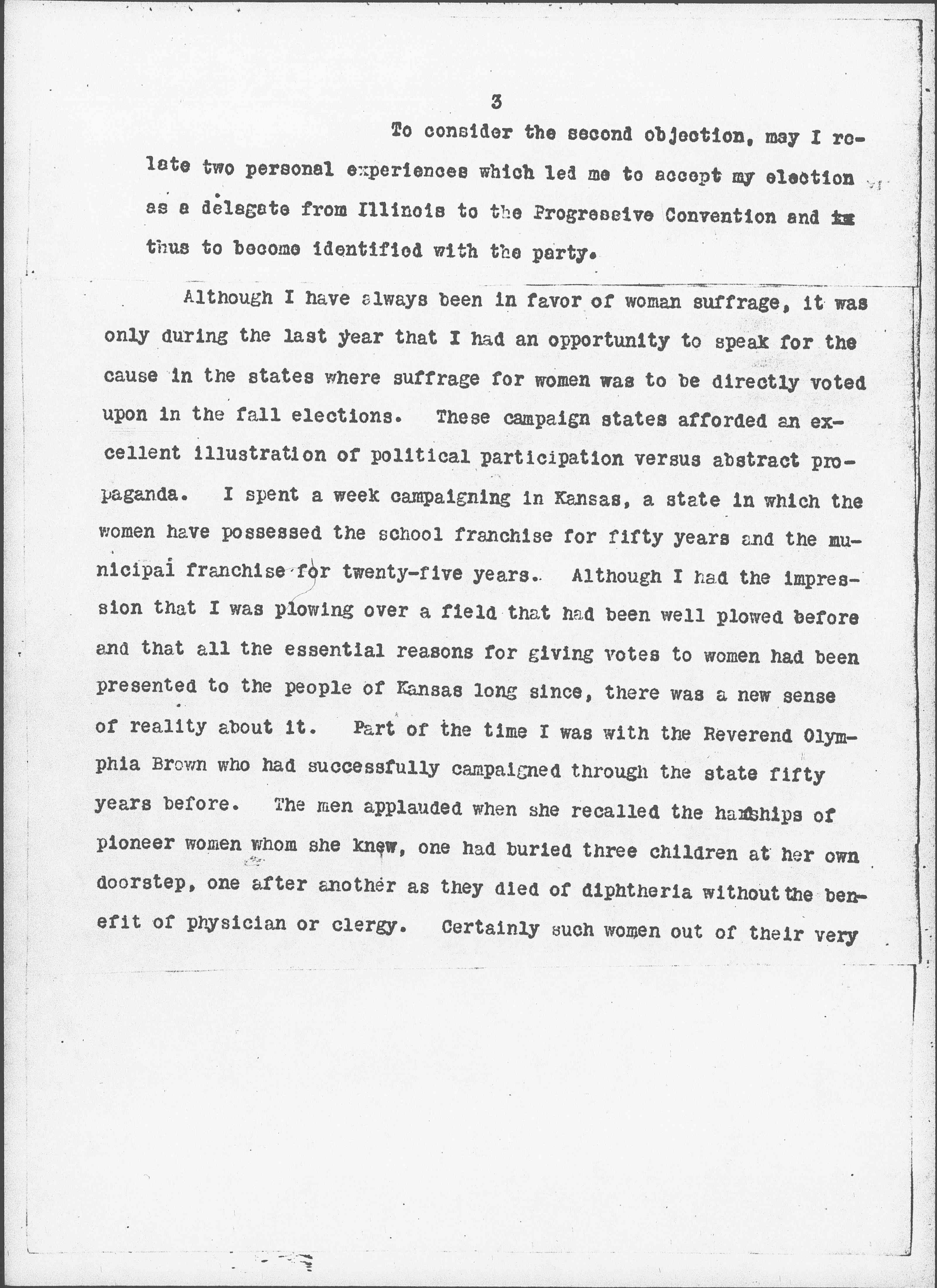 Although I have always been in favor of woman suffrage, it was only during the last year that I had an opportunity to speak for the cause in the states where suffrage for women was to be directly voted upon in the fall elections. These campaign states afforded an excellent illustration of political participation versus abstract propaganda. I spent a week campaigning in Kansas, a state in which the women have possessd the school franchise for fifty years and the municipal franchise for twenty-five years. Although I had the impression that I was plowing over a field that had been well plowed before and that all the essential reasons for giving votes to women had been presented to the people of Kansas long since, there was a new sense of reality about it. Part of the time I was with the Reverend Olympia Brown who had successfully campaigned through the state fifty years before. The men applauded when she recalled the hardships of pioneer women whom she knew, one had buried three children at her own doorstep, one after another as they died of diphtheria without the benefit of physician or clergy. Certainly such women out of their very [page 4] hardships and sacrifice, had earned a right to participate in the political development of their state. But they were no more devoted and patriotic than was the mayor of a Kansas town whom I met, at the State capital, an able, self possessed woman, conversant with the policies of advanced municipal administration, so often absolutely dependant upon state legislation. She too held a stake in the development of her state, as did many other Kansas women, bearing the burdens of their own day, who needed the franchise for immediate use.