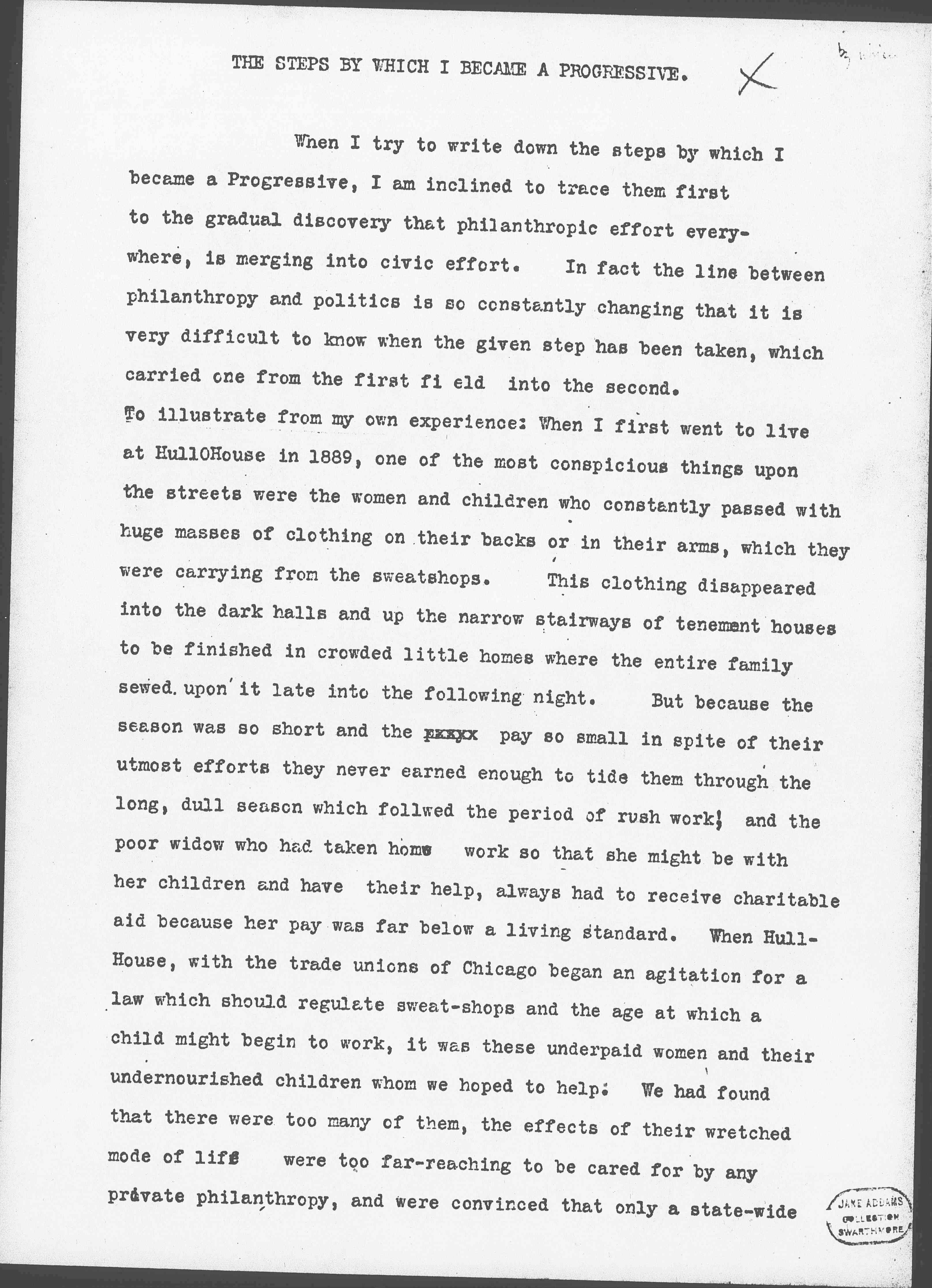To illustrate from my own experience: When I first went to live at Hull-House in 1889, one of the most [conspicuous] things upon the streets were the women and children who constantly passed with huge masses of clothing on their backs or in their arms, which they were carrying from the sweatshops. This clothing disappeared into the dark halls and up the narrow stairways of tenement houses to be finished in crowded little homes where the entire family sewed upon it late into the following night. But because the season was so short and the pay so small in spite of their utmost efforts they never earned enough to tide them through the long, dull season which followed the period of rush work; and the poor widow who had taken home work so that she might be with her children and have their help, always had to receive charitable aid because her pay was far below a living standard. When Hull-House, with the trade unions of Chicago began an agitation for a law which should regulate sweat-shops and the age at which a child might begin to work, it was these underpaid women and their undernourished children whom we hoped to help. We had found that there were too many of them, the effects of their wretched mode of life were too far-reaching to be cared for by any private philanthropy, and were convinced that only a state-wide [page 2] regulation could make an impression upon the situation.
