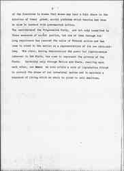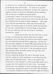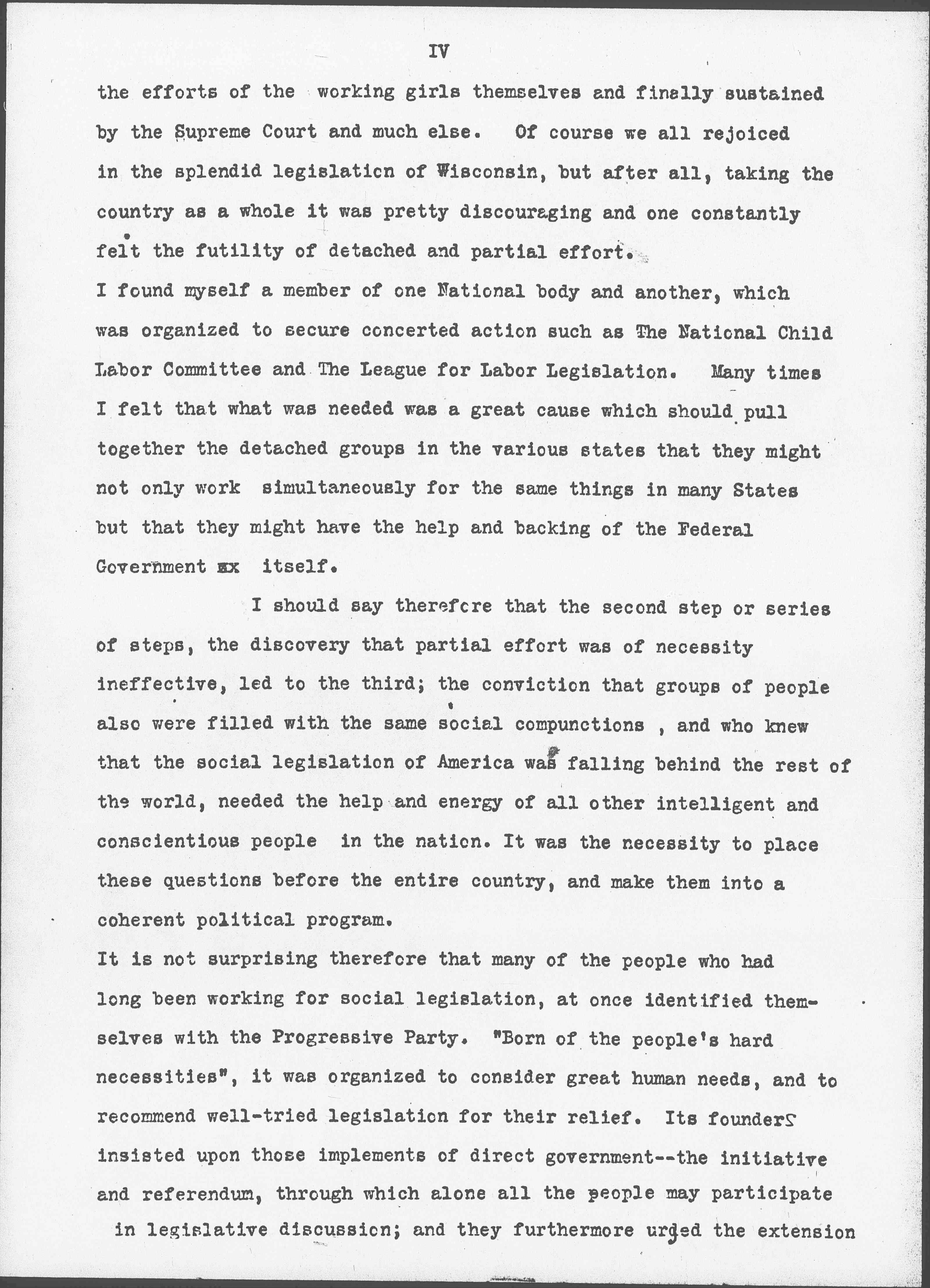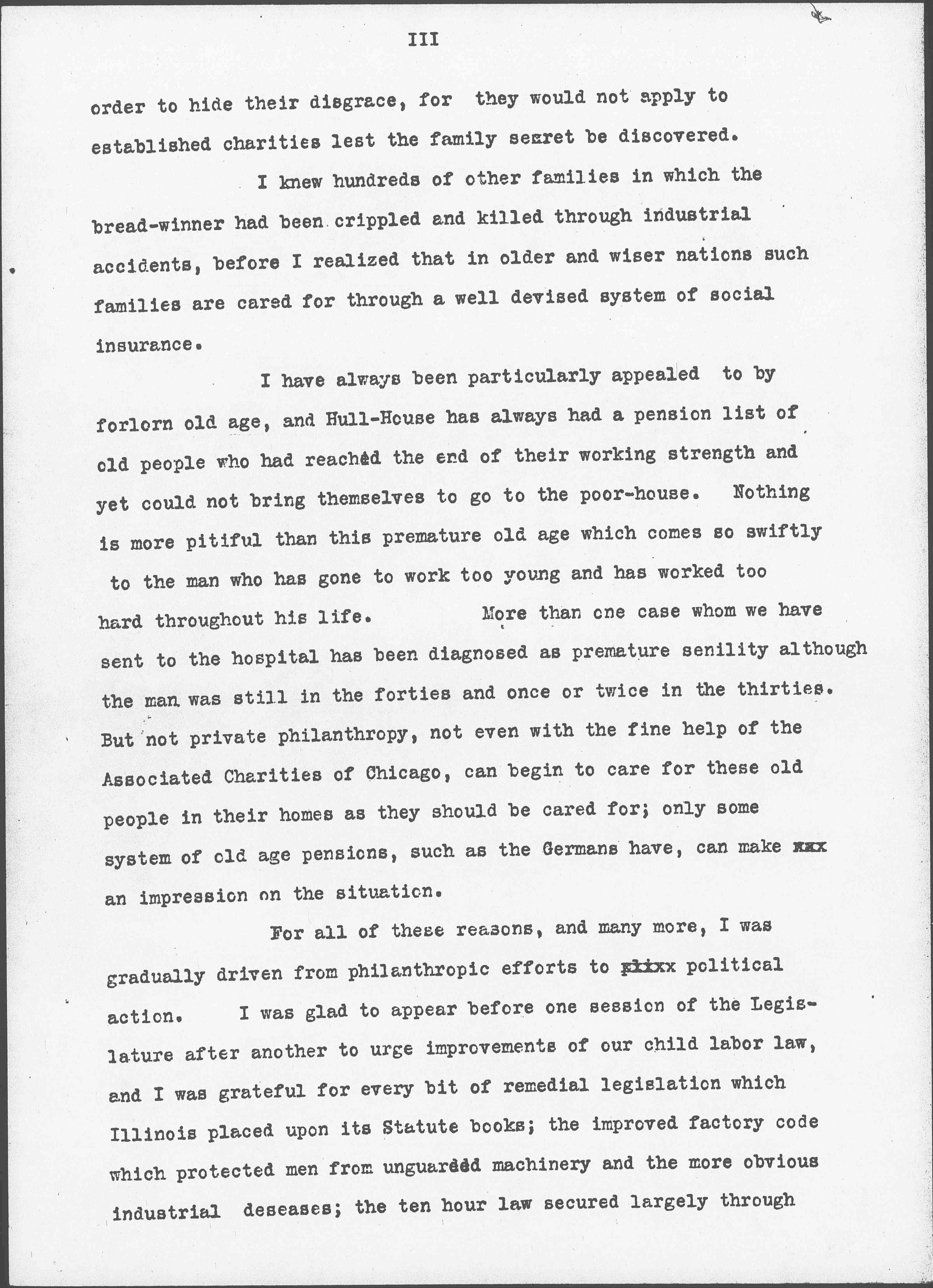 For all of these reasons, and many more, I was gradually driven from philanthropic efforts to political action. I was glad to appear before one session of the Legislature after another to urge improvements of our child labor law, and I was grateful for every bit of remedial legislation which Illinois placed upon its Statute books; the improved factory code which protected men from unguarded machinery and the more obvious industrial diseases; the ten hour law secured largely through [page 4] the efforts of the working girls themselves and finally sustained by the Supreme Court and much else. Of course we all rejoiced in the splendid legislation of Wisconsin, but after all, taking the country as a whole it was pretty discouraging and one constantly felt the futility of detached and partial effort.