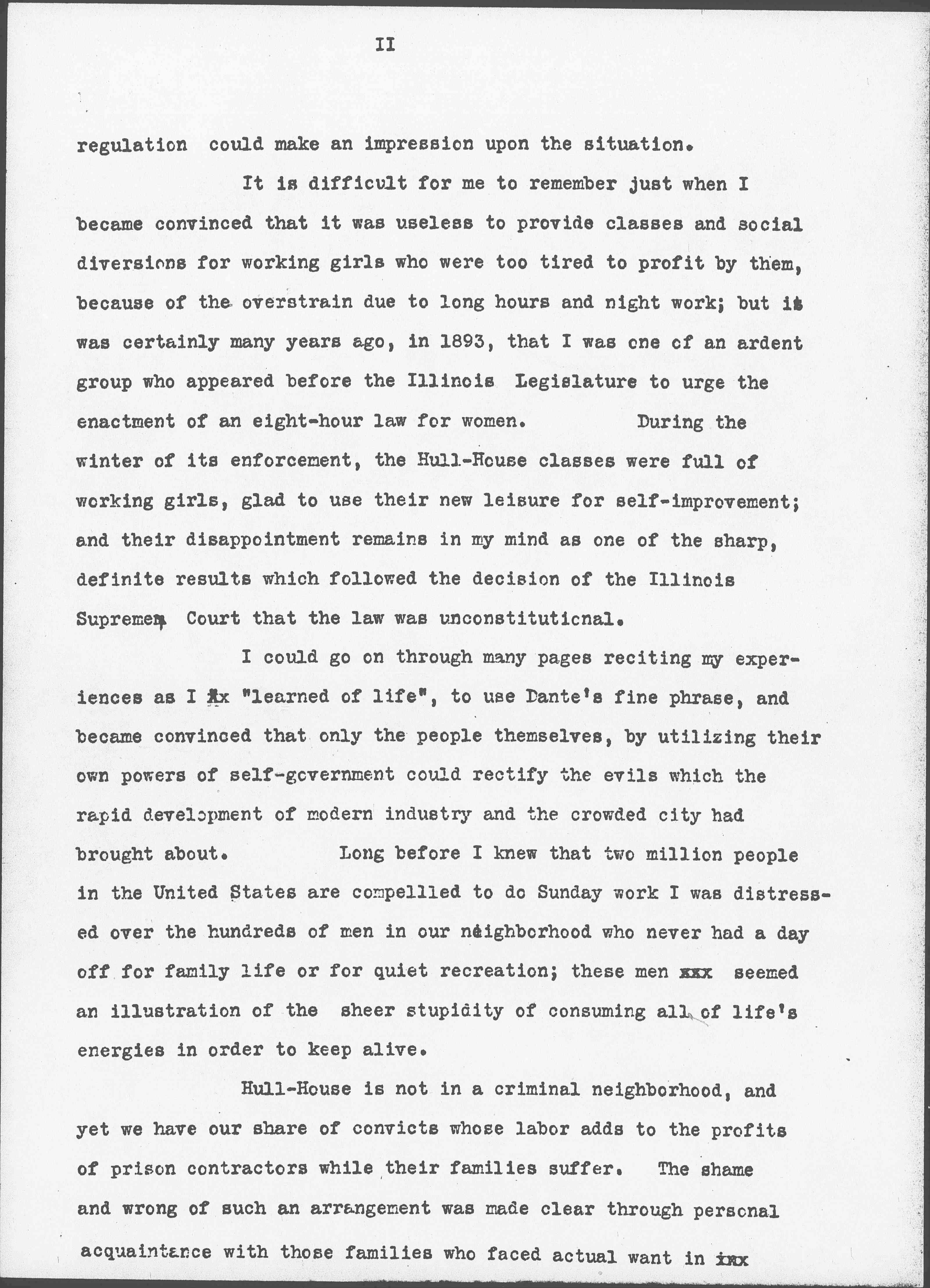 It is difficult for me to remember just when I became convinced that it was useless to provide classes and social diversions for working girls who were too tired to profit by them, because of the overstrain due to long hours and night work; but it was certainly many years ago, in 1893, that I was one of an ardent group who appeared before the Illinois Legislature to urge the enactment of an eight-hour law for women. During the winter of its enforcement, the Hull-House classes were full of working girls, glad to use their new leisure for self-improvement; and their disappointment remains in my mind as one of the sharp, definite results which followed the decision of the Illinois Supreme Court that the law was unconstitutional.