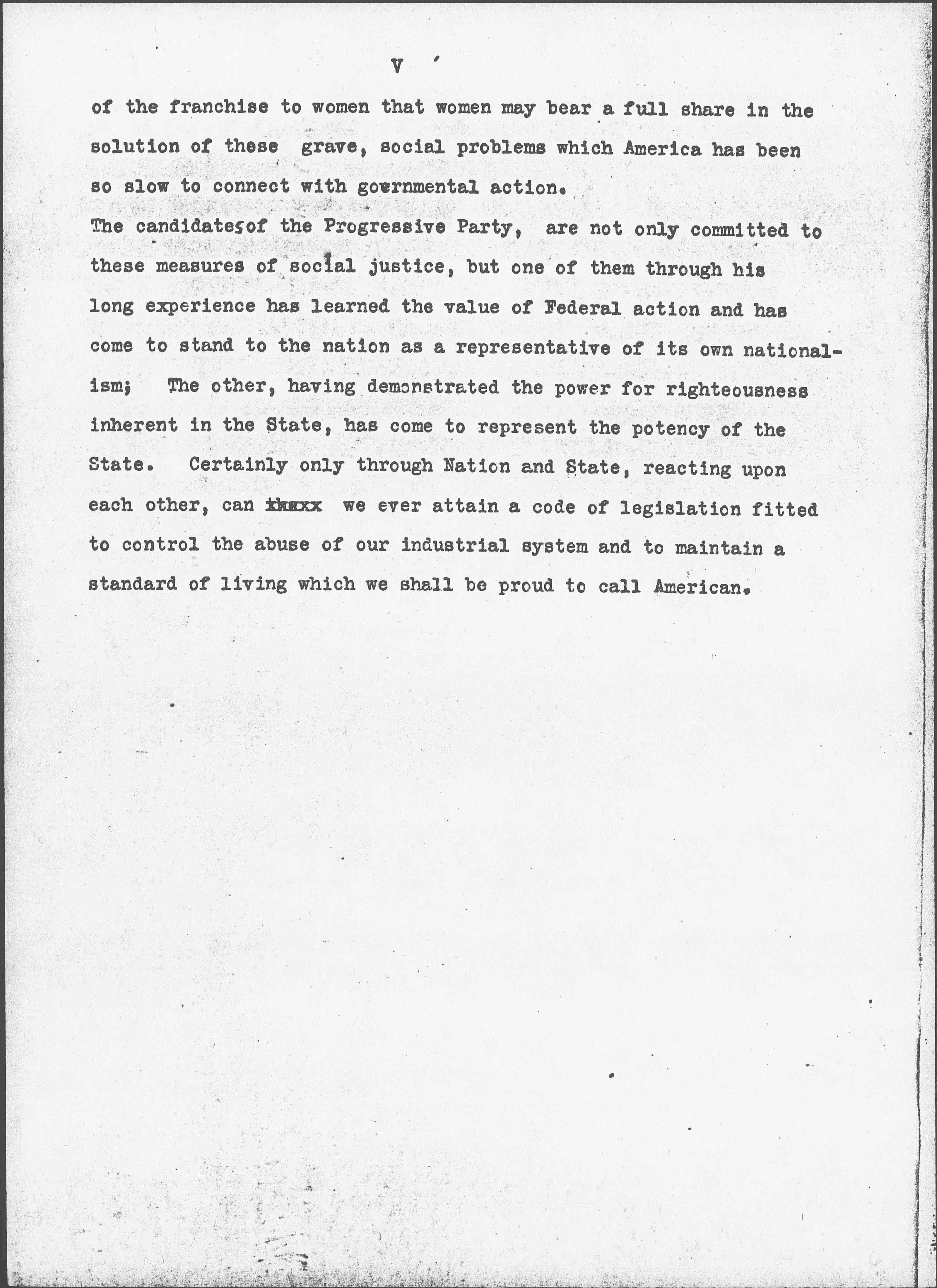 The candidates of the Progressive Party, are not only committed to these measures of social justice, but one of them through his long experience has learned the value of Federal action and has come to stand to the nation as a representative of its own nationalism. The other, having demonstrated the power for righteousness inherent in the State, has come to represent the potency of the State. Certainly only through Nation and State, reacting upon each other, can we ever attain a code of legislation fitted to control the abuse of our industrial system and to maintain a standard of living which we shall be proud to call American.