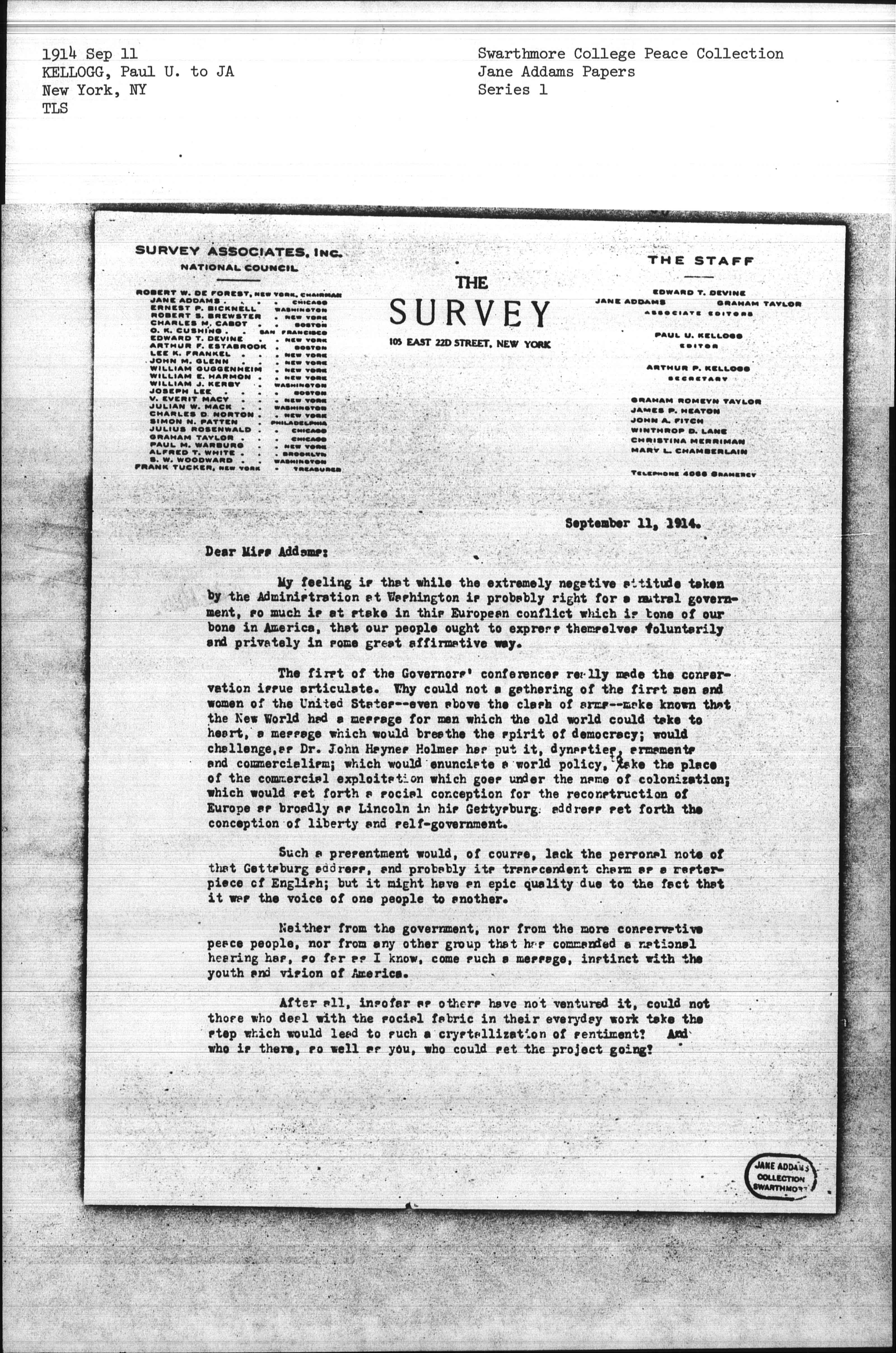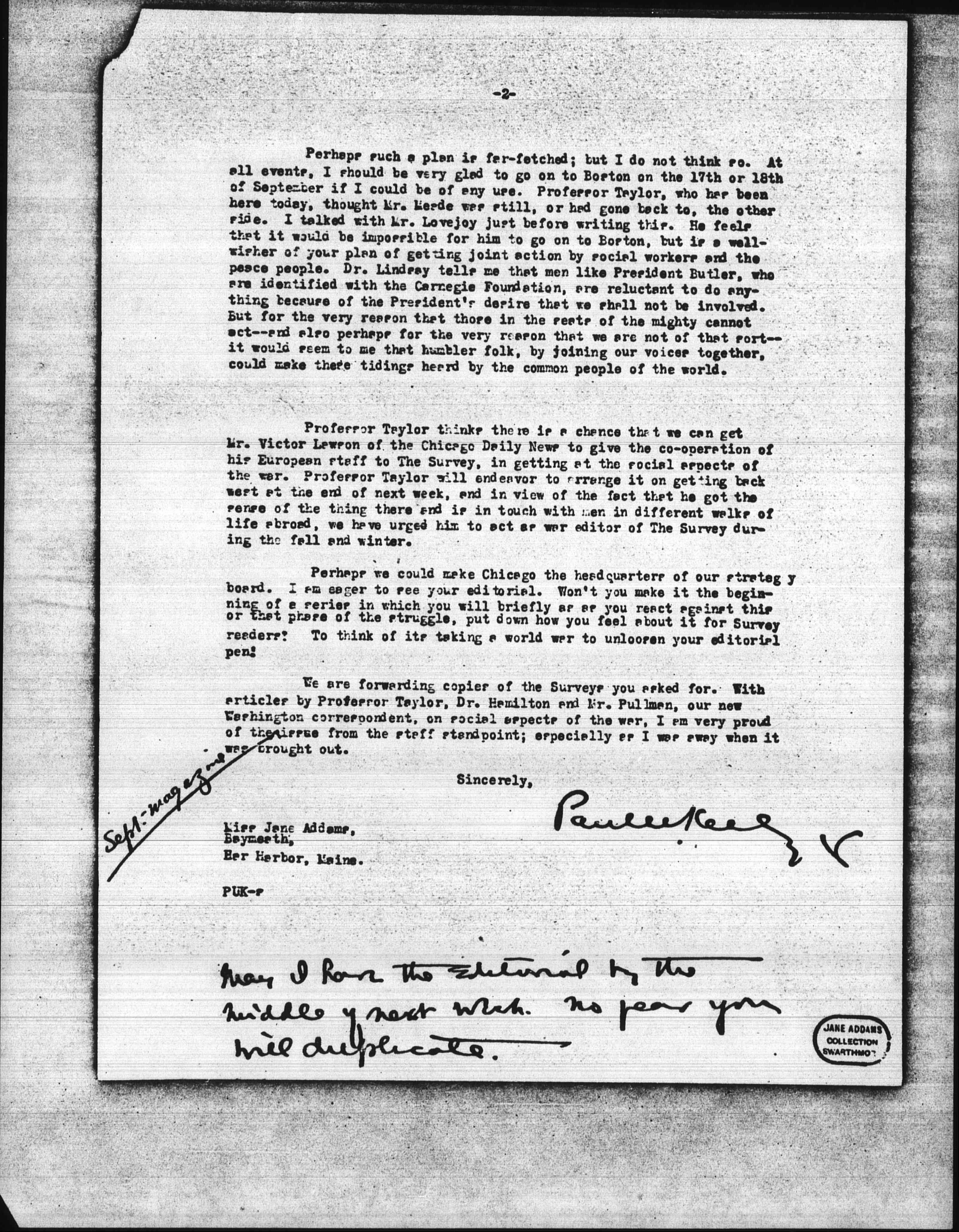 Perhaps such a plan is far-fetched; but I do not think so. At all events, I should be very glad to go on to Boston on the 17th or 18th of September if I could be of any use. Professor Taylor, who has been here today, thought Mr. [Mead] was still, or had gone back to, the other side. I talked with Mr. Lovejoy just before writing this. He feels that it would be impossible for him to go on to Boston, but is a well-wisher of your plan of getting joint action by social workers and the peace people. Dr. [Lindsey] tells me that men like President Butler, who are identified with the Carnegie Foundation, are reluctant to do anything because of the President's desire that we shall not be involved. But for the very reason that those in the seats of the mighty cannot act -- and also perhaps for the very reason that we are not of that sort -- it would seem to me that humbler folk, by joining our voices together, could make these tidings heard by the common people of the world.