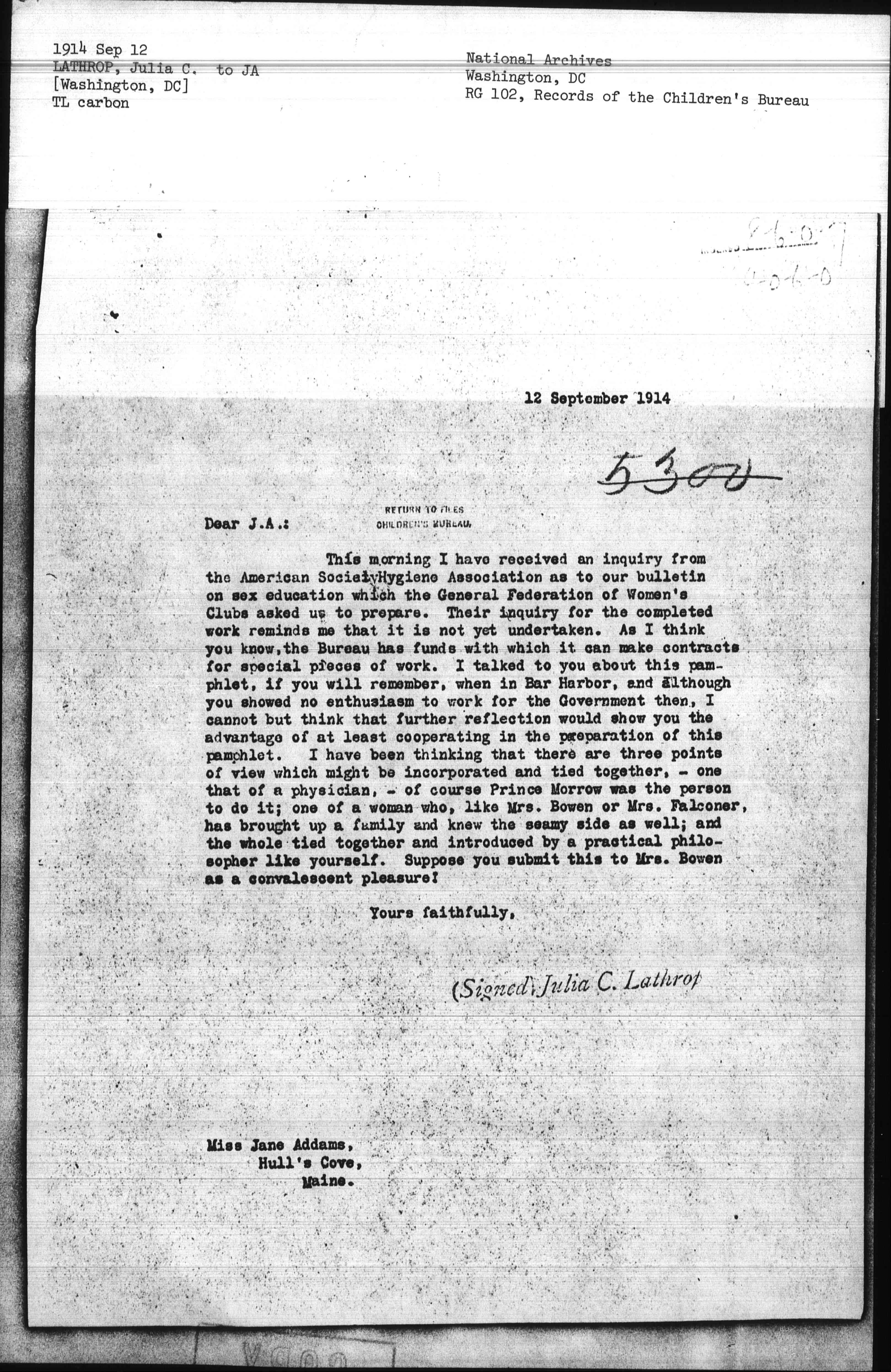 This morning I have received an inquiry from the American Society Hygiene Association as to our bulletin on sex education which the General Federation of Women's Clubs asked us to prepare. Their inquiry for the completed work reminds me that it is not yet undertaken. As I think you know, the Bureau has funds with which it can make contracts for special pieces of work. I talked to you about this pamphlet, if you will remember, when in Bar Harbor, and although you showed no enthusiasm to work for the Government then, I cannot but think that further reflection would show you the advantage of at least cooperating in the preparation of this pamphlet. I have been thinking that there are three points of view which might be incorporated and tied together, -- one that of a physician, -- of course Prince Morrow was the person to do it; one of a woman who, like Mrs. Bowen or Mrs. Falconer, has brought up a family and knew the seamy side as well; and the whole tied together and introduced by a practical philosopher like yourself. Suppose you submit this to Mrs. Bowen as a convalescent pleasure!