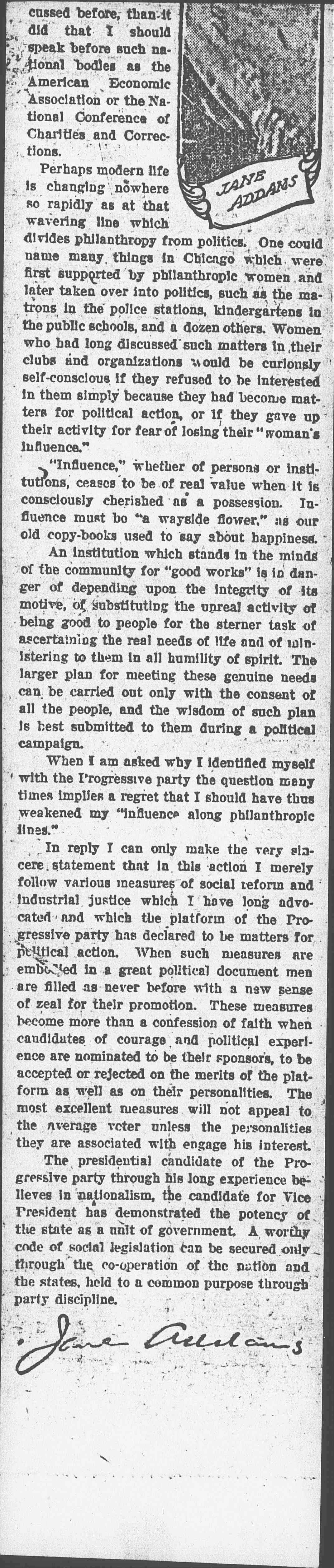 When I am asked why I identified myself with the Progressive party the question many times implies a regret that I should have thus weakened my "influence along philanthropic lines."