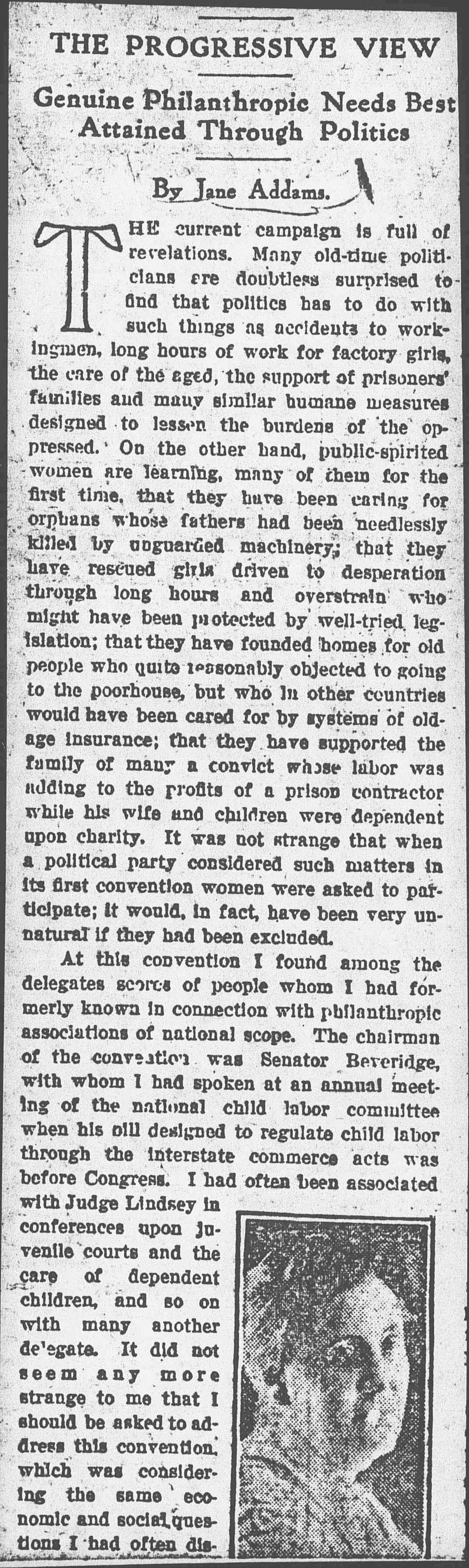 At this convention I found among the delegates scores of people whom I had formerly known in connection with philanthropic associations of national scope. The chairman of the convention was Senator Beveridge, with whom I had spoken at an annual meeting of the national child labor committee when his bill designed to regulate child labor through the interstate commerce acts was before Congress. I had often been associated with Judge Lindsey in conference upon juvenile courts and the care of dependent children, and so on with many another delegate. It did not seem any more strange to me that I should be asked to address this convention, which was considering the same economic and social questions I had often discussed before, than it did that I should speak before such national bodies as the American Economic Association or the National Conference of Charities and Corrections.