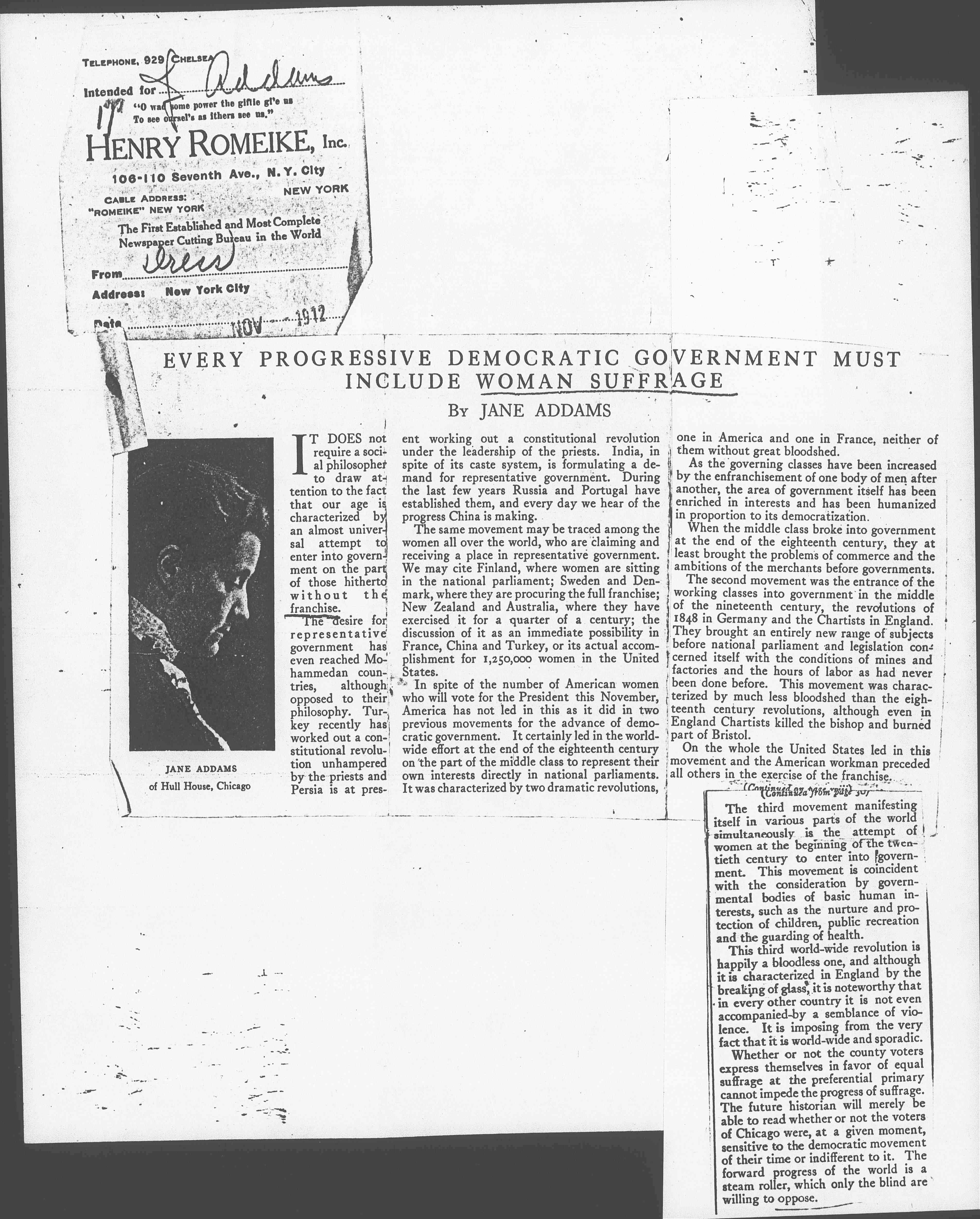 Whether or not the county voters express themselves in favor of equal suffrage at the preferential primary cannot impede the progress of suffrage. The future historian will merely be able to read whether or not the voters of Chicago were, at a given moment, sensitive to the democratic movement of their time or indifferent to it. The forward progress of the world is a steam roller, which only the blind are willing to oppose.