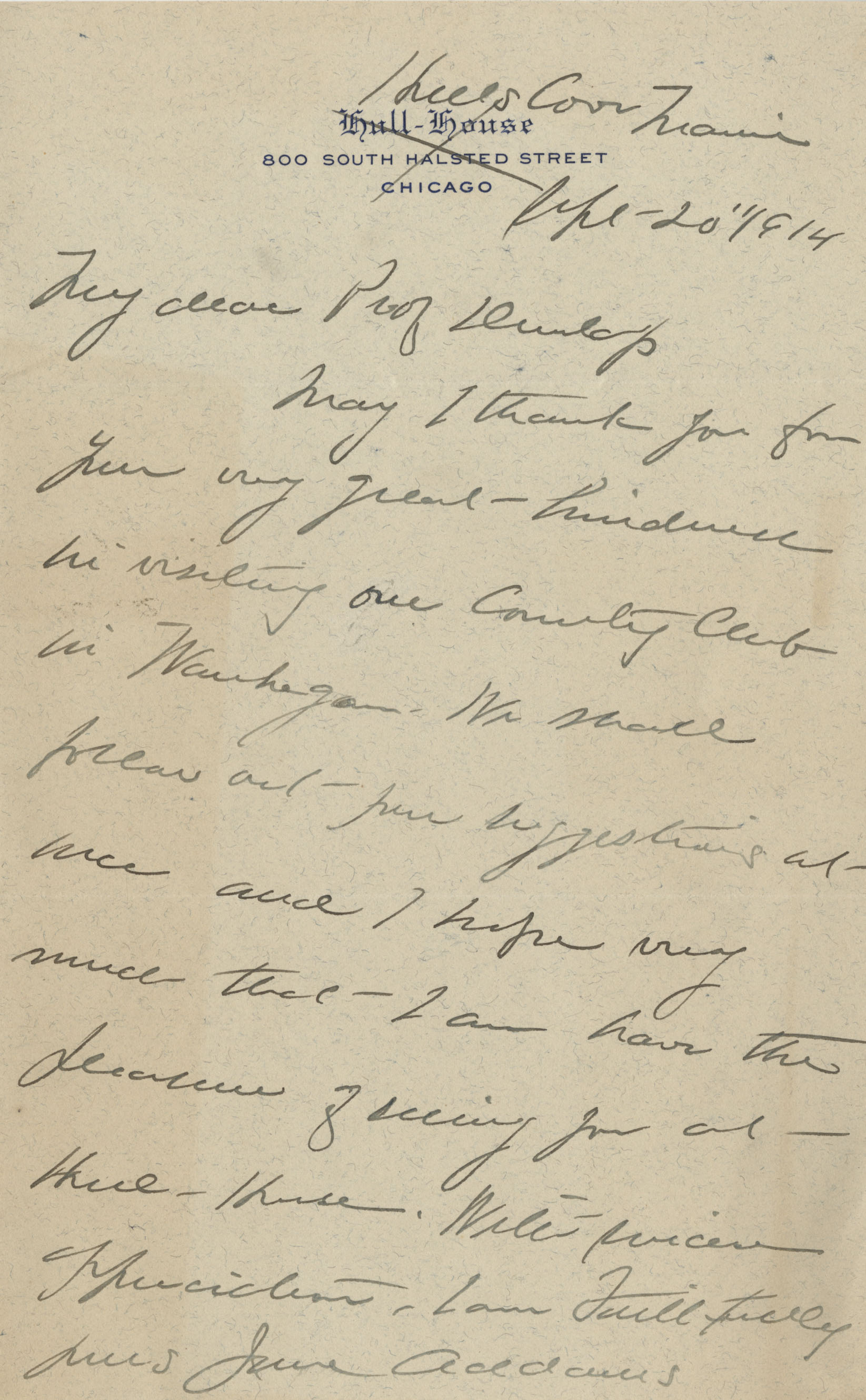 May I thank you for your very great kindness in visiting our Country Club in Waukegan. We shall follow out your suggestions at once and I hope very much that I can have the pleasure of seeing you at Hull-House. With sincere appreciation, I am Faithfully yours