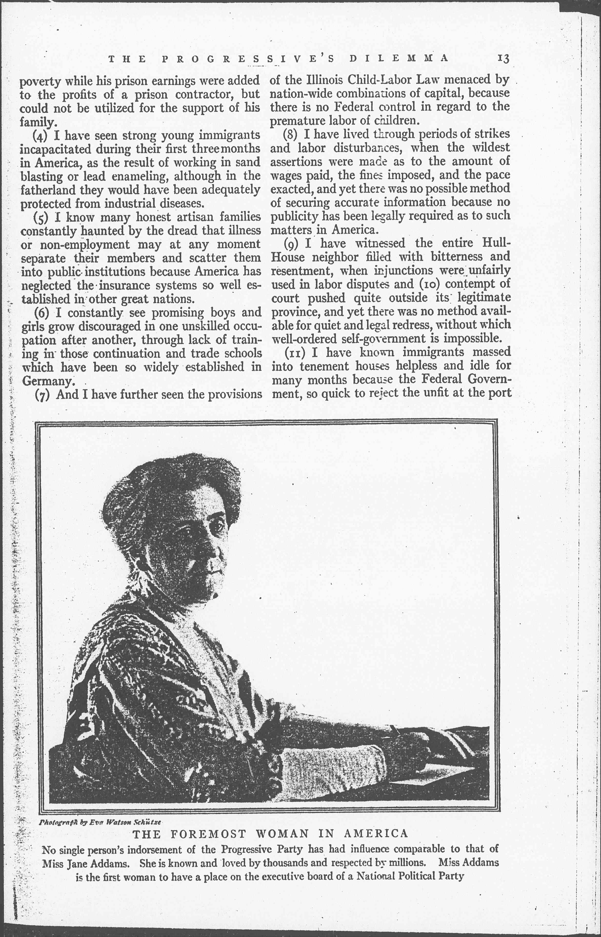 No single [endorsement] of the Progressive Party has had influence comparable to that of Miss Jane Addams. She is known and loved by thousands and respected by millions. Miss Addams is the first woman to have a place on the executive board of a National Political Party.] [page 3]
