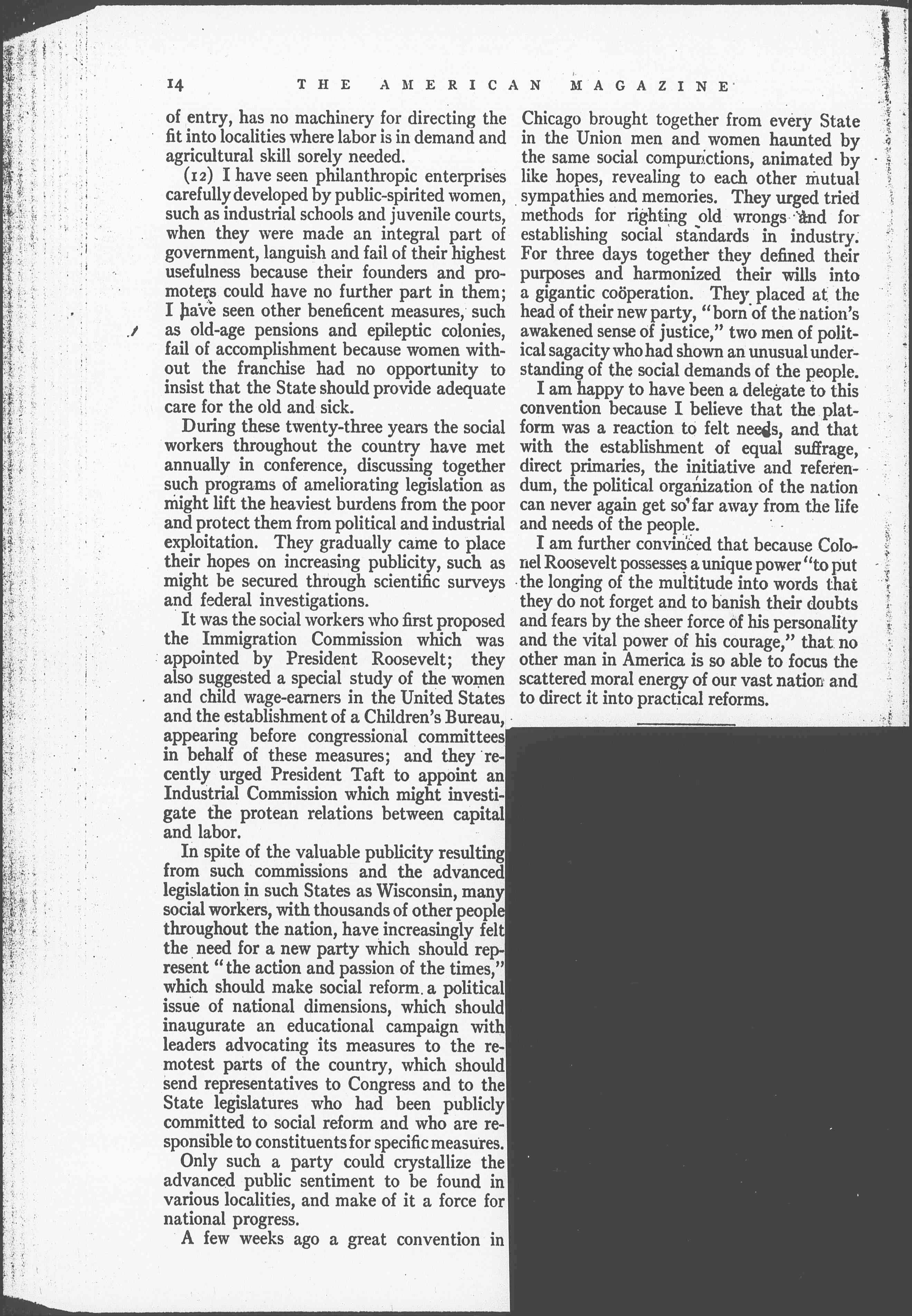 It was the social workers who first proposed the Immigration Commission which was appointed by President Roosevelt; they also suggested a special study of the women and child wage-earners in the United States and the establishment of a Children's Bureau, appearing before congressional committees in behalf of these measures; and they recently urged President Taft to appoint an Industrial Commission which might investigate the protean relations between capital and labor.