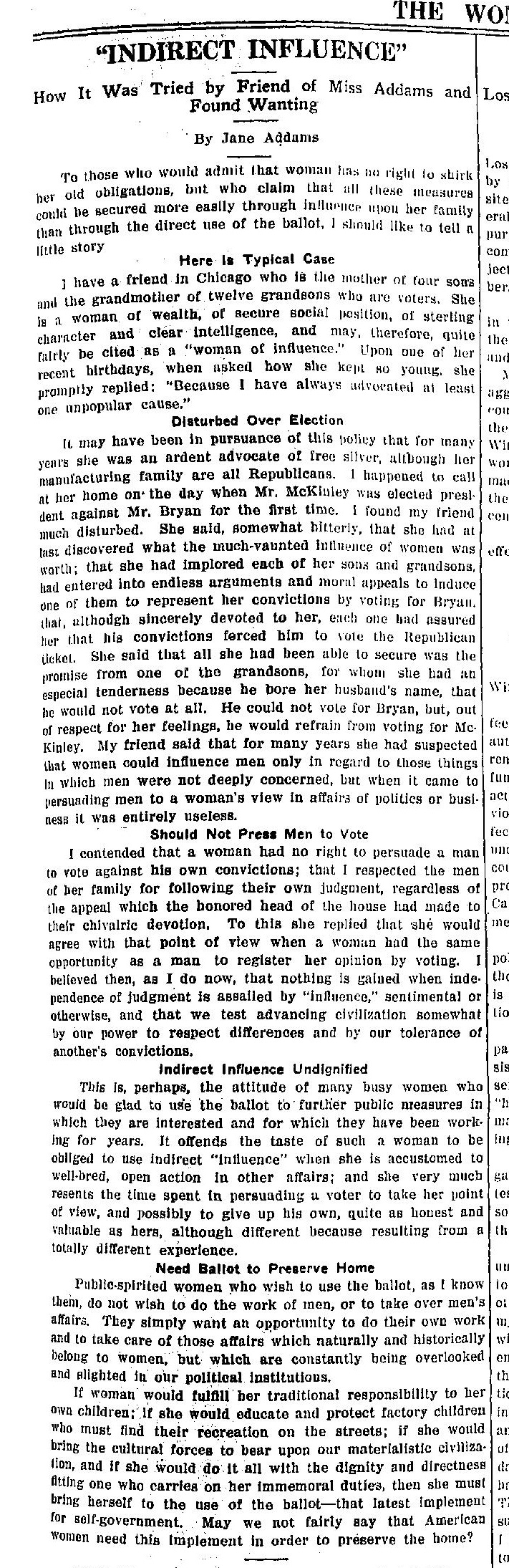 To those who would admit that woman has no right to shirk her old obligations, but who claim that all of these measures could be secured more easily through influence upon her family than through the direct use of the ballot, I should like to tell a little story. By Jane Addams