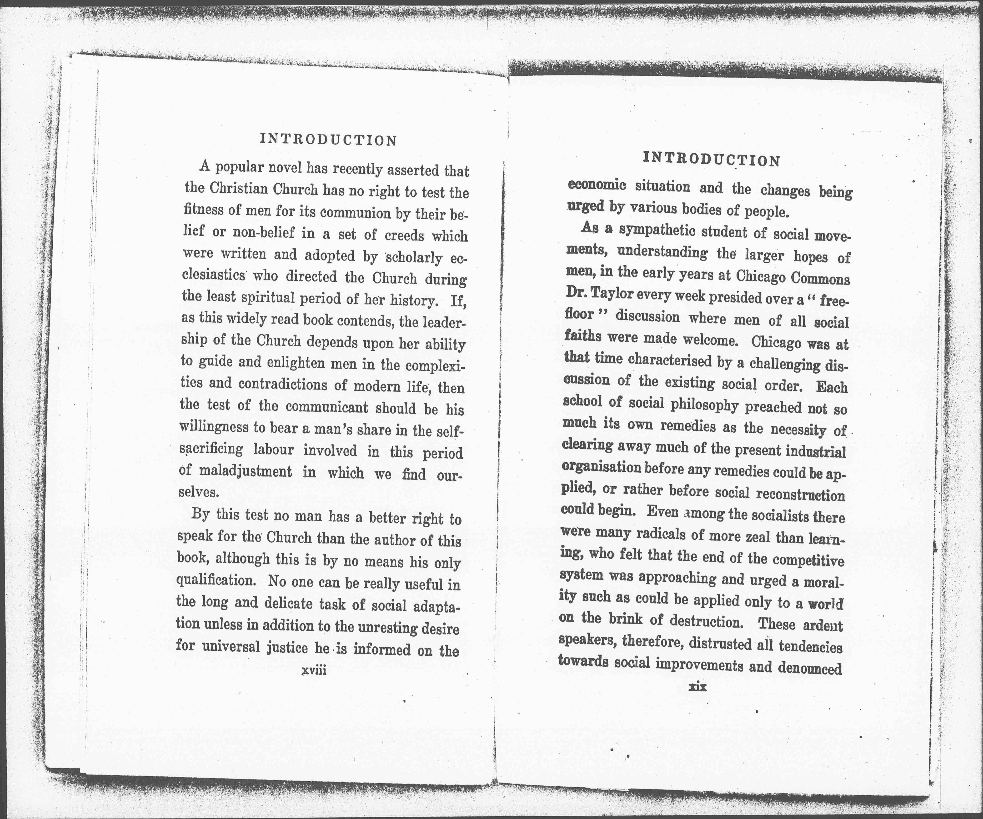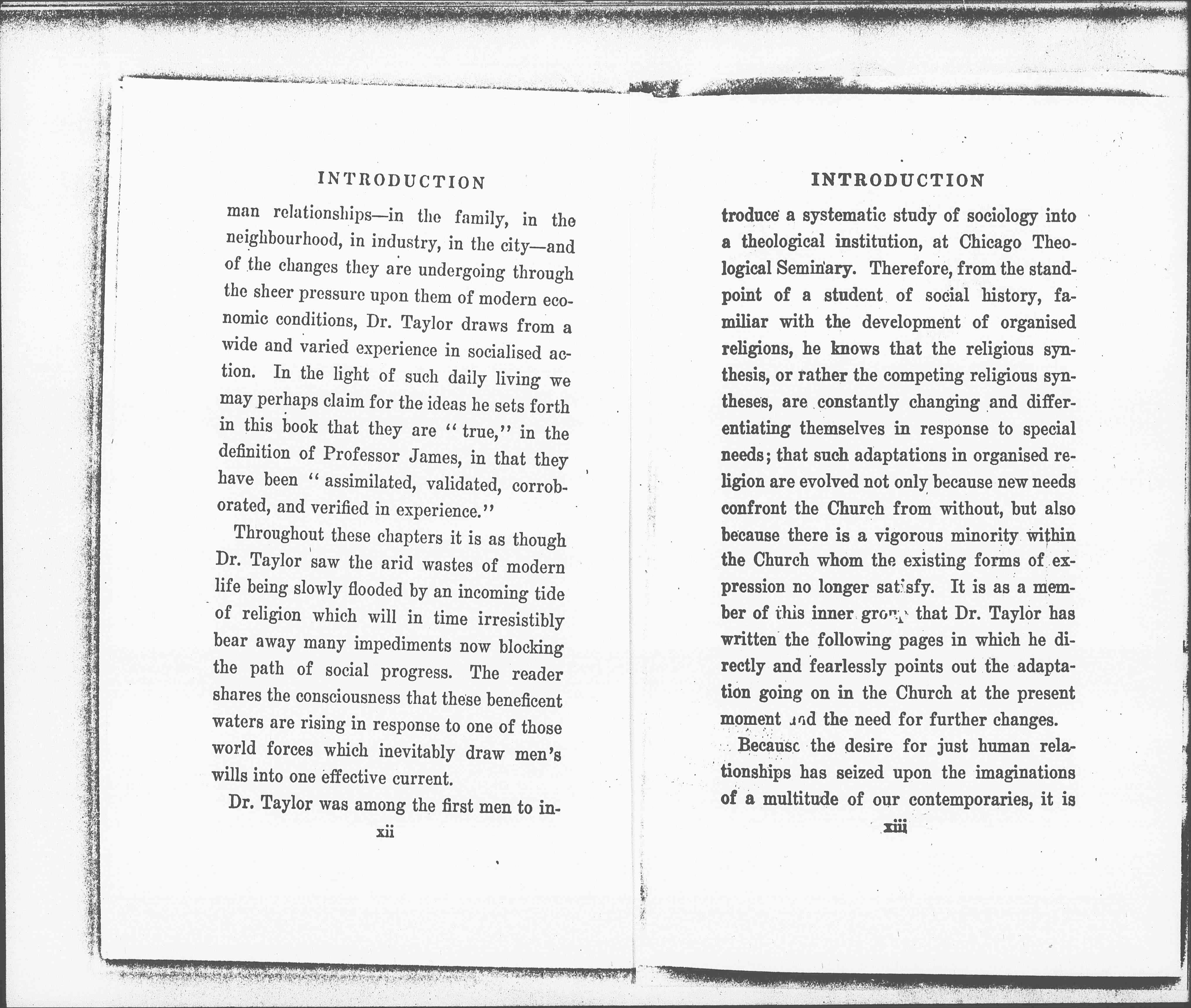 Dr. Taylor was among the first men to [page 3] introduce a systematic study of sociology into a theological institution, at Chicago Theological Seminary. Therefore, from the standpoint of a student of social history, familiar with the development of organized religions, he knows that the religious synthesis, or rather the competing religious syntheses, are constantly changing and differentiating themselves in response to special needs; that such adaptations in organized religion are evolved not only because new needs confront the Church from without, but also because there is a vigorous minority within the Church whom the existing forms of expression no longer satisfy. It is as a member of this group that Dr. Taylor has written the following pages in which he directly and fearlessly points out the adaptation going on in the Church at the present moment and the need for further changes.