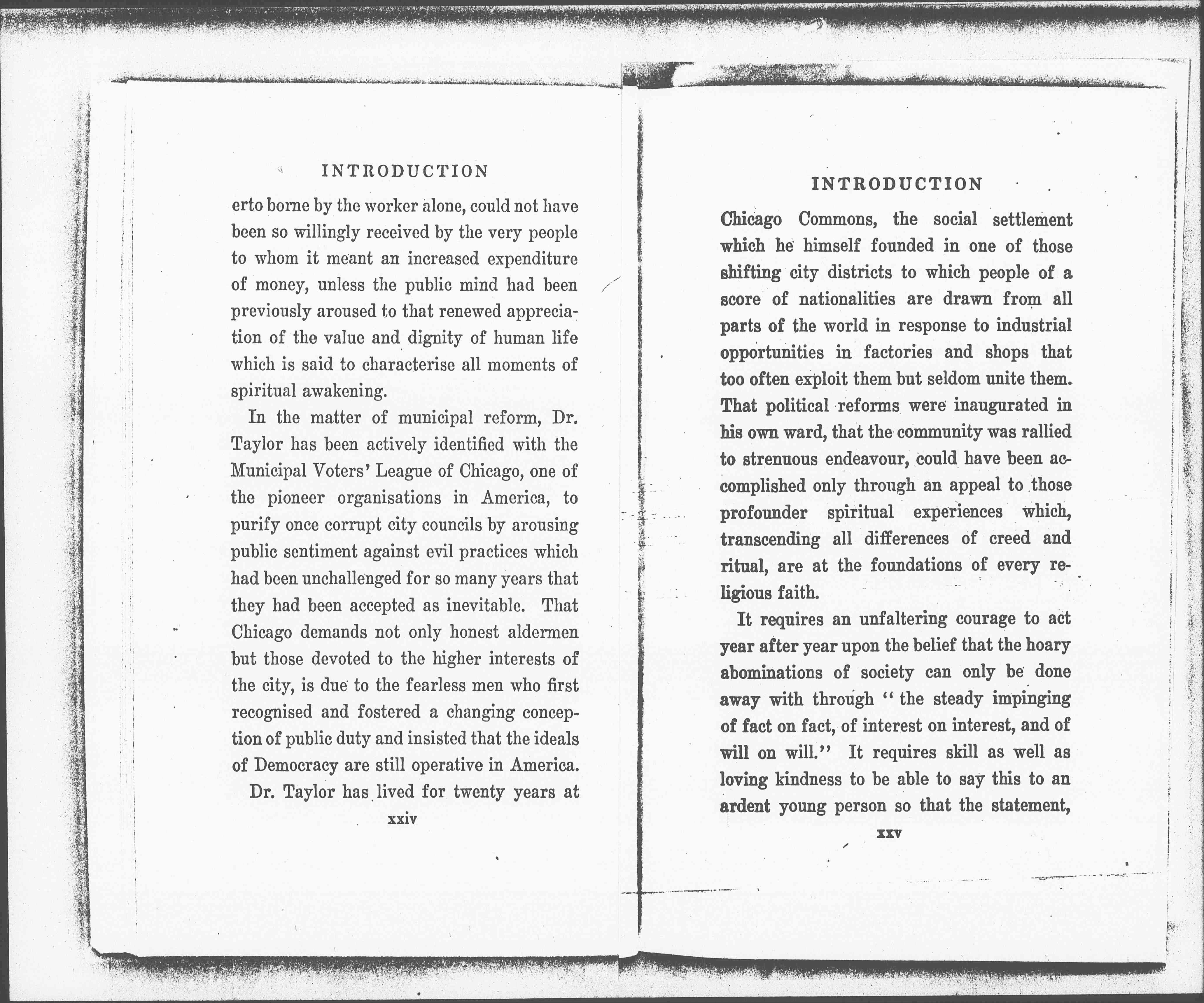Dr. Taylor has lived for twenty years at [page 15] Chicago Commons, the social settlement which he himself founded in one of those shifting city districts to which people of a score of nationalities are drawn from all parts of the world in response to industrial opportunities in factories and shops that too often exploit them but seldom unite them. That political reforms were inaugurated in his own ward, that the community was rallied to strenuous endeavor, could have been accomplished only through an appeal to those profounder spiritual experiences which, transcending all differences of creed and ritual, are at the foundations of every religious faith.