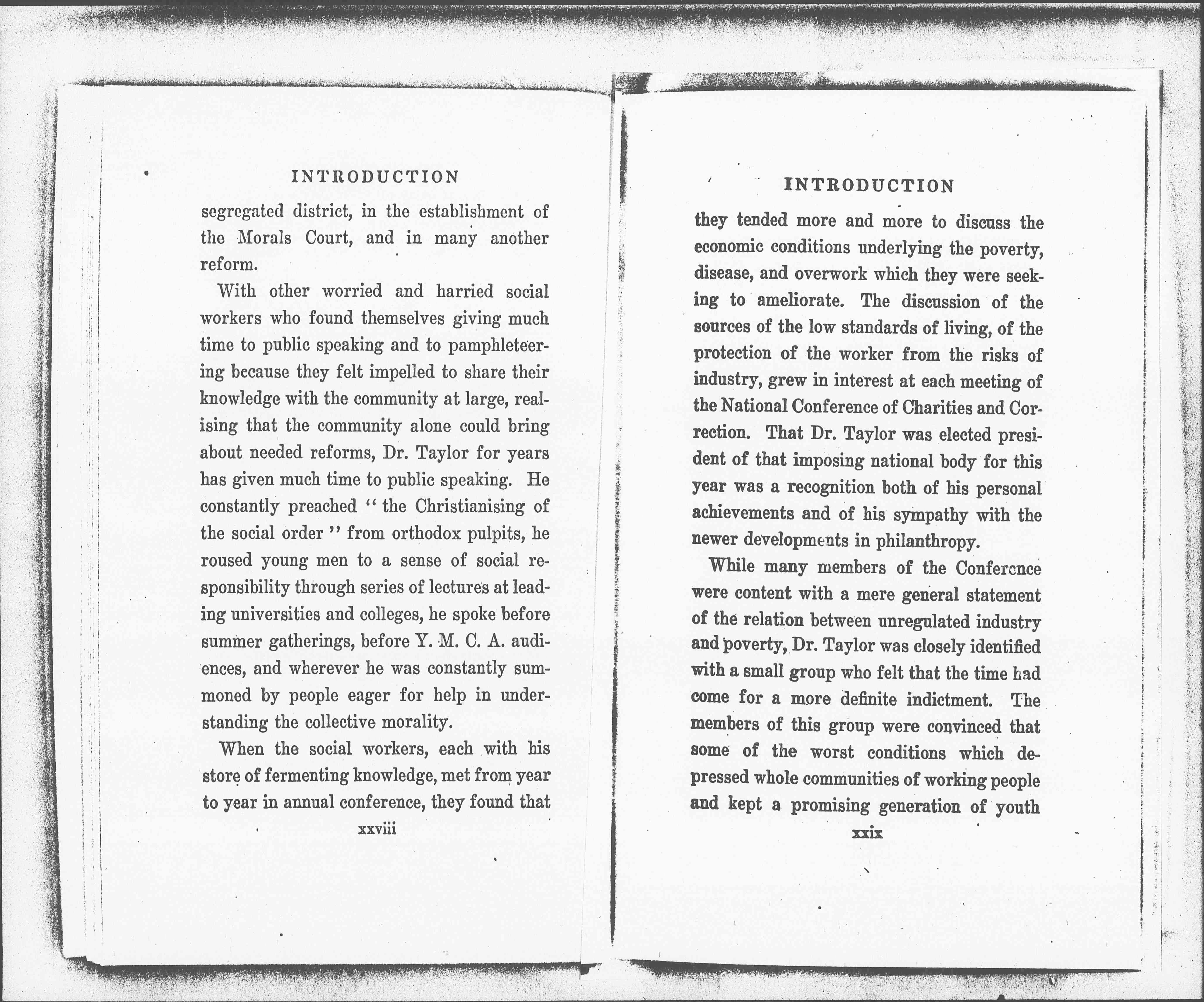 With other worried and harried social workers who found themselves giving much time to public speaking and to pamphleteering because they felt impelled to share their knowledge with the community at large, realizing that the community alone could bring about needed reforms, Dr. Taylor for years has given much time for public speaking. He constantly preached "the Christianizing of the social order" from orthodox pulpits, he roused young men to a sense of social responsibility through series of lectures at leading universities and colleges, he spoke before summer gatherings, before Y. M. C. A. audiences, and wherever he was constantly summoned by people eager for help in understanding the collective morality.