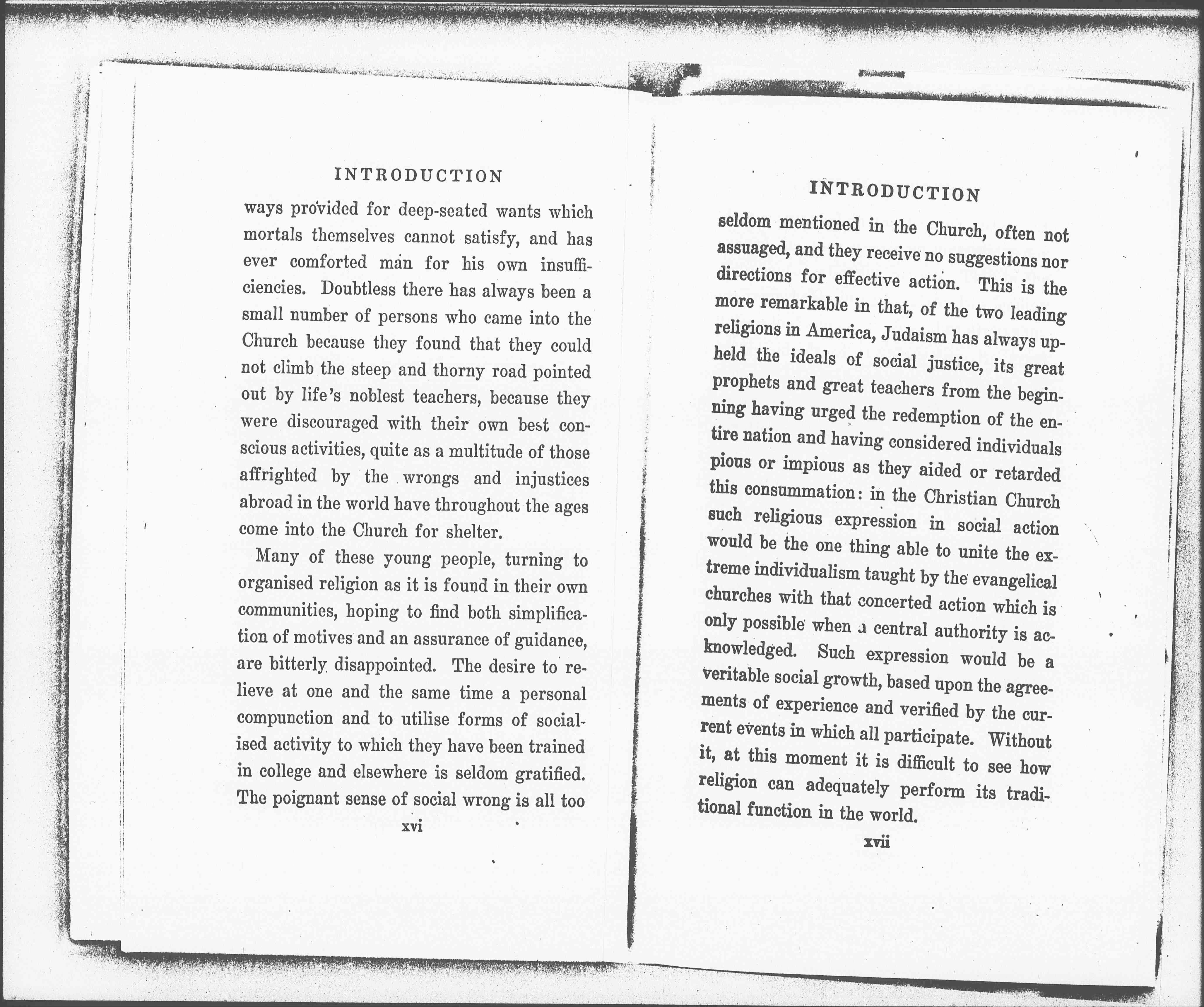 Many of these young people, turning to organized religion as it is found in their own communities, hoping to find both simplification of motives and an assurance of guidance, are bitterly disappointed. The desire to relieve at one and the same time a personal compunction and to utilize forms of socialized activity to which they have been trained in college and elsewhere is seldom gratified. The poignant sense of social wrong is all too [page 7] seldom mentioned in the Church, often not assuaged, and they receive no suggestions nor direction for effective action. This is the more remarkable in that, of the two leading religions in America, Judaism has always upheld the ideals of social justice, its great prophets and great teachers from the beginning having urged the redemption of the entire nation and having considered individuals pious or impious as they aided or retarded this consummation: in the Christian Church such religious expression in social action would be the one thing able to unite the extreme individualism taught by the evangelical churches with that concerted action which is only possible when a central authority is acknowledged. Such expression would be a veritable social growth, based upon the agreements of experience and verified by the current events in which all participate. Without it, at this moment it is difficult to see how religion can adequately perform its traditional function in the world.