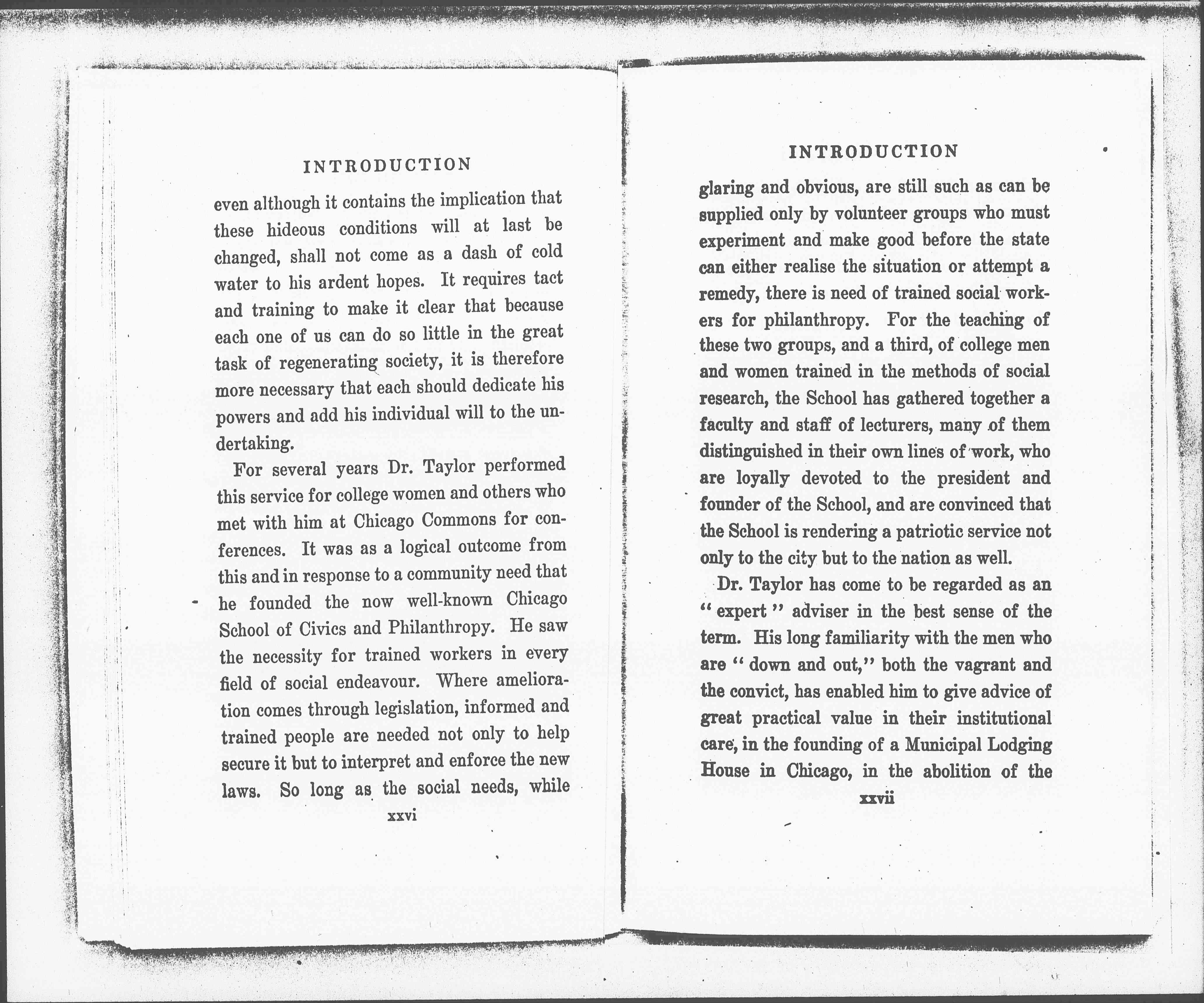 For several years Dr. Taylor performed this service for college women and others who met with him at Chicago Commons for conferences. It was as a logical outcome from this and in response to a community need that he founded the now well-known Chicago School of Civics and Philanthropy. He saw the necessity for trained workers in every field of social endeavor. Where amelioration comes through legislation, informed and trained people are needed not only to help secure it but to interpret and enforce the new laws. So long as the social needs, while [page 17] glaring and obvious, are still such as can be supplied only by volunteer groups who must experiment and make good before the state can either realize the situation or attempt a remedy, there is need of trained social workers for philanthropy. For the teaching these groups, and a third, of college men and women trained in the methods of social research, the School has gathered together a faculty and staff of lecturers, many of them distinguished in their own lines of work, who are loyally devoted to the president and founder of the School, and are convinced that the School is rendering a patriotic service not only to the city but to the nation as well.