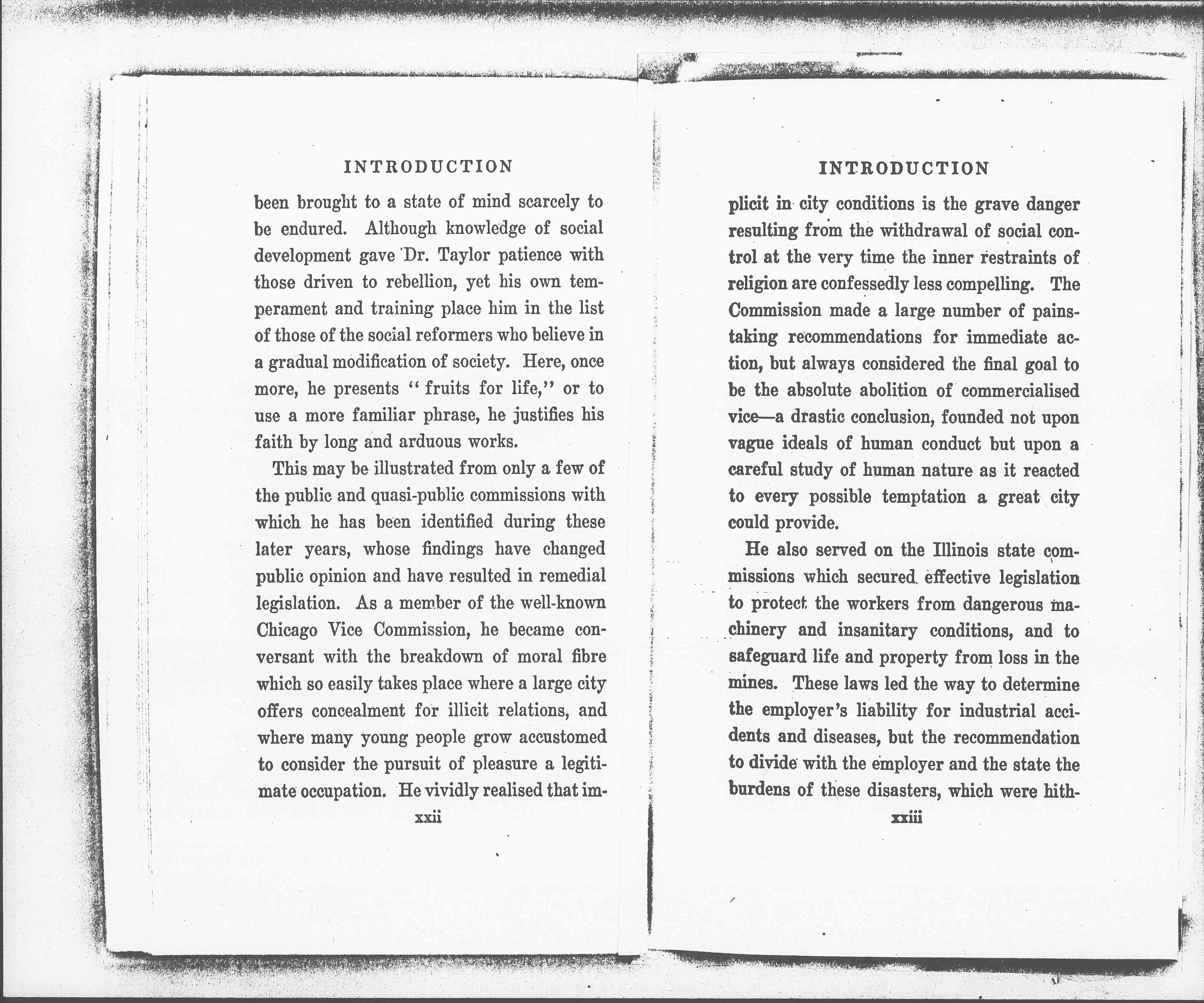 This may be illustrated from only a few of the public and quasi-public commissions with which he has been identified during these later years, whose findings have changed public opinion and have resulted in remedial legislation. As a member of the well-known Chicago Vice Commission, he became conversant with the breakdown of moral fiber which so easily takes place where a large city offers concealment for illicit relations, and where many young people grow accustomed to consider the pursuit of pleasure a legitimate occupation. He vividly realized that [page 13] implicit in city conditions is the grave danger resulting from the withdrawal of social control at the very time the inner restraints of religion are confessedly less compelling. The Commission made a large number of painstaking recommendations for immediate action, but always considered the final goal to be the absolute abolition of commercialized vice -- a drastic conclusion, founded not upon vague ideals of human conduct but upon a careful study of human nature as it reacted to every possible temptation a great city could provide.