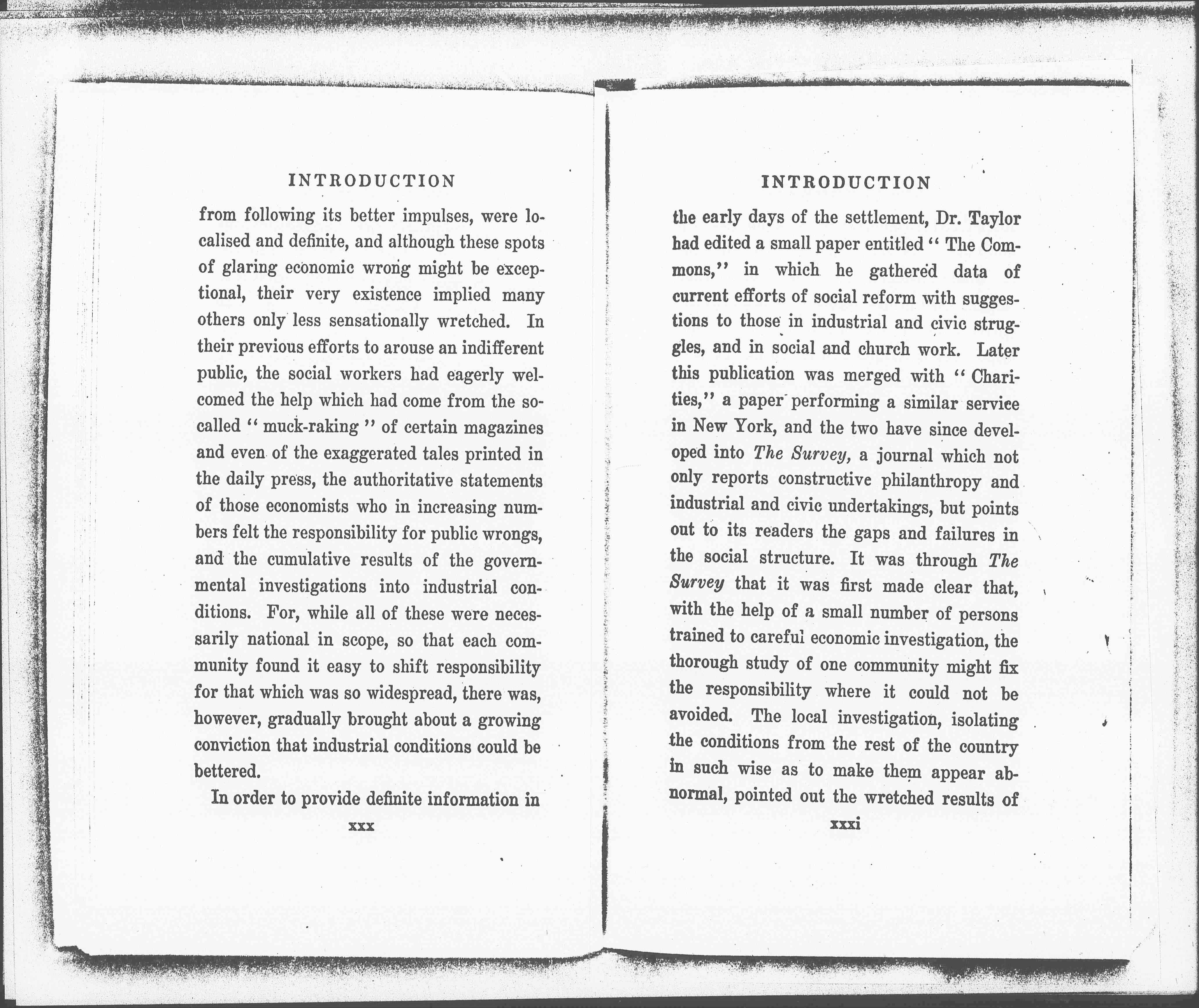 In order to provide definite information in [page 21] the early days of the settlement, Dr. Taylor had edited a small paper entitled "The Commons," in which he gathered data of current efforts of social reform with suggestions to those in industrial and civic struggles, and in social and church work. Later this publication was merged with "Charities," a paper performing a similar service in New York, and the two have since developed into The Survey, a journal which not only reports constructive philanthropy and industrial and civic undertakings, but points out to its readers the gaps and failures in the social structure. It was through The Survey that it was first made clear that, with the help of a small number of persons trained to careful economic investigation, the thorough study of one community might fix the responsibility where it could not be avoided. The local investigation, isolating the conditions from the rest of the country in such wise as to make them appear abnormal, pointed out the wretched results of [page 22] such conditions in the community itself. The lack of protection against industrial accidents in a huge steel plant had meant injuring so many men among the [employees] during the year; the insanitary housing in a given city ward had caused an abnormally high death-rate among the babies of that ward, and many another conclusion from which it was difficult to escape. When such investigation was accompanied by a picture of normal industrial conditions, vividly portrayed as they existed elsewhere, and was followed by an appeal to civic patriotism, in many instances an enthusiasm for better things was evoked and even a spiritual unrest.