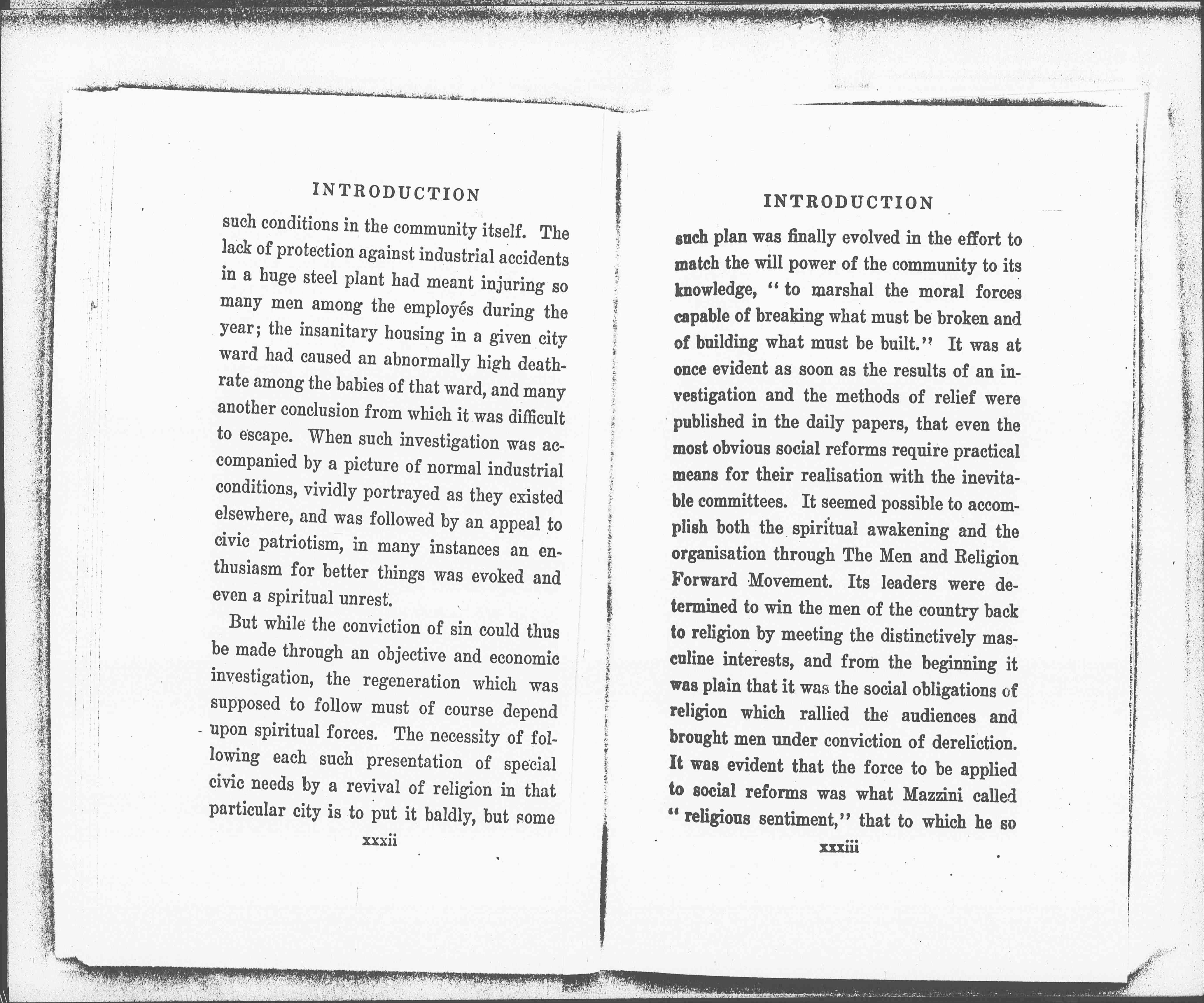 But while the conviction of sin could thus be made through an objective and economic investigation, the regeneration which was supposed to follow must of course depend upon spiritual forces. The necessity of following each such presentation of special civic needs by a revival of religion in that particular city is to put it baldly, but some [page 23] such plan was finally evolved in the effort to match the will power of the community to its knowledge, "to marshal the moral forces capable of breaking what must be broken and of building what must be built." It was at once evident as soon as the results of an investigation and the methods of relief were published in the daily papers, that even the most obvious social reforms require practical means for their realization with the inevitable committees. It seemed possible to accomplish both the spiritual awakening and the organization through The Men and Religion Forward Movement. Its leaders were determined to win the men of the country back to religion by meeting the distinctively masculine interests, and from the beginning it was plain that it was the social obligations of religion which rallied the audiences and brought men under conviction of dereliction. It was evident that the force to be applied to social reforms was what Mazzini called "religious sentiment," that to which he so [page 24] confidently appealed for the remaking of Italy; "from it," he declared, "flow strength and constancy in the struggle for great principles, indifference to danger, noble resignation in persecution." Of course such an attempt to connect religious enthusiasm with civic and economic needs implied the full co-operation of the clergy, and that there was a generous response in so many cities indicated perhaps how ready they were to meet the challenge.