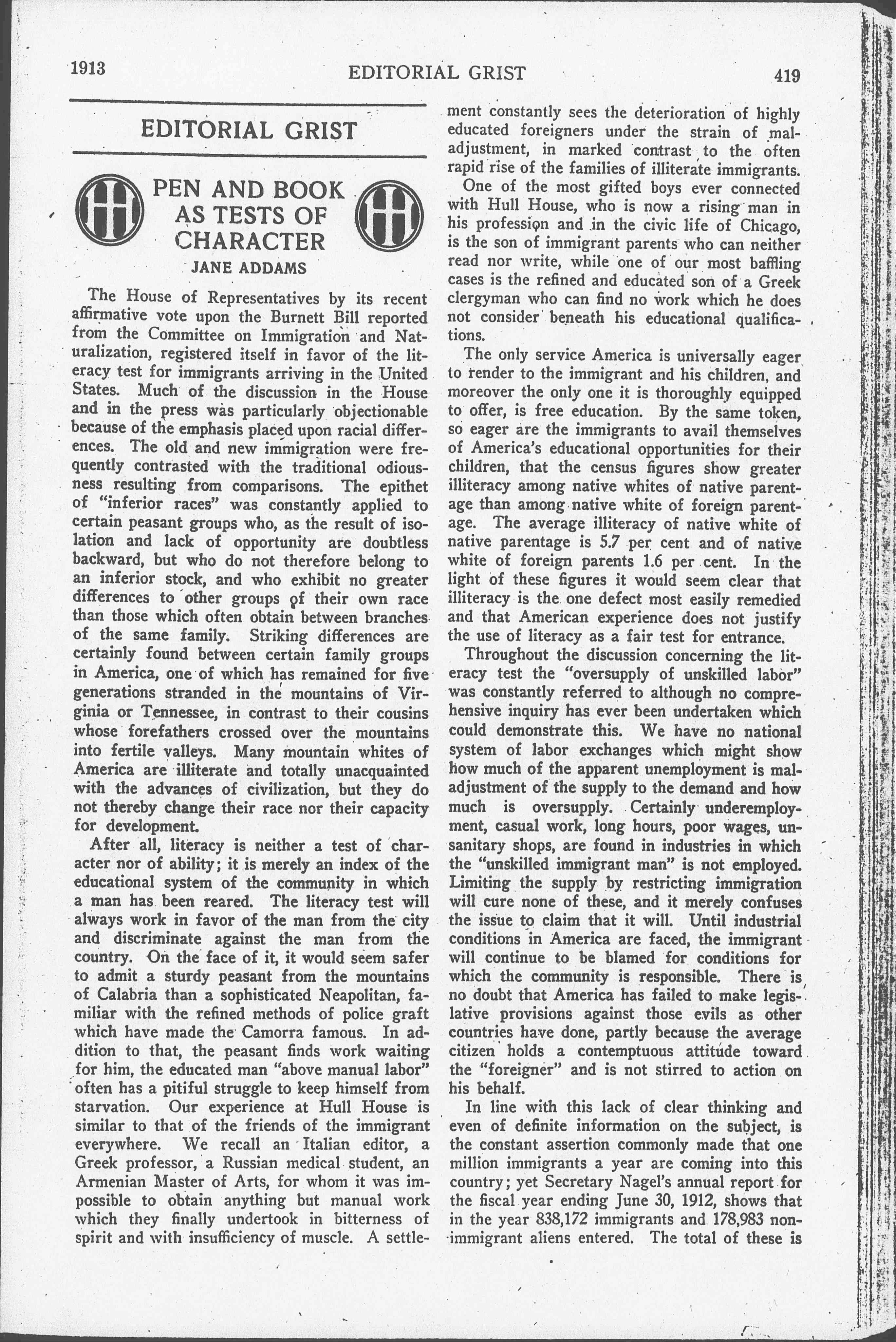 The only service America is universally eager to render to the immigrant and his children, and moreover the only one it is thoroughly equipped to offer, is free education. By the same token, so eager are the immigrants to avail themselves of America's educational opportunities for their children, that the census figures show greater illiteracy among native whites of native parentage than among native white of foreign parentage. The average illiteracy of native white of native parentage is 5.7 [percent] and of native white of foreign parents 1.6 [percent]. In the light of these figures it would seem clear that illiteracy is the one defect most easily remedied and that American experience does not justify the use of literacy as a fair test for entrance.