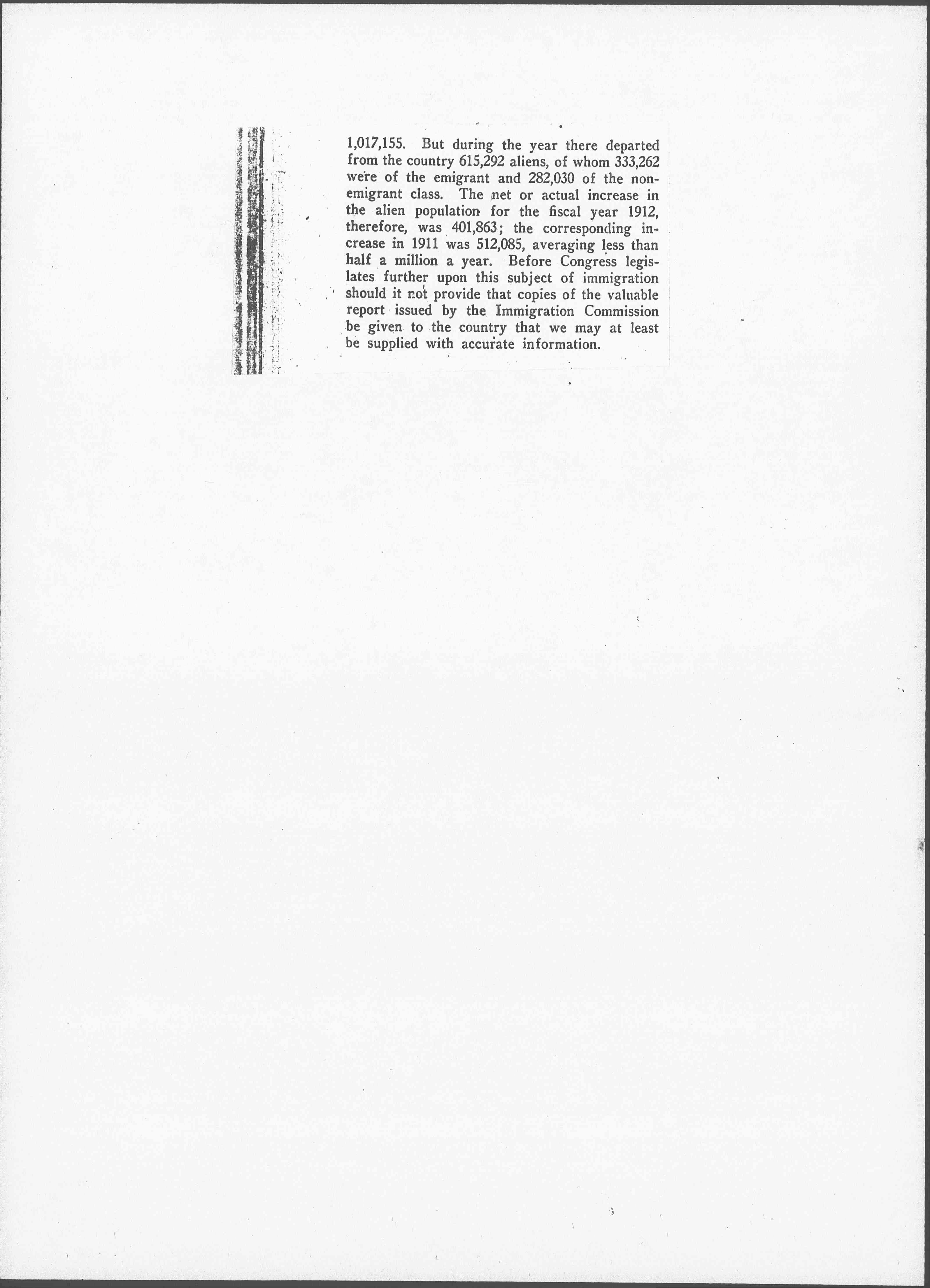 In line with this lack of clear thinking and even of definite information on the subject, is the constant assertion commonly made that one million immigrants a year are coming into this country; yet Secretary Nagel's annual report for the fiscal year ending June 30, 1912, shows that in the year 838,172 immigrants and 178,983 non-immigrant aliens entered. The total of these is [page 2] 1,017,155. But during the year there departed from the country 615,292 aliens, of whom 333,262 were of the emigrant and 282,030 of the non-emigrant class. The net or actual increase in the alien population for the fiscal year 1912, therefore, was 401,863; the corresponding increase in 1911 was 512,085, averaging less than half a million a year. Before Congress legislates further upon this subject of immigration should it not provide that copies of the valuable report issued by the Immigration Commission be given to the country that we may at least be supplied with accurate information.