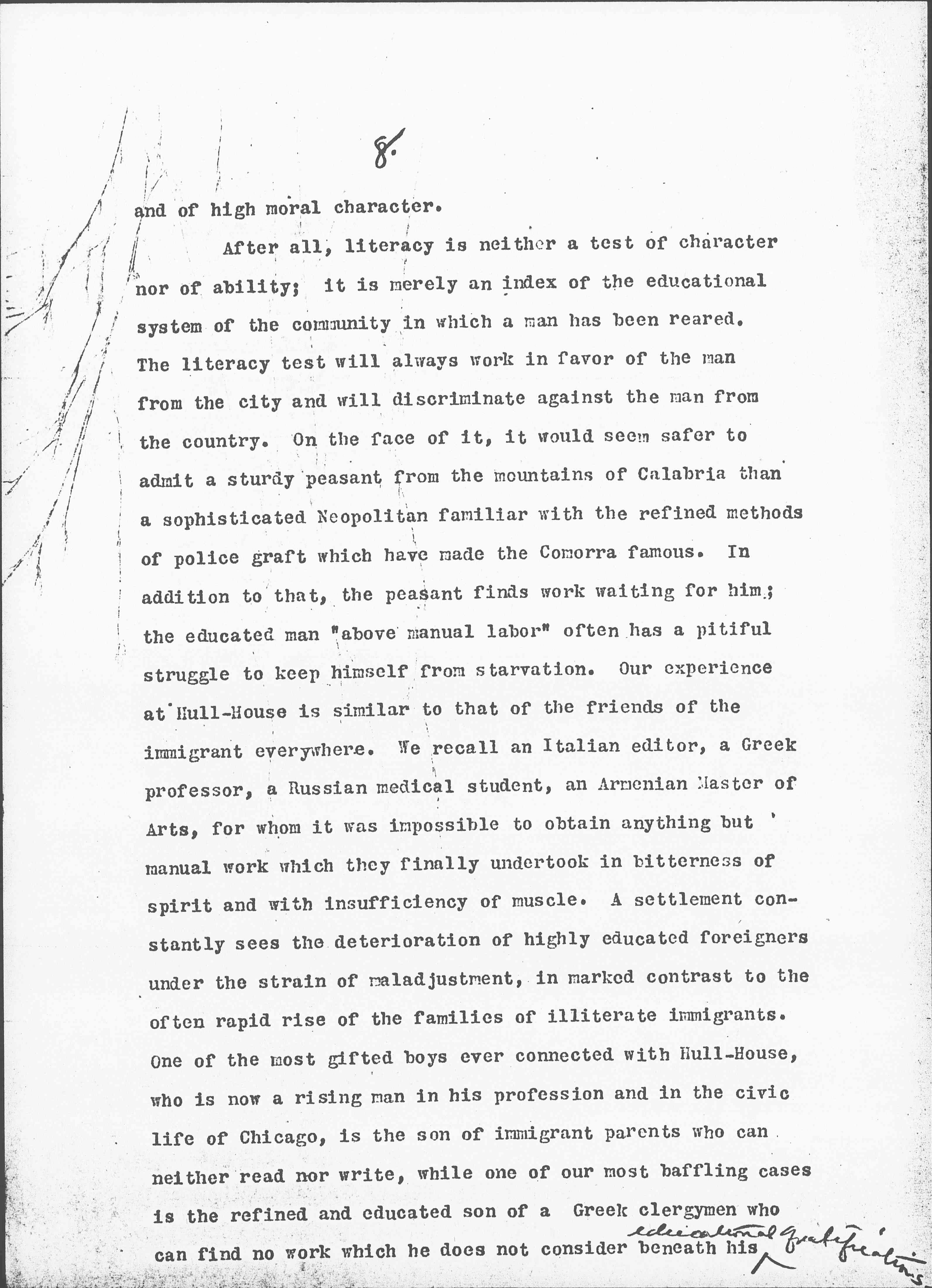 After all, literacy is neither a test of character nor of ability; it is merely an index of the educational system of the community in which a man has been reared. The literacy test will always work in favor of the man from the city and will discriminate against the man from the country. On the face of it, it would seem safer to admit a sturdy peasant from the mountains of Calabria than a sophisticated [Neapolitan] familiar with the refined methods of police graft which have made the [Camorra] famous. In addition to that, the peasant finds work waiting for him; the educated man "above manual labor" often has a pitiful struggle to keep himself from starvation. Our experience at Hull-House is similar to that of the friends of the immigrant everywhere. We recall an Italian editor, a Greek professor, a Russian medical student, an Armenian Master of Arts, for whom it was impossible to obtain anything but manual work which they finally undertook in bitterness of spirit and with insufficiency of muscle. A settlement constantly sees the deterioration of highly educated foreigners under strain of maladjustment, in marked contrast to the often rapid rise of the families of illiterate immigrants. One of the most gifted boys ever connected with Hull-House, who is now a rising man in his profession and in the civic life of Chicago, is the son of immigrant parents who can neither read nor write, while one of our most baffling cases is the refined and educated son of a Greek [clergyman] who can find no work which he does not consider beneath his <educational qualifications.> [page 9]