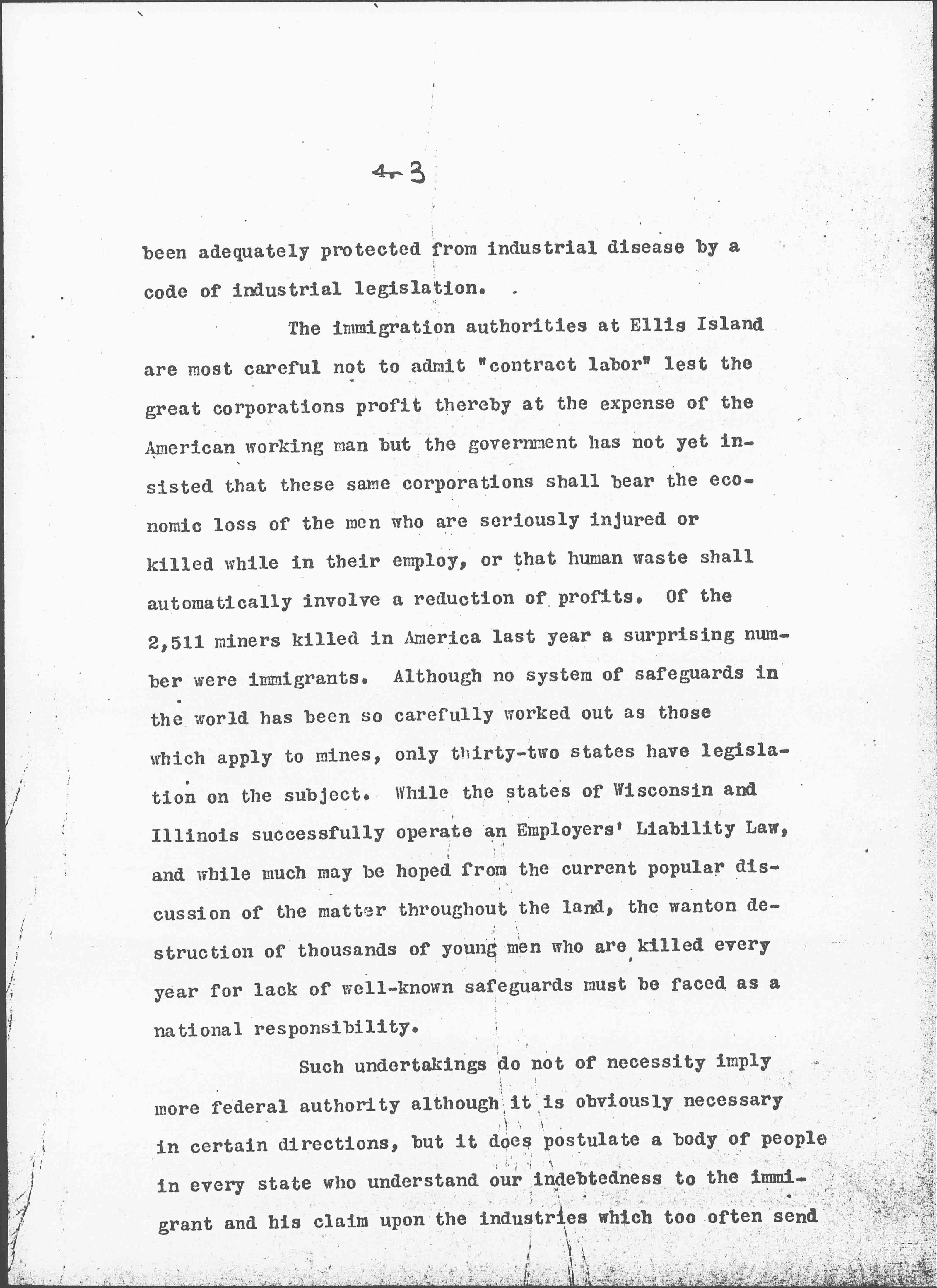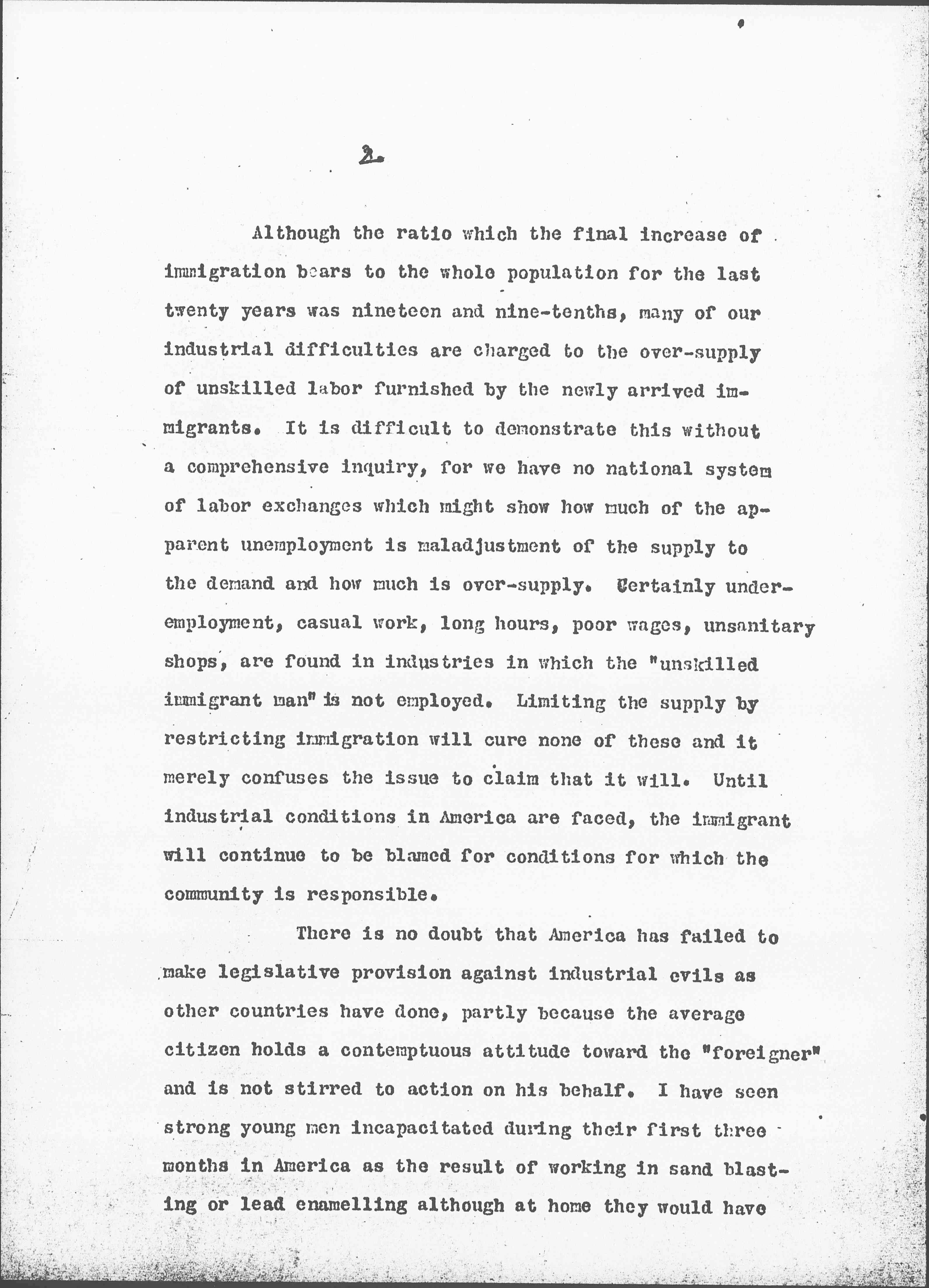 There is no doubt that America has failed to make legislative provision against industrial evils as other countries have done, partly because the average citizen holds a contemptuous attitude toward the "foreigner" and is not stirred to action on his behalf. I have seen strong young men incapacitated during their first three months in America as the result of working in sand blasting or lead [enameling] although at home they would have [page 3] been adequately protected from industrial disease by a code of industrial legislation.