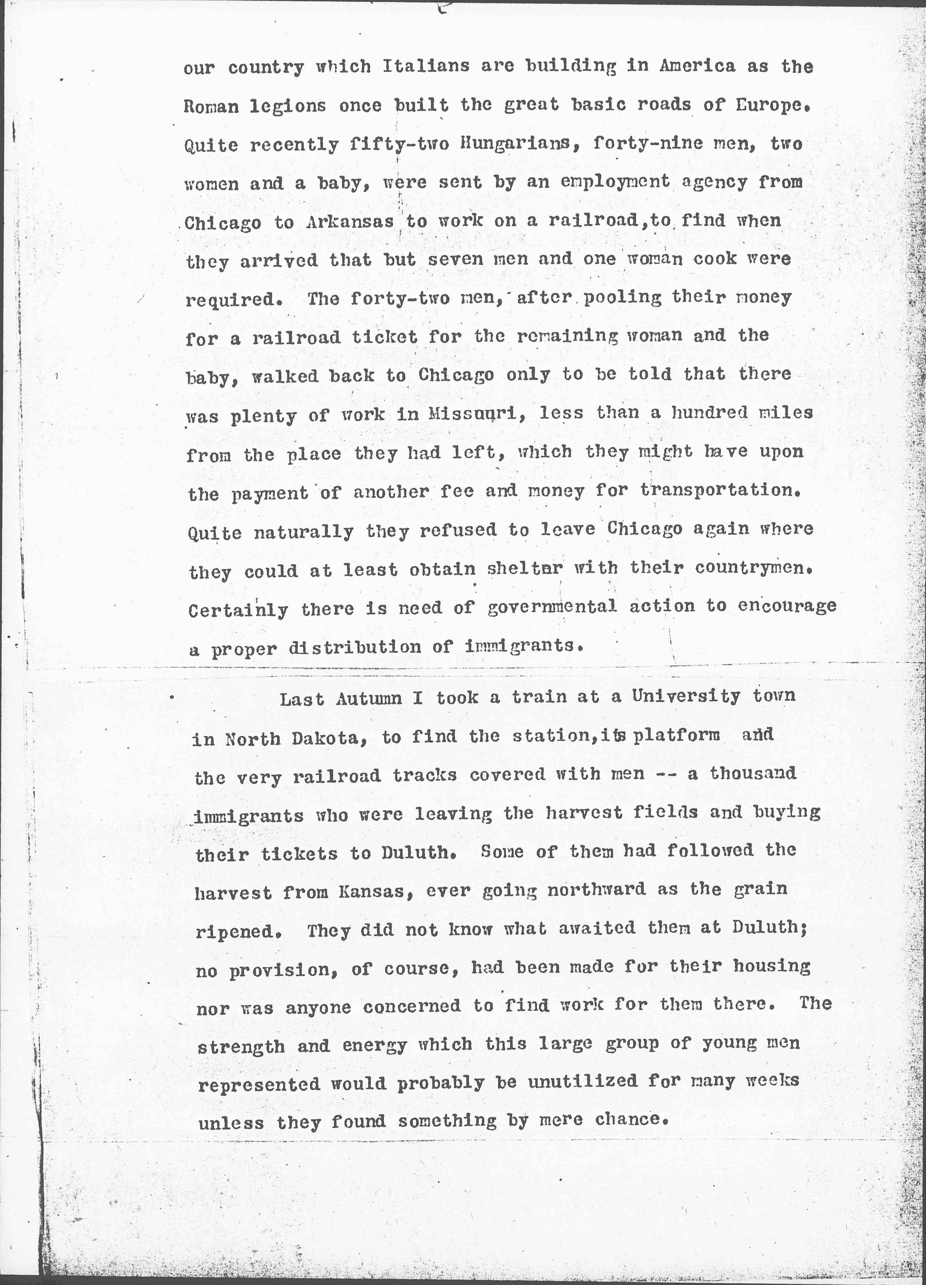 Our Federal government, so quick to reject the unfit immigrant at the point of entry, has no machinery for directing the fit into localities where steady labor is in demand and where agricultural skill is sorely needed. At Hull-House I have known immigrants massed in tenement houses, twenty-four men in a room ten by fourteen, who were idle and helpless for many months although Chicago is a great labor market whence thousands of men are annually sent out in groups to work upon the railroads of [page 6] our country which Italians are building in America as the Roman legions once built the great basic roads of Europe. Quite recently fifty-two Hungarians, forty-nine men, two women and a baby, were sent by an employment agency from Chicago to Arkansas to work on a railroad, to find when they arrived that but seven men and one woman cook were required. The forty-two men, after pooling their money for a railroad ticket for the remaining woman and the baby, walked back to Chicago only to be told that there was plenty of work in Missouri, less than a hundred miles from the place they had left, which they might have upon the payment of another fee and money for transportation. Quite naturally they refused to leave Chicago again where they could at least obtain shelter with their countrymen. Certainly there is need of governmental action to encourage a proper distribution of immigrants.