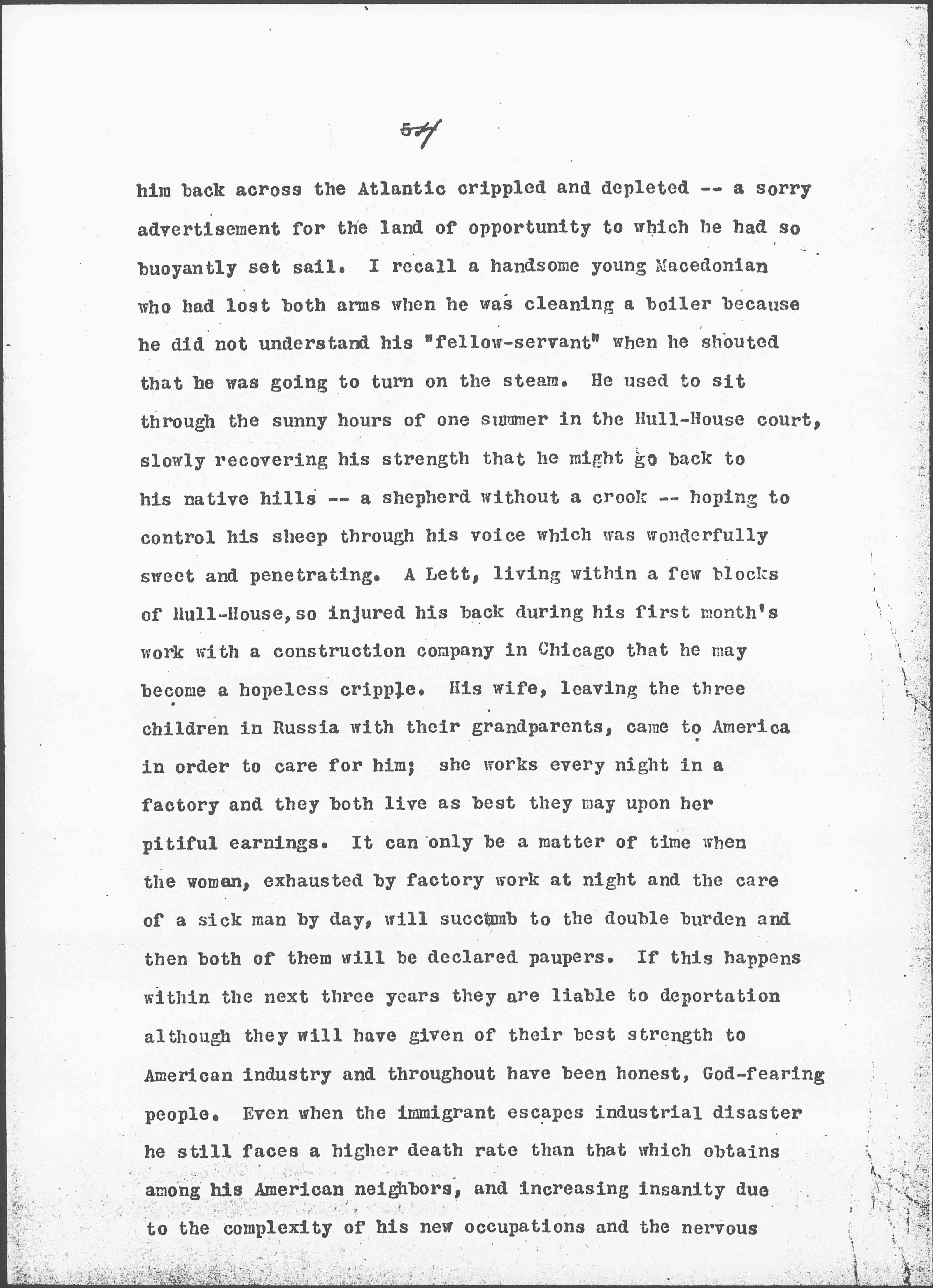 Such undertakings do not of necessity imply more federal authority although it is obviously necessary in certain directions, but it does postulate a body of people in every state who understand our indebtedness to the immigrant and his claim upon the industries which too often send [page 4] him back across the Atlantic crippled and depleted -- a sorry advertisement for the land of opportunity to which he had so buoyantly set sail. I recall a handsome young Macedonian who had lost both arms when he was cleaning a boiler because he did not understand his "fellow-servant" when he shouted that he was going to turn on the steam. He used to sit through the sunny hours of one summer in the Hull-House court, slowly recovering his strength that he might go back to his native hills -- a shepherd without a crook -- hoping to control his sheep through his voice which was wonderfully sweet and penetrating. A Lett, living within a few blocks of Hull-House, so injured his back during his first month's work with a construction company in Chicago that he may become a hopeless cripple. His wife, leaving the three children in Russia with their grandparents, came to America in order to care for him; she works every night in a factory and they both live as best they may upon her pitiful earnings. It can only be a matter of time when the woman, exhausted by factory work at night and the care of a sick man by day, will succumb to the double burden and then both of them will be declared paupers. If this happens within the next three years they are liable to deportation although they will have given of their best strength to American industry and throughout have been honest, God-fearing people. Even when the immigrant escapes industrial disaster he still faces a higher death rate than that which obtains among his American neighbors, and increasing insanity due to the complexity of his new occupations and the nervous [page 5] strain of maladjustment, added to the fact that his cheap food is too often filled with dubious preservatives and the imitation of his native drinks is drugged by poisonous stimulants. "Things always happen to a greenhorn" is a phrase often heard in our neighborhood.