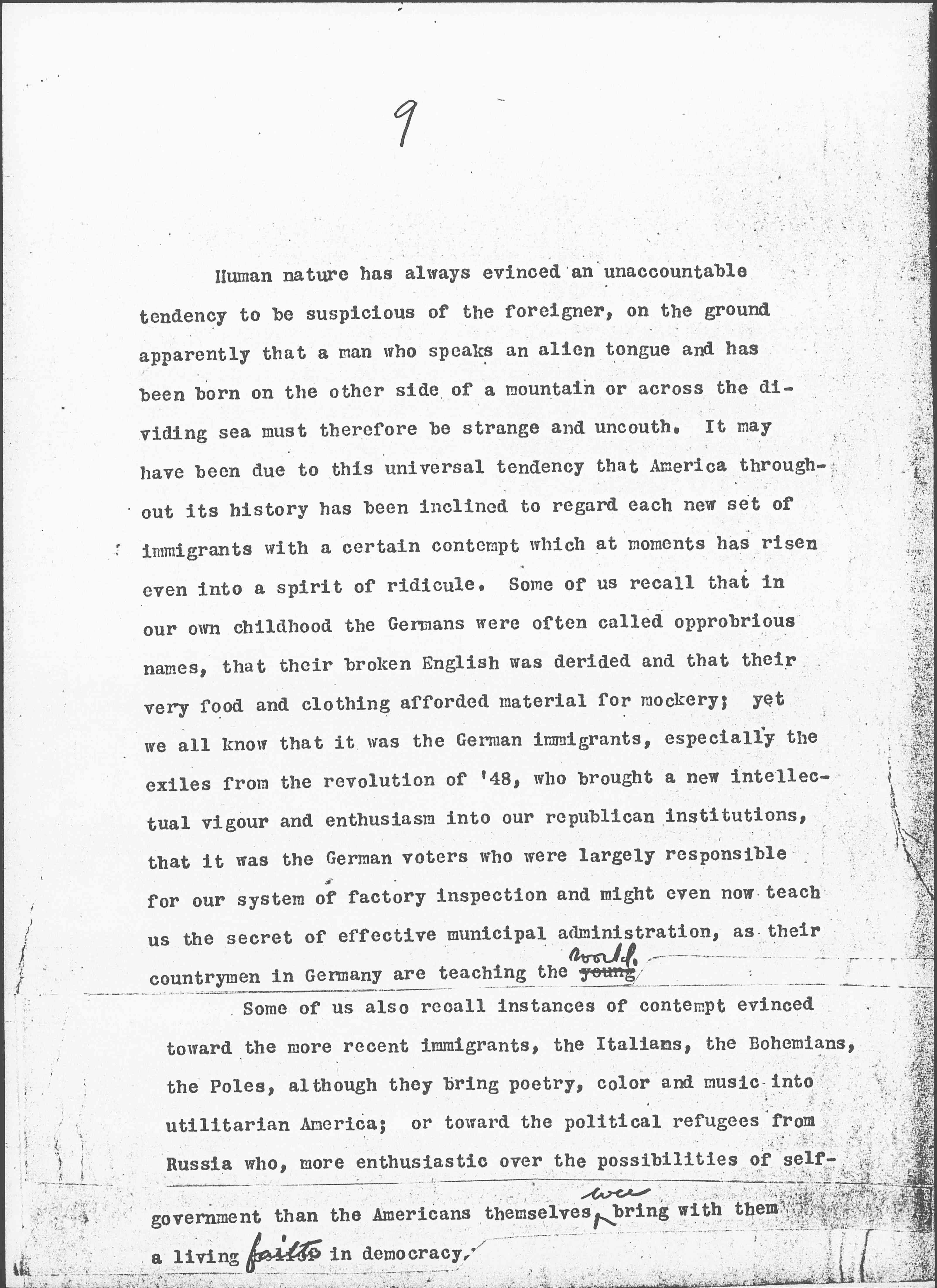 Human nature has always evinced an unaccountable tendency to be suspicious of the foreigner, on the ground apparently that a man who speaks an alien tongue and has been born on the other side of a mountain or across the dividing sea must therefore be strange and uncouth. It may have been due to this universal tendency that America throughout its history has been inclined to regard each new set of immigrants with a certain contempt which at moments has risen even into a spirit of ridicule. Some of us recall that in our own childhood the Germans were often called opprobrious names, that their broken English was derided and that their very food and clothing afforded material for mockery; yet we all know that it was the German immigrants, especially the exiles from the revolution of '48, who brought a new intellectual [vigor] and enthusiasm into our republican institutions, that it was the German voters who were largely responsible for our system of factory inspection and might even now teach us the secret of effective municipal administration, as their countrymen in Germany are teaching the young <world.>