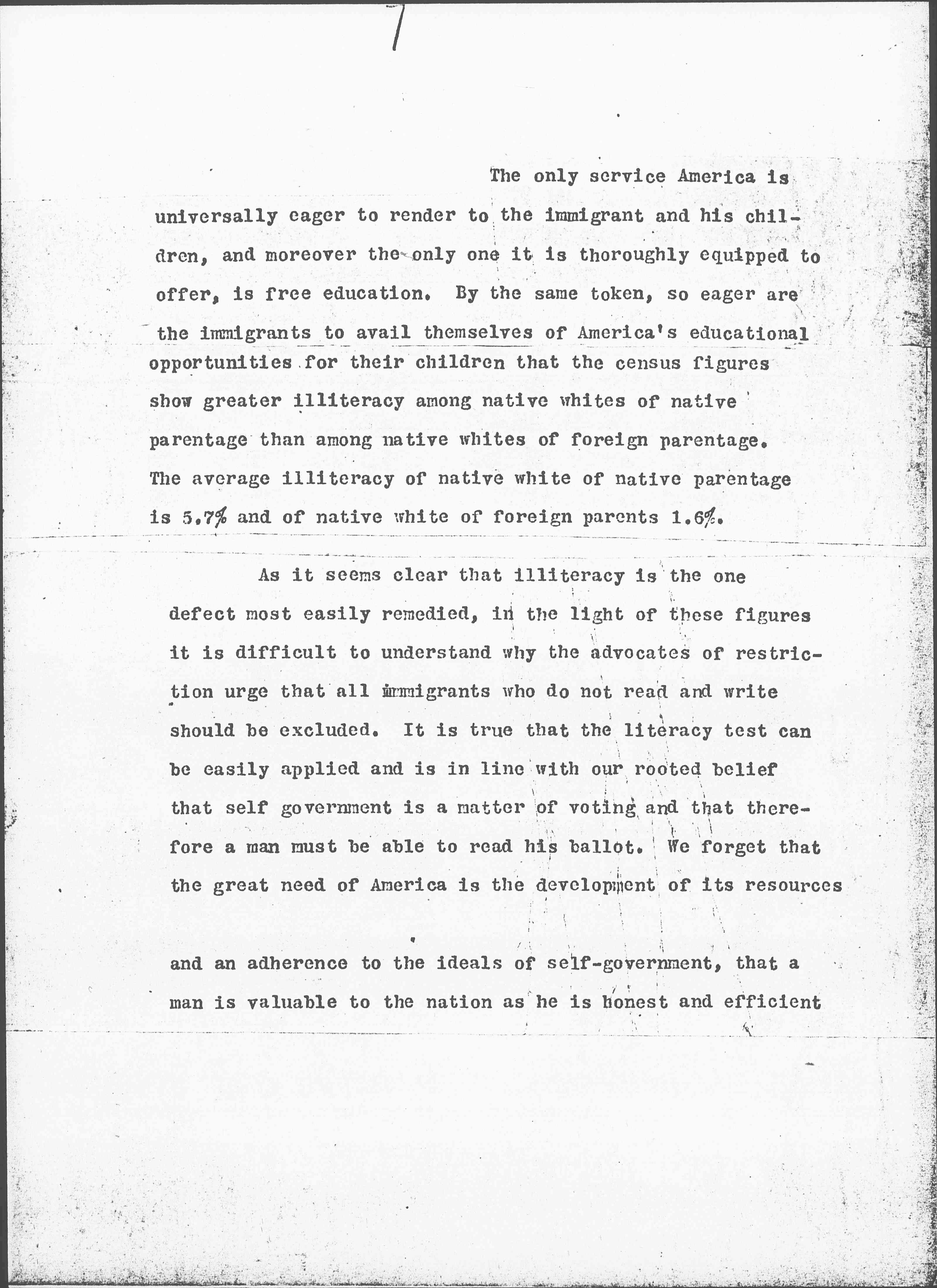 As it seems clear that illiteracy is the one defect most easily remedied, in the light of these figures it is difficult to understand why the advocates of restriction urge that all immigrants who do not read and write should be excluded. It is true that the literacy test can be easily applied and is in line with our rooted belief that self-government is a matter of voting and that therefore a man must be able to read his ballot. We forget that the great need of America is the development of its resources and an adherence to the ideals of self-government, that a man is valuable to the nation as he is honest and efficient [page 8] and of high moral character.