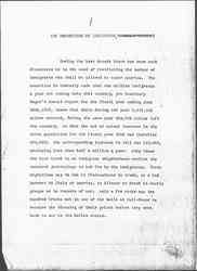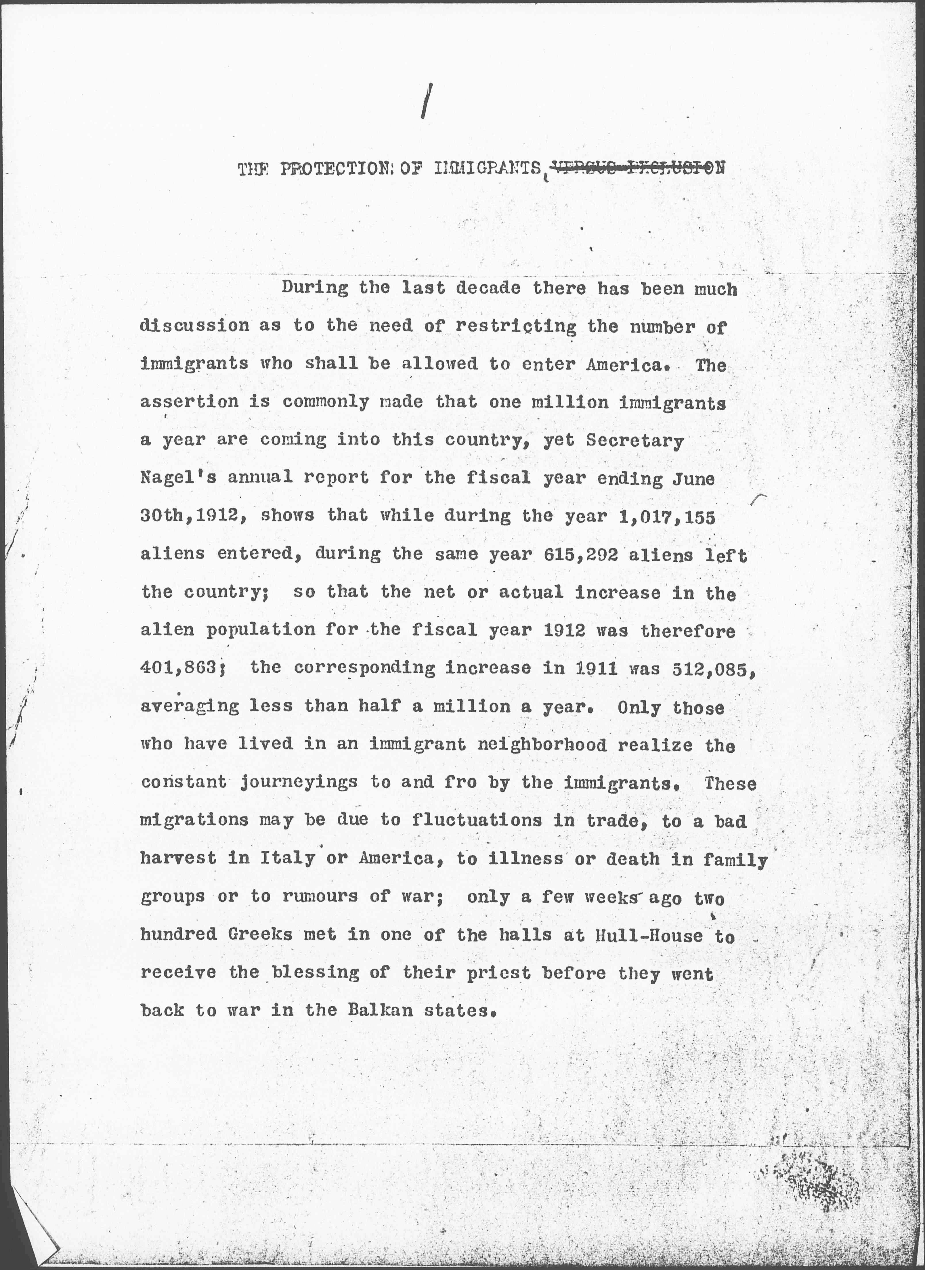 During the last decade there has been much discussion as to the need of restricting the number of immigrants who shall be allowed to enter America. The assertion is commonly made that one million immigrants a year are coming into this country, yet Secretary Nagel's annual report for the fiscal year ending June 30th, 1912, shows that while during the year 1,017,155 aliens entered, during the same year 615,292 aliens left the country; so that the net or actual increase in the alien population for the fiscal year 1912 was therefore 401,863; the corresponding increase in 1911 was 512,085, averaging less than half a million a year. Only those who have lived in an immigrant neighborhood realize the constant journeyings to and fro by the immigrants. These migrations may be due to fluctuations in trade, to a bad harvest in Italy or America, to illness or death in family groups or to [rumors] of war; only a few weeks ago two hundred Greeks met in one of the halls at Hull-House to receive the blessing of their priest before they went back to war in the Balkan states. [page 2]