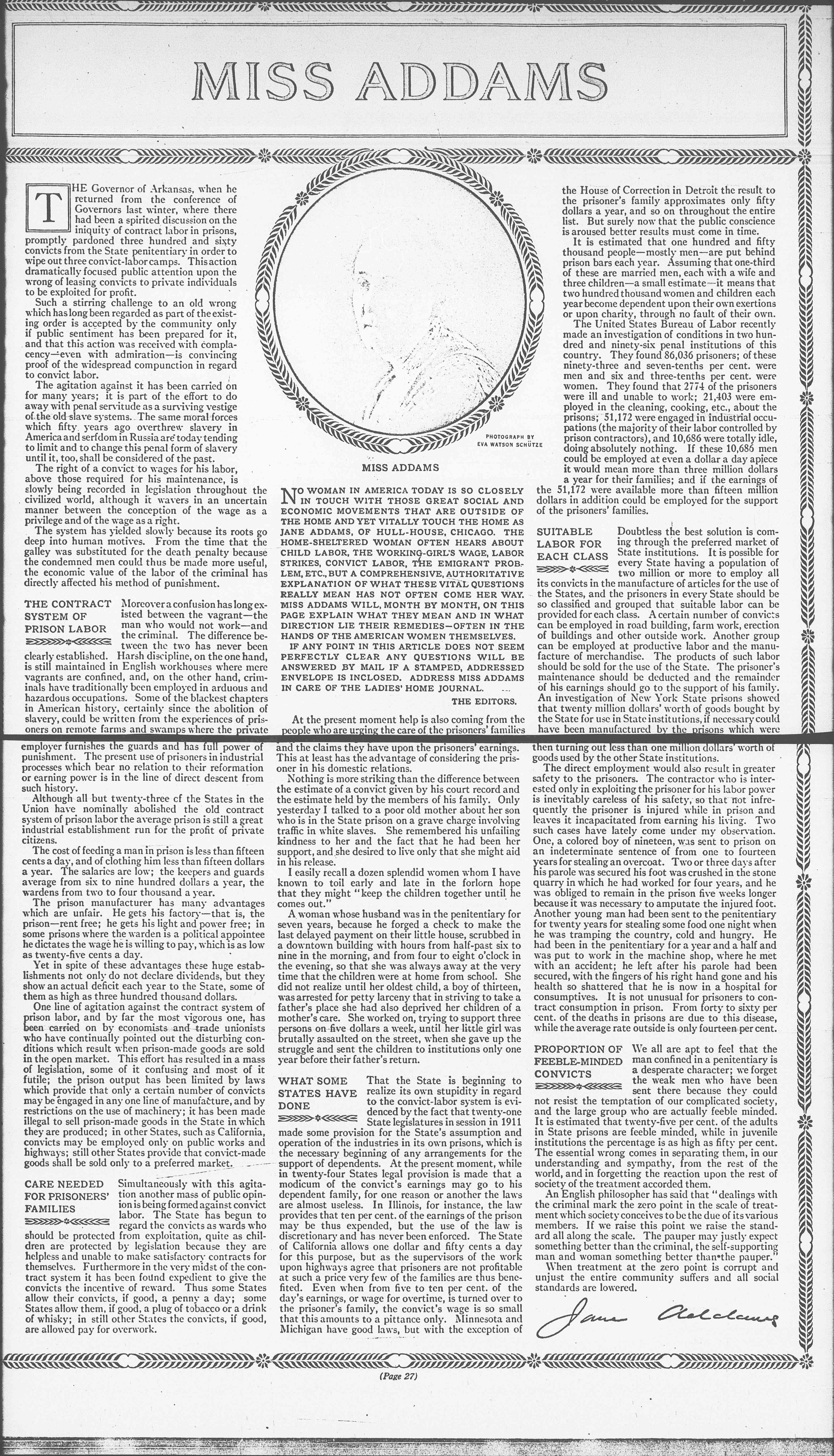 NO WOMAN IN AMERICA TODAY IS SO CLOSELY IN TOUCH WITH THOSE GREAT SOCIAL AND ECONOMIC MOVEMENTS THAT ARE OUTSIDE OF THE HOME AND YET VITALLY TOUCH THE HOME AS JANE ADDAMS, OF HULL-HOUSE, CHICAGO. THE HOME-SHELTERED WOMAN OFTEN HEARS ABOUT CHILD LABOR, THE WORKING-GIRL'S WAGE, LABOR STRIKES, CONVICT LABOR, THE EMIGRANT PROBLEM, ETC., BUT A COMPREHENSIVE, AUTHORITATIVE EXPLANATION OF WHAT THESE VITAL QUESTIONS REALLY MEAN HAS NOT OFTEN COME HER WAY. MISS ADDAMS WILL, MONTH BY MONTH, ON THIS PAGE EXPLAIN WHAT THEY MEAN AND IN WHAT DIRECTION LIE THEIR REMEDIES -- OFTEN IN THE HANDS OF THE AMERICAN WOMEN THEMSELVES.