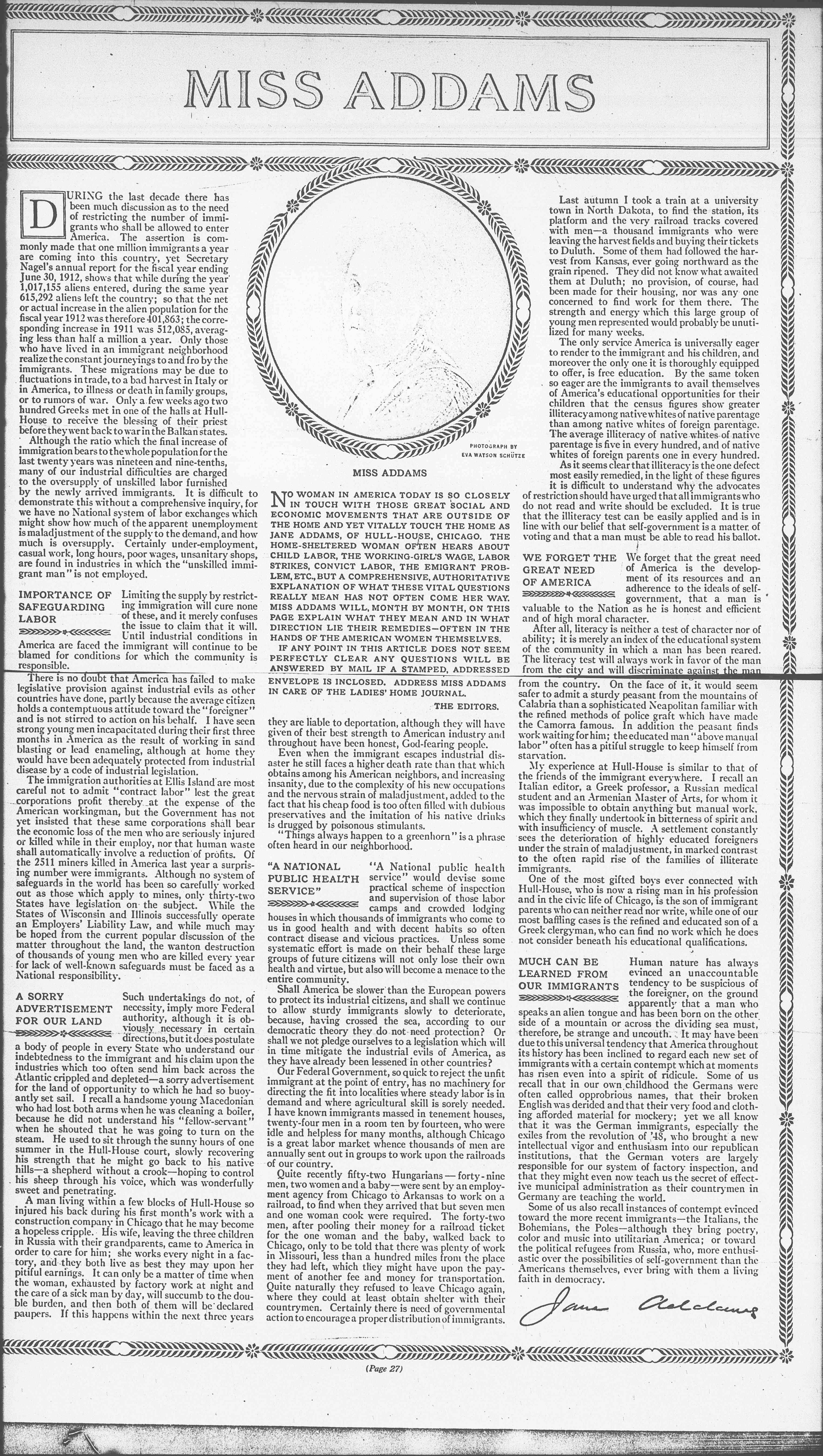 NO WOMAN IN AMERICA TODAY IS SO CLOSELY IN TOUCH WITH THOSE GREAT SOCIAL AND ECONOMIC MOVEMENTS THAT ARE OUTSIDE OF THE HOME AND YET VITALLY TOUCH THE HOME AS JANE ADDAMS, OF HULL-HOUSE, CHICAGO. THE HOME-SHELTERED WOMAN OFTEN HEARS ABOUT CHILD LABOR, THE WORKING-GIRL'S WAGE, LABOR STRIKES, CONVICT LABOR, THE EMIGRANT PROBLEM, ETC., BUT A COMPREHENSIVE, AUTHORITATIVE EXPLANATION OF WHAT THESE VITAL QUESTIONS REALLY MEAN HAS NOT OFTEN COME HER WAY. MISS ADDAMS WILL, MONTH BY MONTH, ON THIS PAGE EXPLAIN WHAT THEY MEAN AND IN WHAT DIRECTION LIE THEIR REMEDIES -- OFTEN IN THE HANDS OF THE AMERICAN WOMEN THEMSELVES.